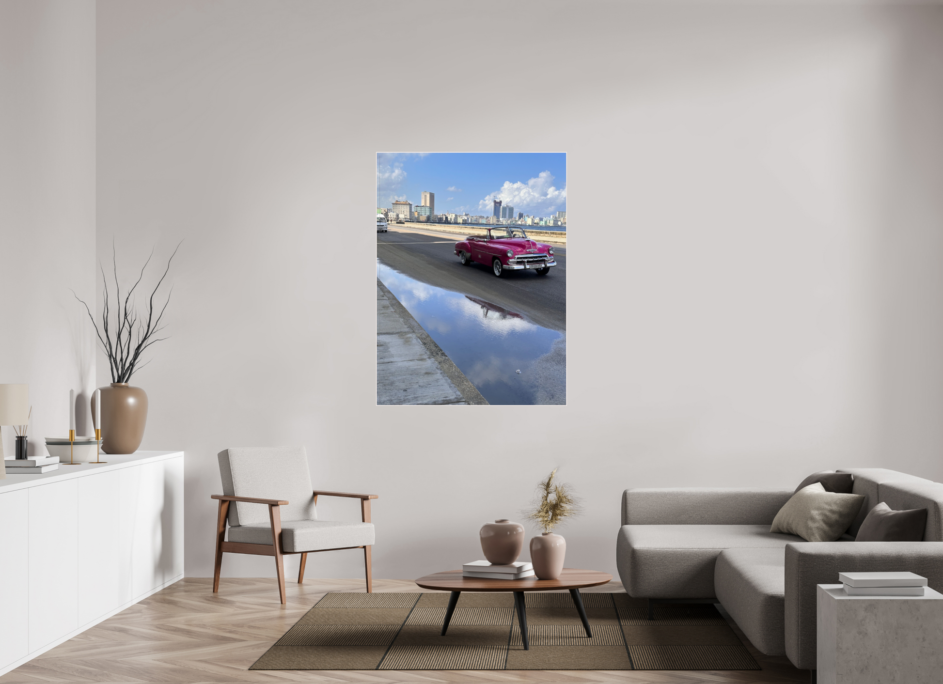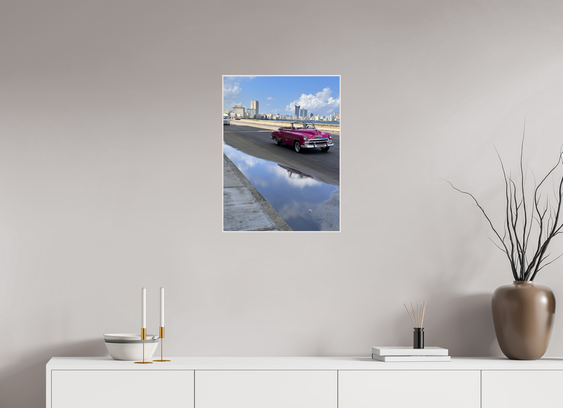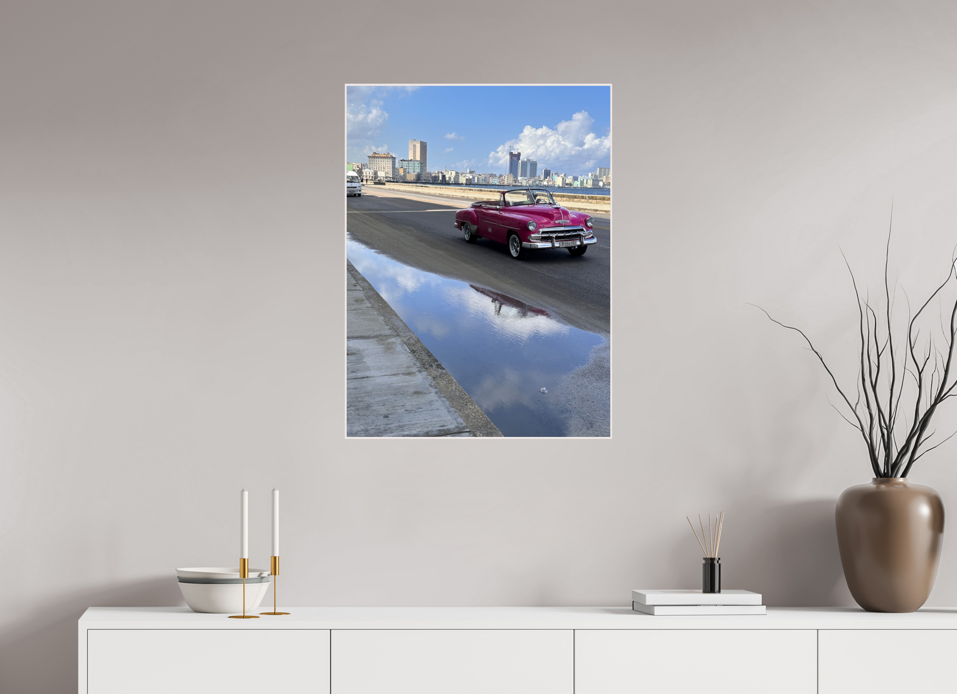 Showcasing a vintage car parked in front of a weathered, pastel-colored building, this snapshot embodies the essence of Havana's everyday life. The car's sleek design juxtaposed with the building's faded beauty creates a striking contrast, highlighting the city's unique blend of old and new. Bathed in soft, natural light, the scene adds a sense of warmth and tranquility.