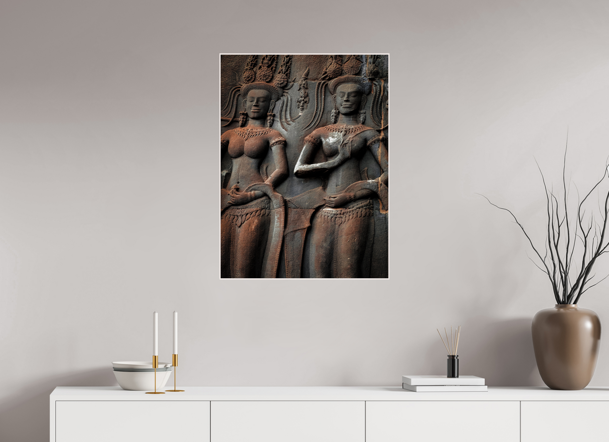 In the heart of Angkor, two stone figures stand in eternal devotion, their intricate carvings a testament to the artistry and craftsmanship of the Khmer people. The muted greys and browns of the weathered stone contrast beautifully with the vibrant greens of the encroaching foliage, creating a scene of timeless beauty. The soft light filtering through the jungle canopy adds a sense of tranquility and serenity, capturing the essence of Angkor's mystical allure. The figures' serene expressions and poised stances evoke a sense of reverence and awe. This image is a testament to the enduring legacy of the Khmer Empire, where history and nature intertwine. T