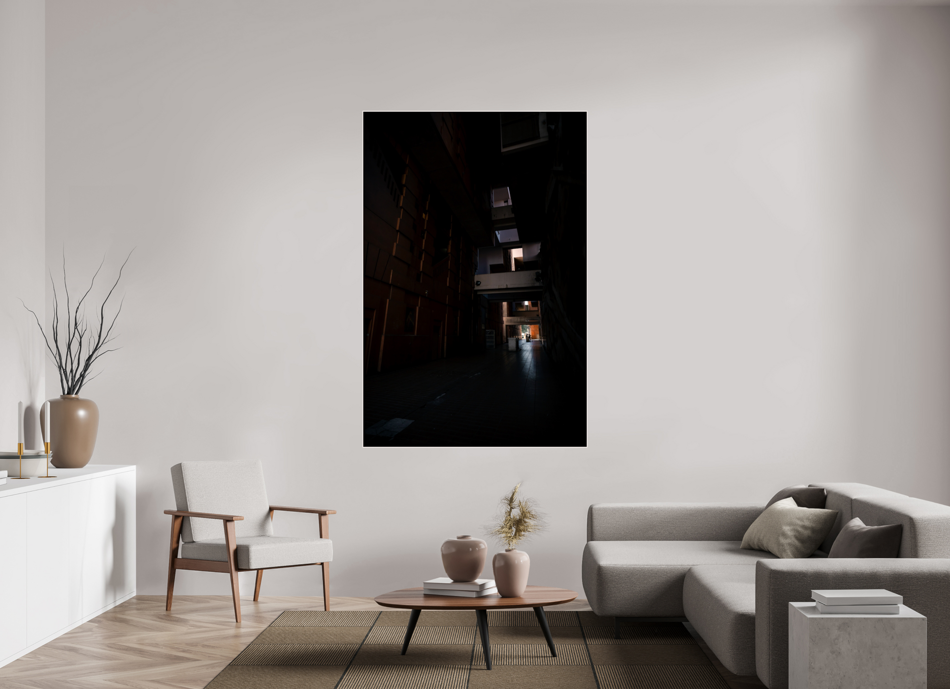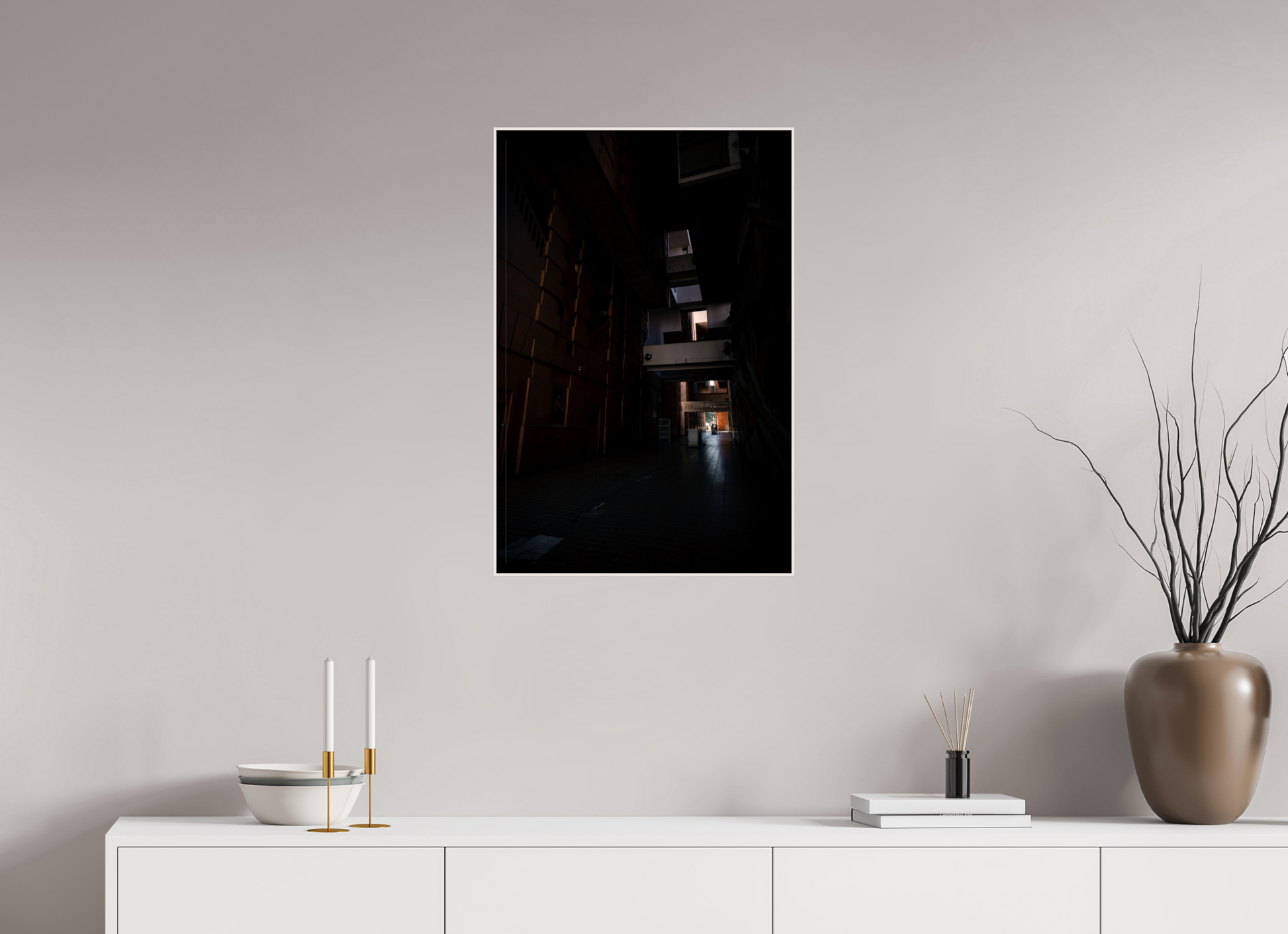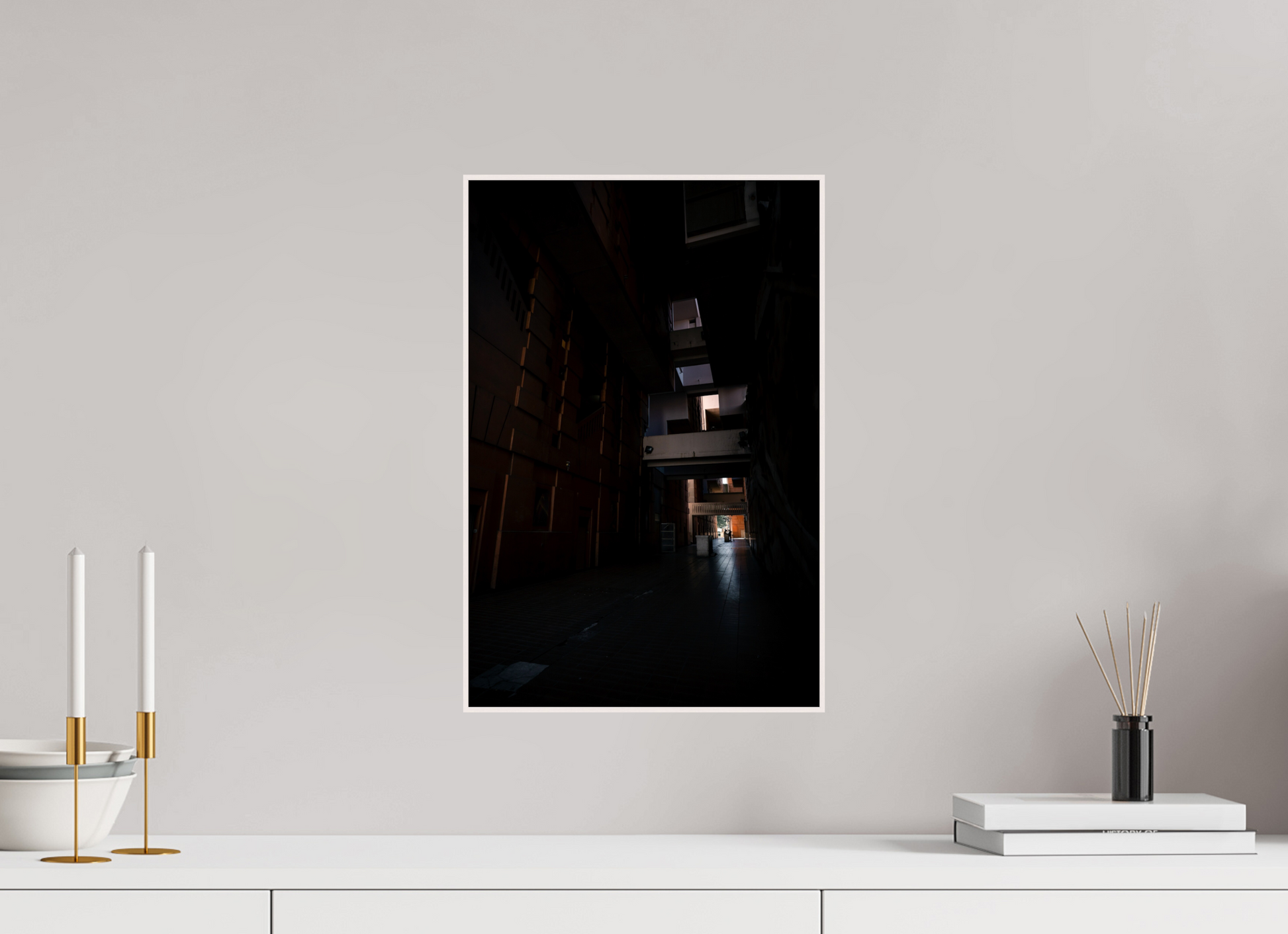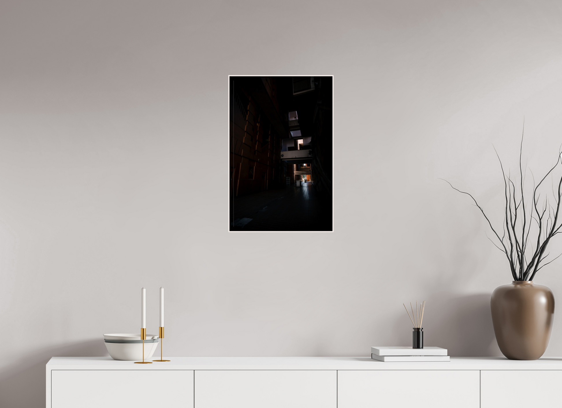 This image captures the dramatic interior perspective of the Espaces d'Abraxas, showcasing its architectural depth and geometric precision. The long corridor, illuminated by a single light source at the end, draws the viewer's eye towards the vanishing point, creating a sense of depth and mystery. The repetitive, angular forms of the ceiling and walls emphasize the building's modernist influences, while the interplay of light and shadow adds texture and dimension to the scene.