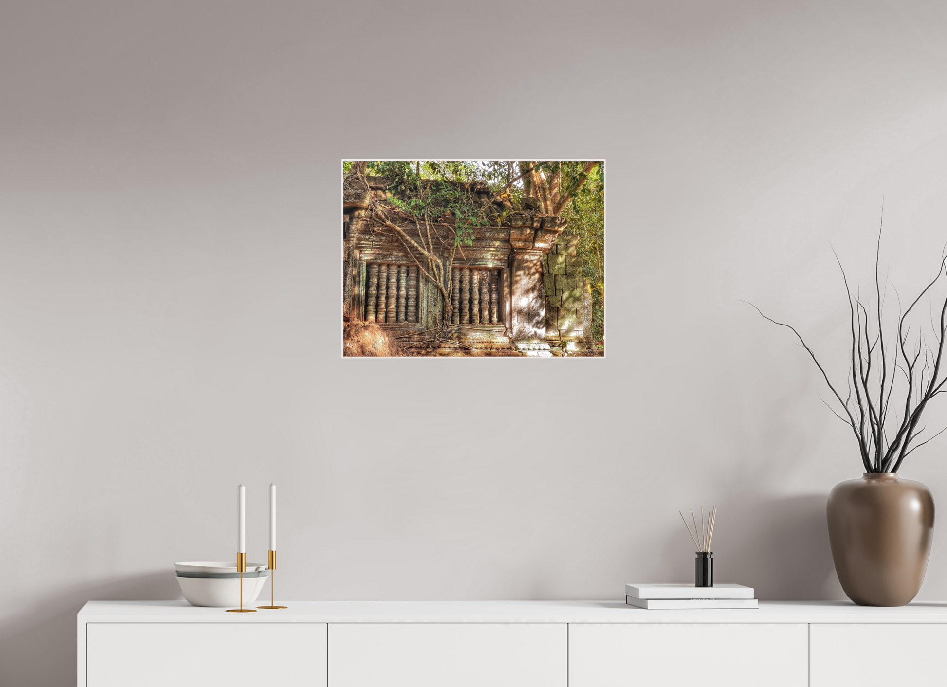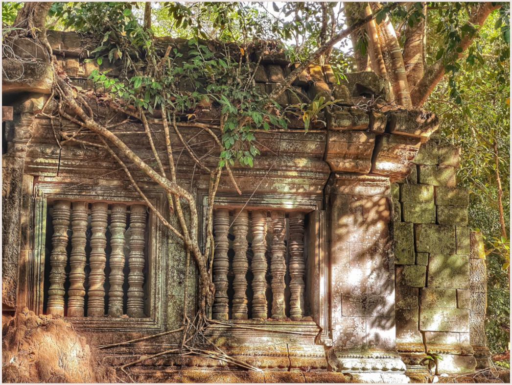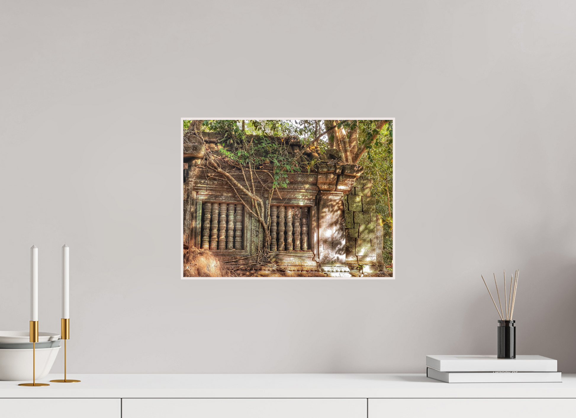 A stone window at Angkor is veiled by the lush greenery of the jungle, its intricate carvings partially obscured by the vibrant foliage. The contrast between the muted greys of the weathered stone and the vibrant greens of the encroaching plants creates a striking visual tableau. The soft light filtering through the jungle canopy casts dappled shadows, adding depth and texture to the scene. This image captures the enduring beauty of Angkor, where nature and history coexist in a delicate dance. The intricate details of the stonework evoke a sense of reverence and awe. Angkor, the heart of the Khmer Empire, is a sprawling complex of temples and monuments nestled in the dense jungles of Cambodia. Built between the 9th and 15th centuries, Angkor was once the center of a vast and powerful empire that dominated much of Southeast Asia. The temples of Angkor are adorned with intricate carvings and detailed reliefs, depicting scenes of myth and legend that offer a glimpse into the rich cultural heritage of the Khmer people. Over the centuries, the jungle slowly reclaimed the temples, their stone walls and towers enveloped by the relentless growth of nature. Despite the ravages of time and the devastation of war, Angkor remains a testament to the ingenuity and spirit of the Khmer people.