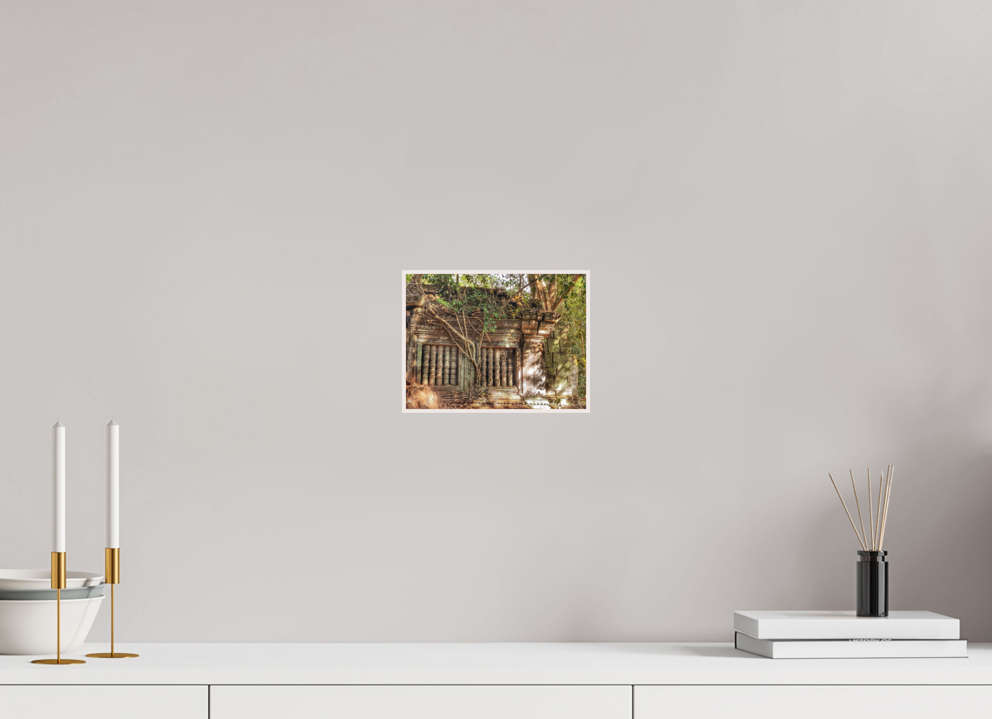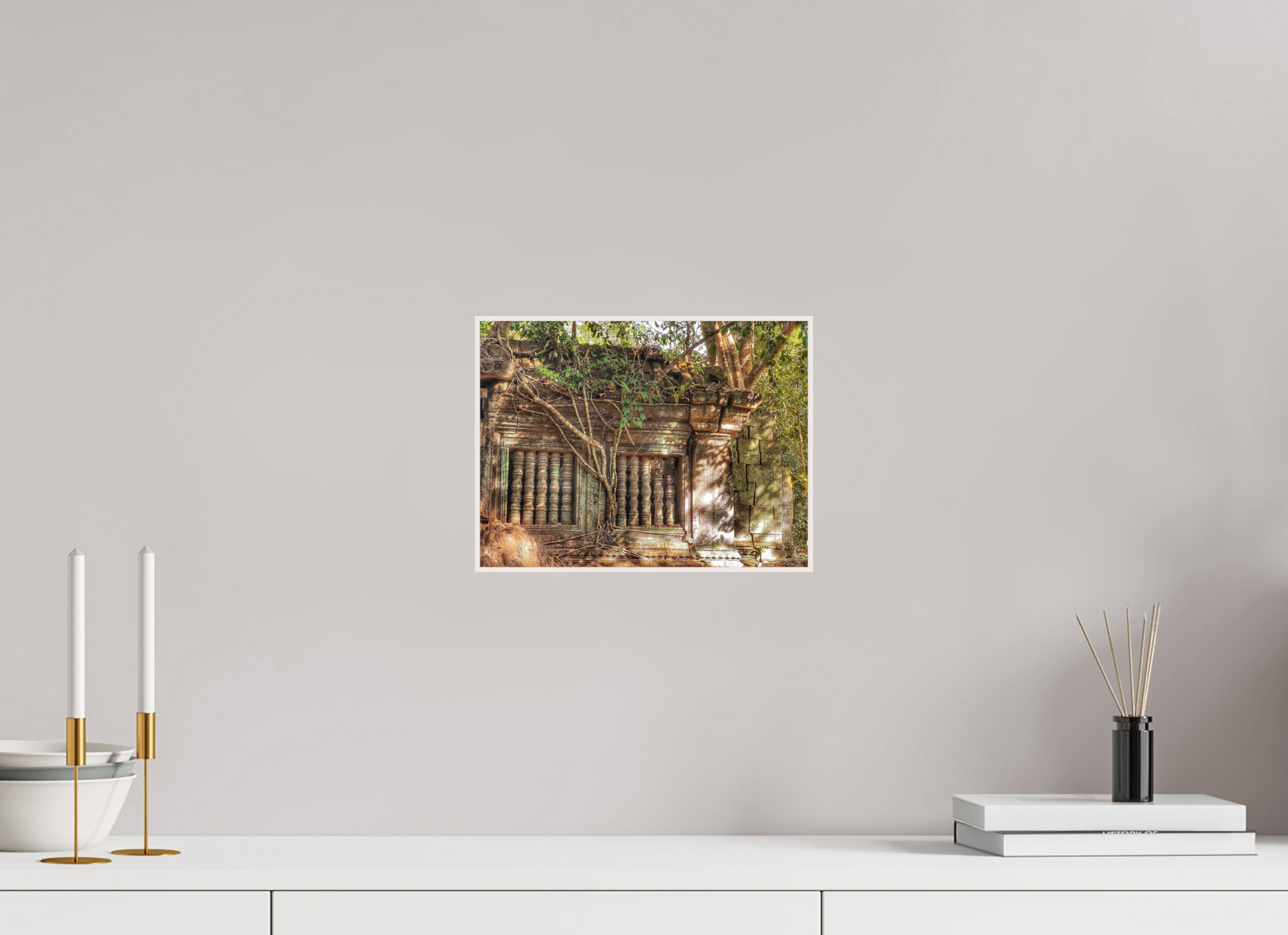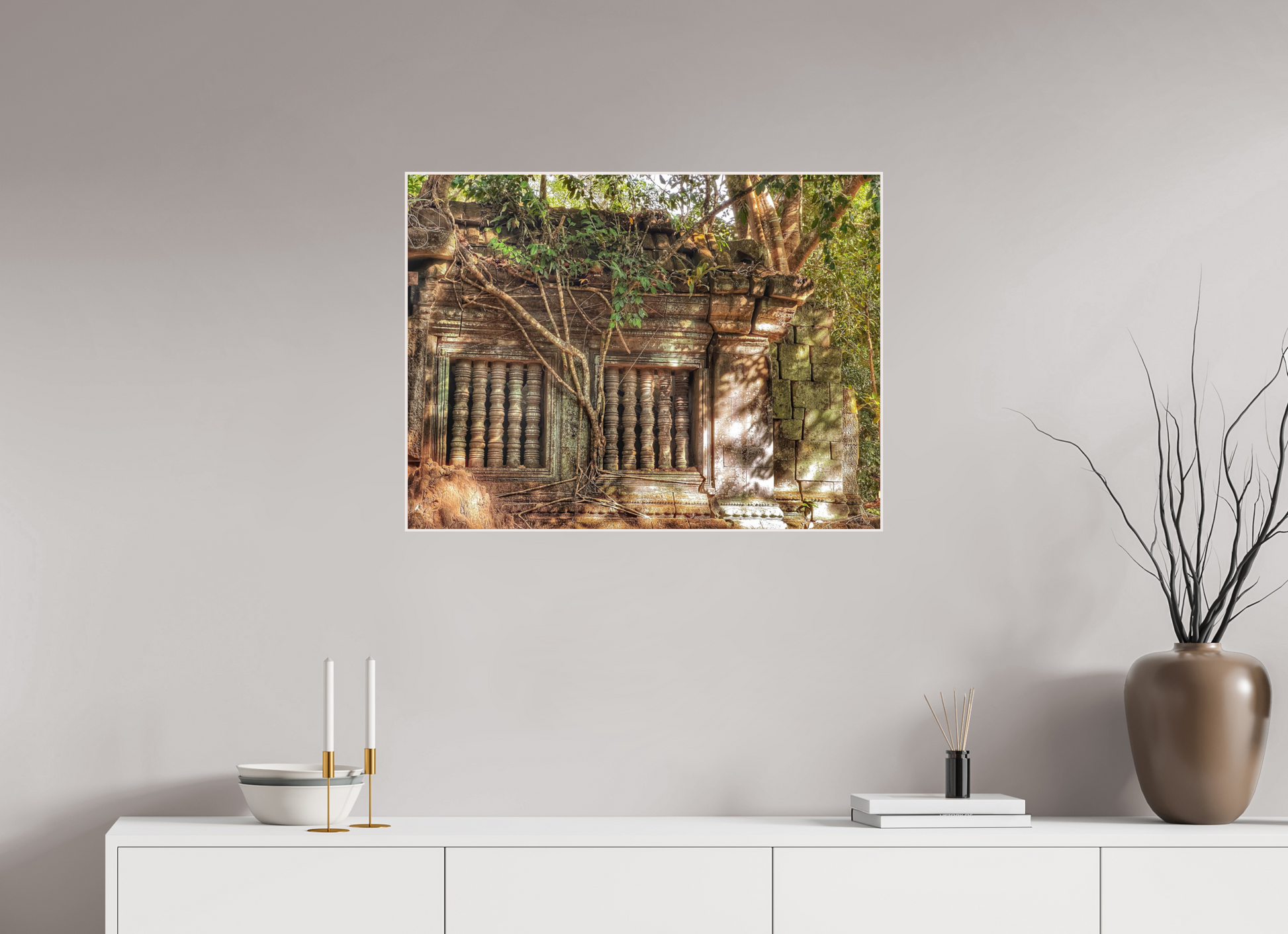 A stone window at Angkor is veiled by the lush greenery of the jungle, its intricate carvings partially obscured by the vibrant foliage. The contrast between the muted greys of the weathered stone and the vibrant greens of the encroaching plants creates a striking visual tableau. The soft light filtering through the jungle canopy casts dappled shadows, adding depth and texture to the scene. This image captures the enduring beauty of Angkor, where nature and history coexist in a delicate dance. The intricate details of the stonework evoke a sense of reverence and awe. Angkor, the heart of the Khmer Empire, is a sprawling complex of temples and monuments nestled in the dense jungles of Cambodia. Built between the 9th and 15th centuries, Angkor was once the center of a vast and powerful empire that dominated much of Southeast Asia. The temples of Angkor are adorned with intricate carvings and detailed reliefs, depicting scenes of myth and legend that offer a glimpse into the rich cultural heritage of the Khmer people. Over the centuries, the jungle slowly reclaimed the temples, their stone walls and towers enveloped by the relentless growth of nature. Despite the ravages of time and the devastation of war, Angkor remains a testament to the ingenuity and spirit of the Khmer people.
