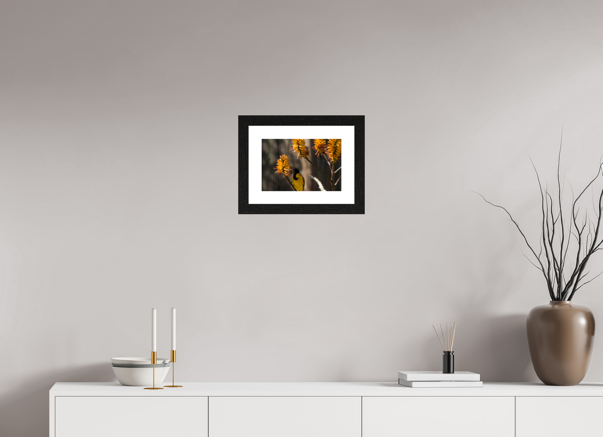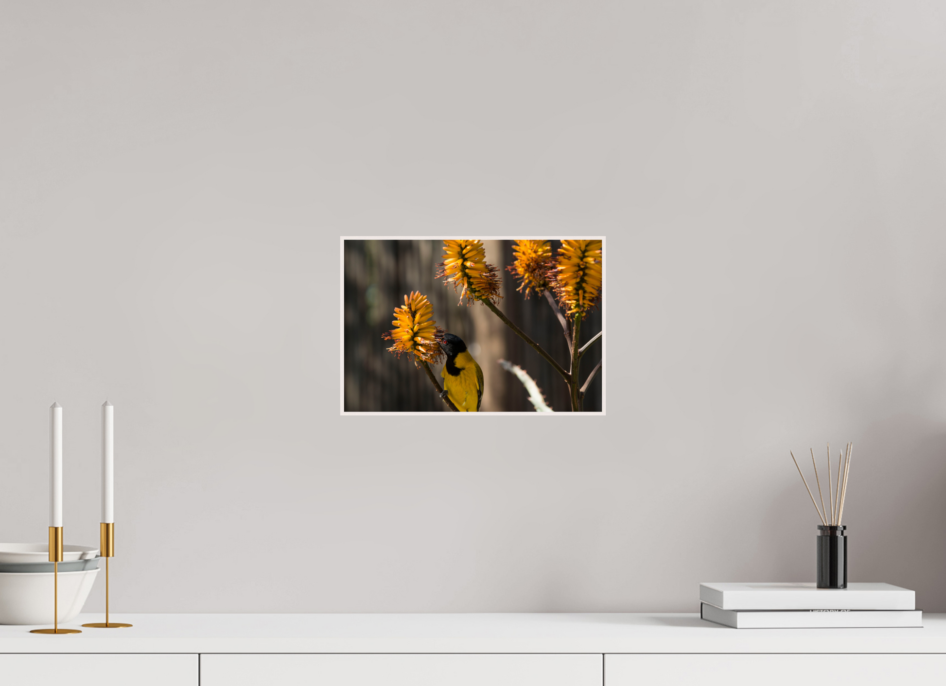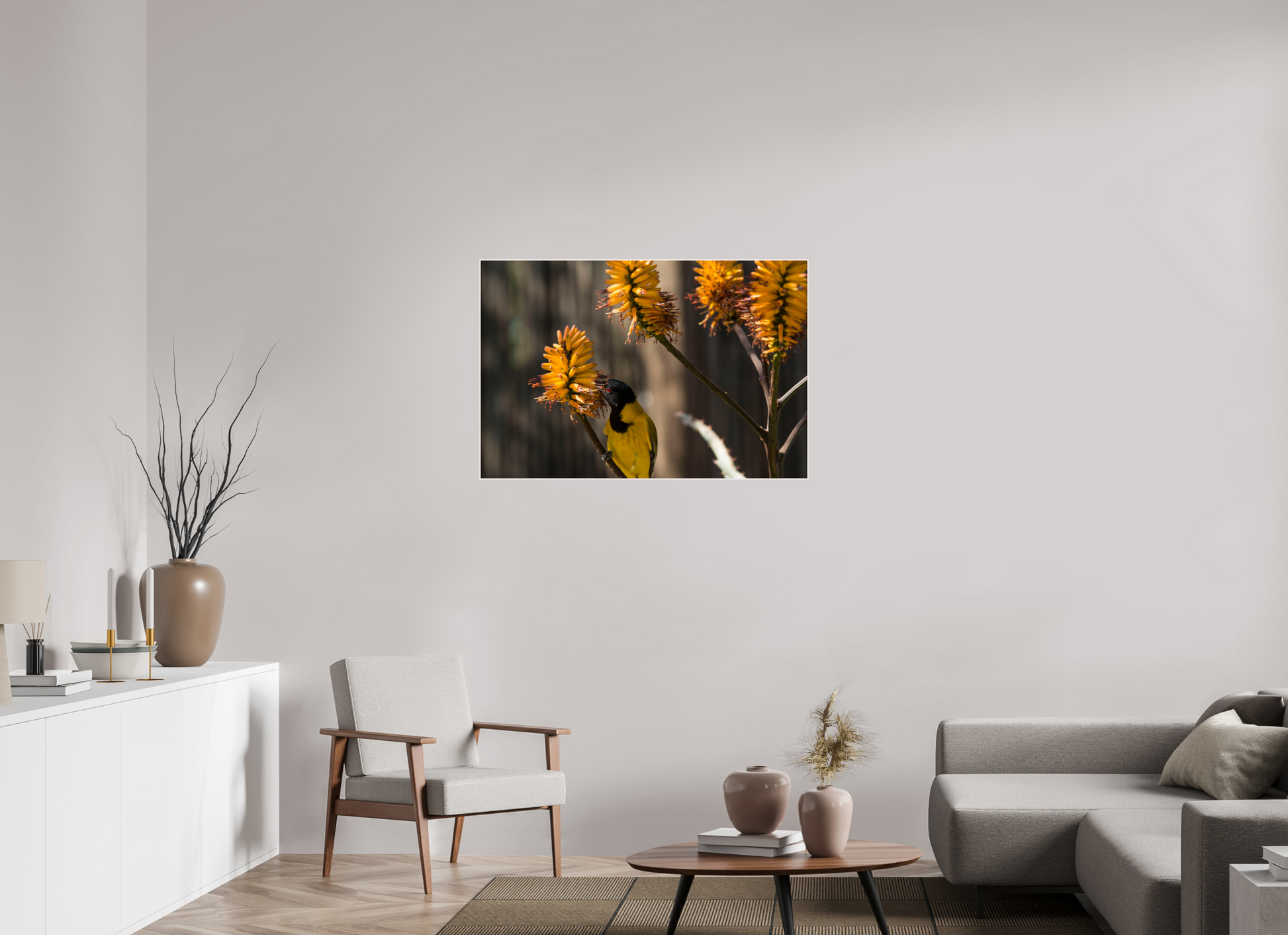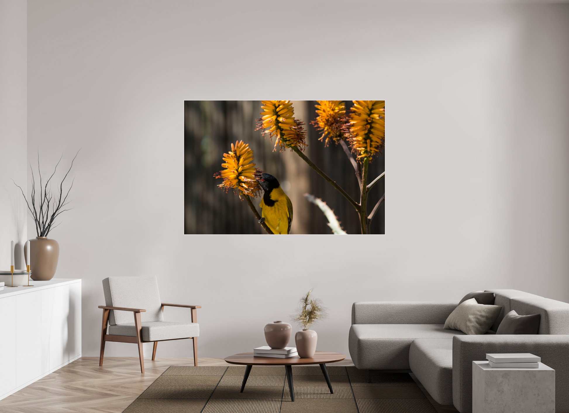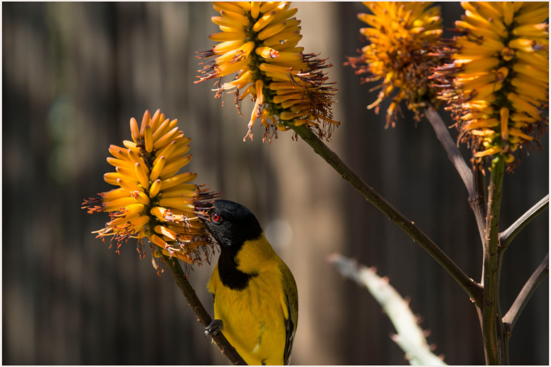 An Oriole Black-Headed, with its vivid yellow plumage and striking black head, perches gracefully on a blooming yellow aloe plant, its red beak and eyes contrasting beautifully against the vibrant blossoms, creating a captivating scene of natural harmony.