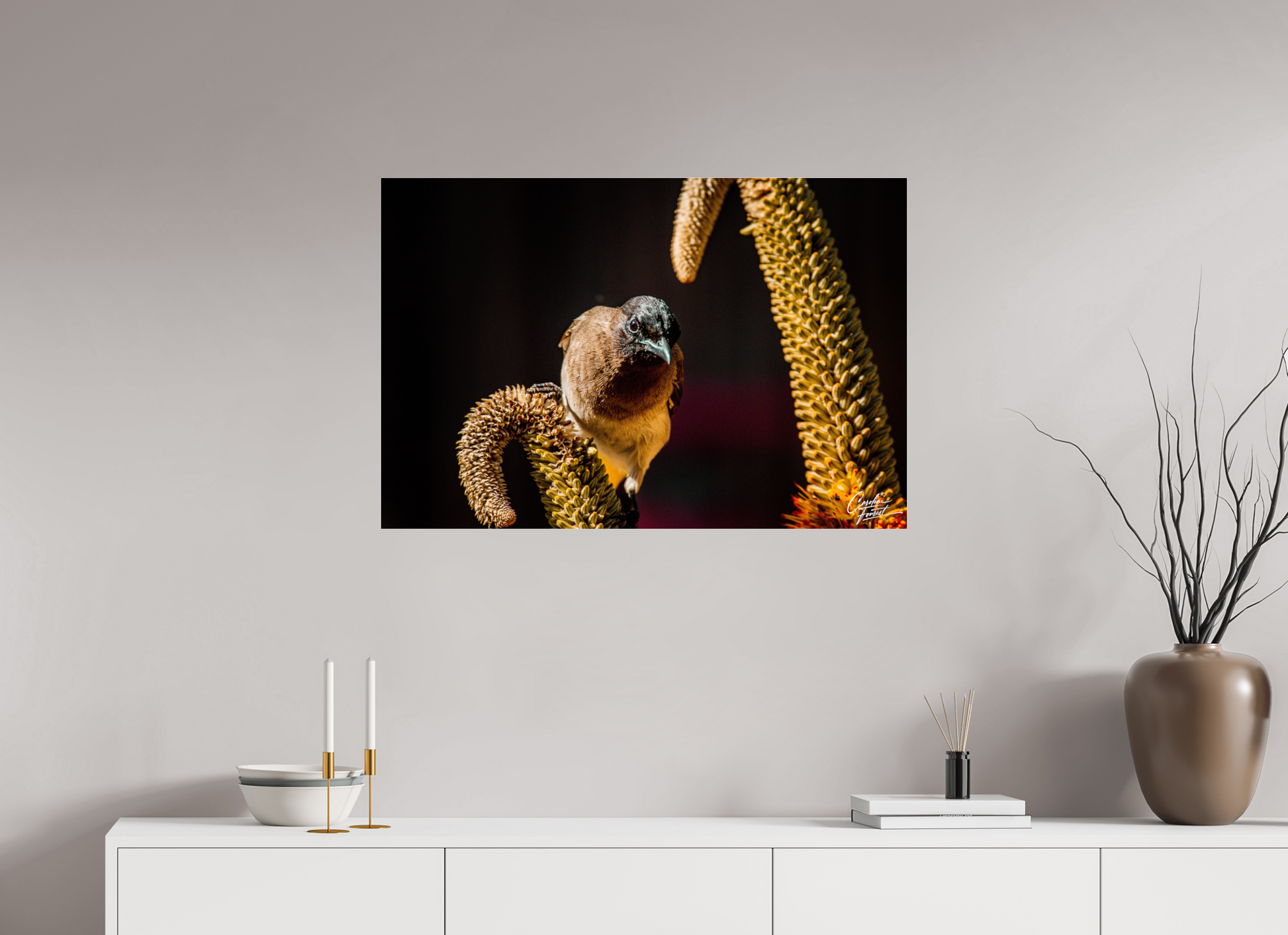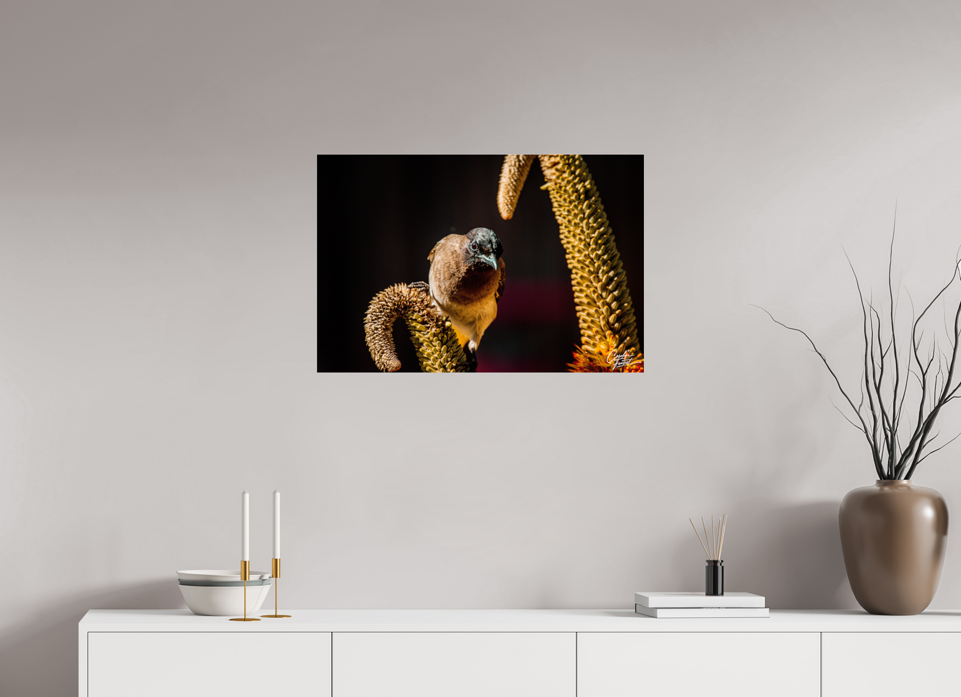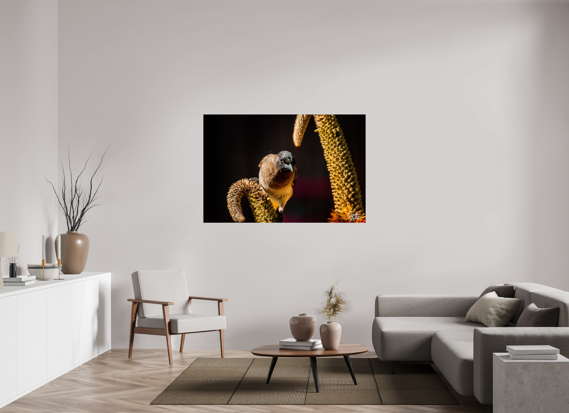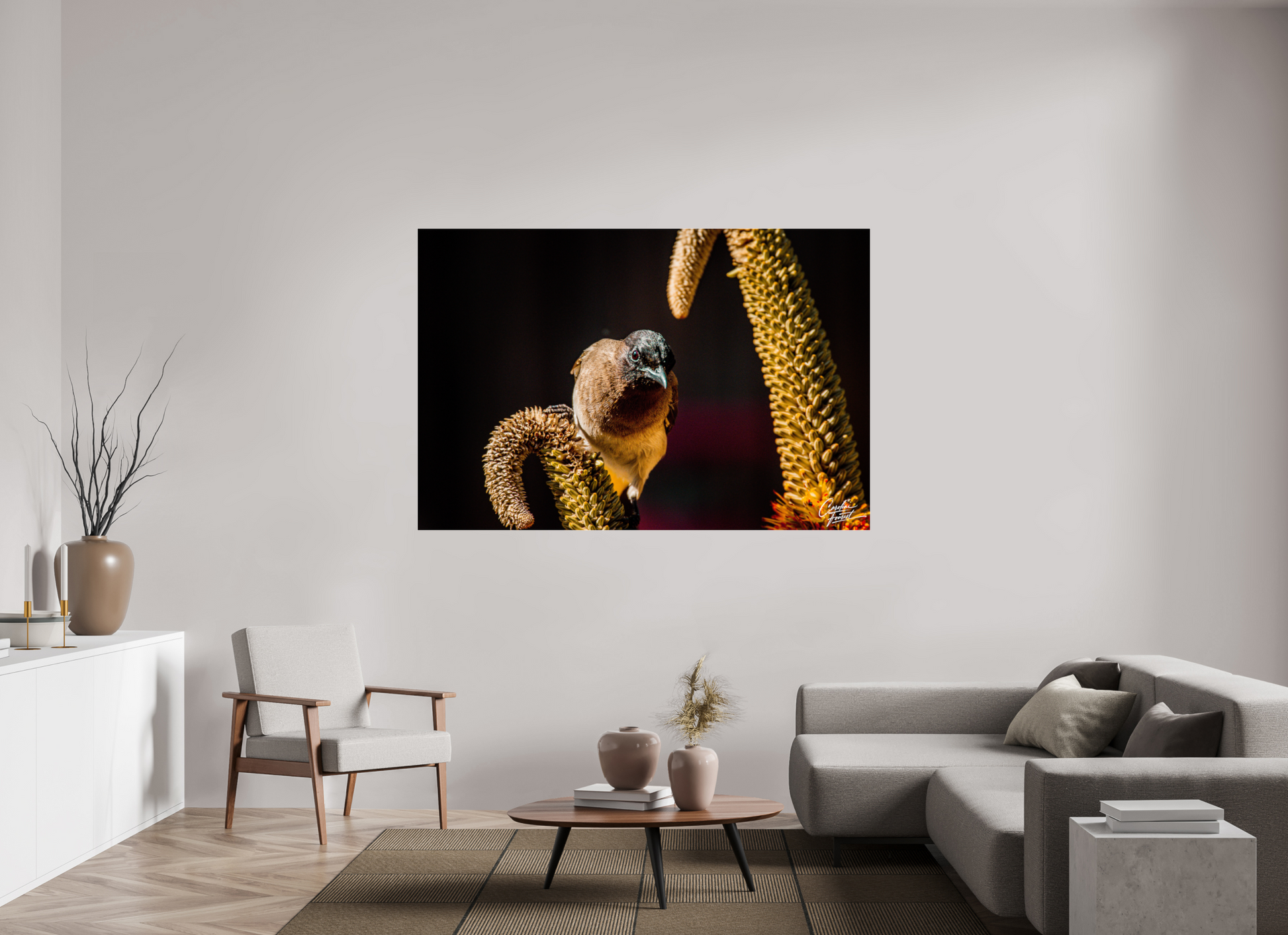 A small bird clings to a thorny branch, its curious gaze directed towards the viewer. The contrast between the bird's soft, detailed plumage and the sharp, spiky branch creates a striking visual dynamic. The dark background further accentuates the bird, drawing attention to its delicate features and inquisitive demeanor.
