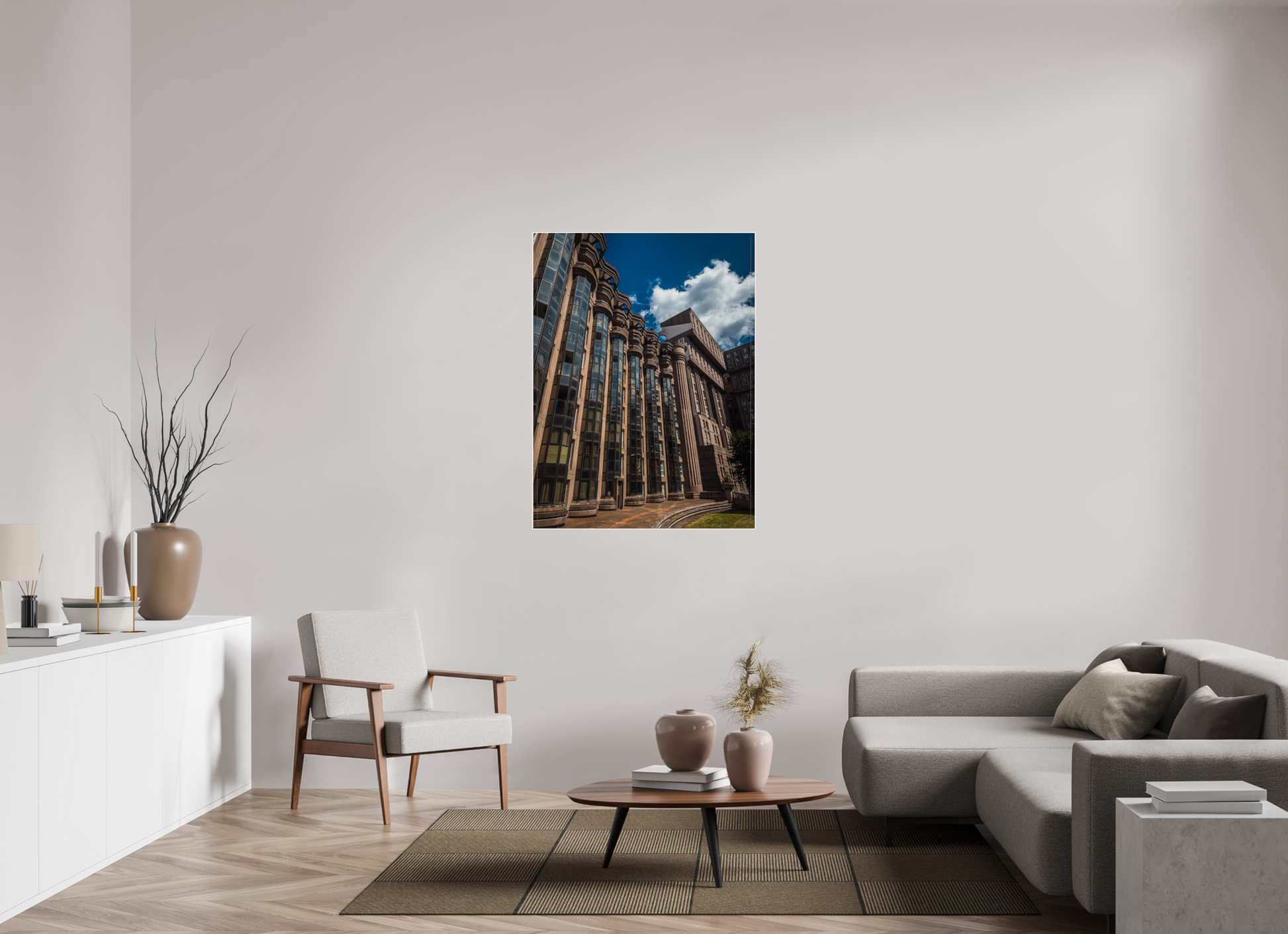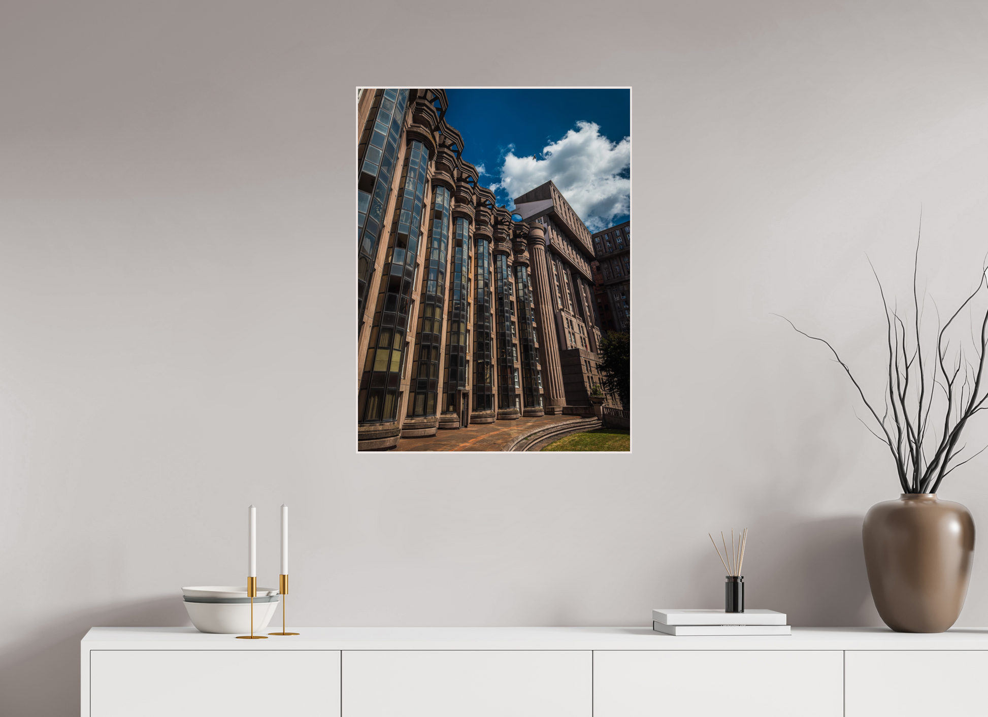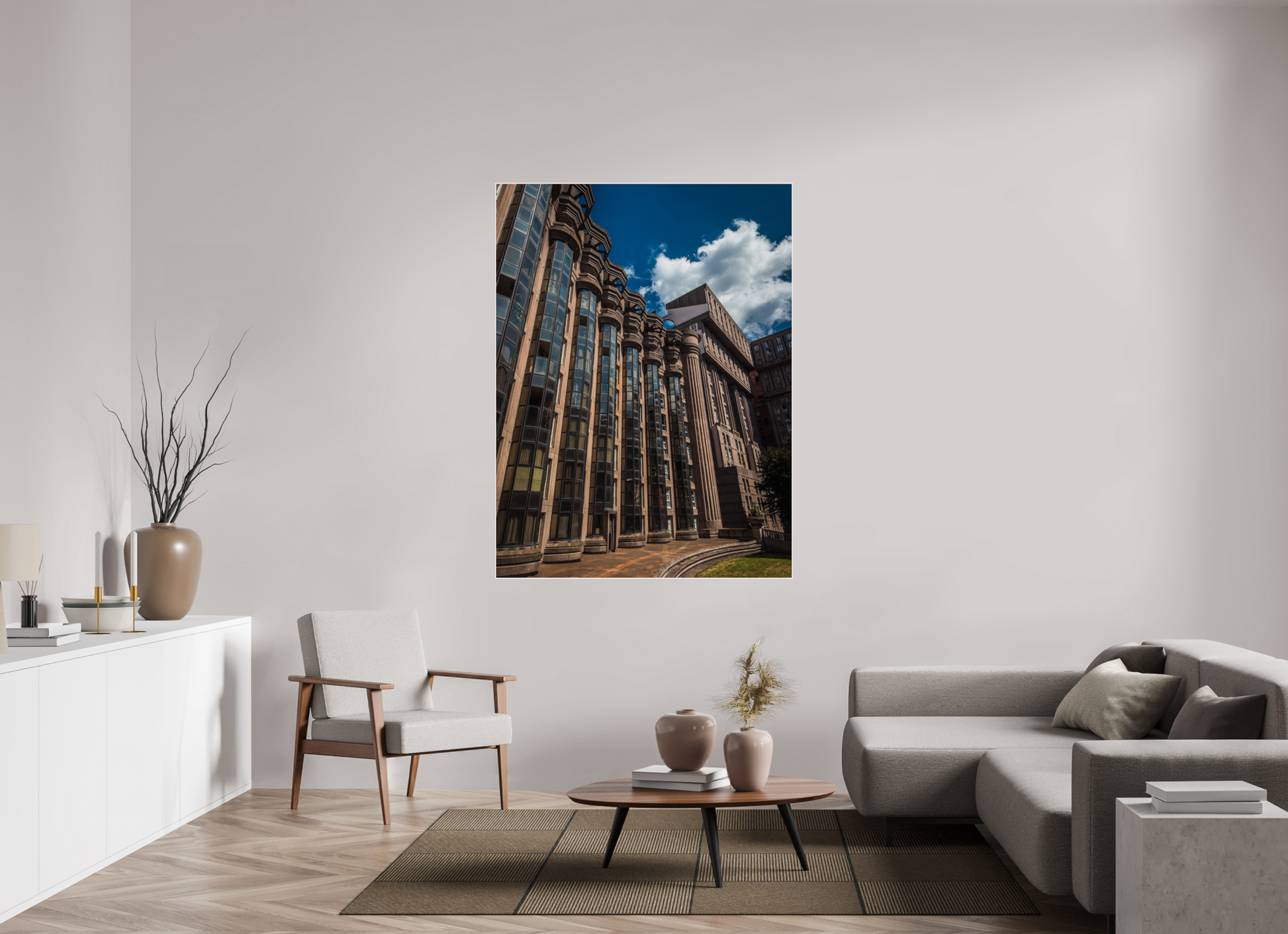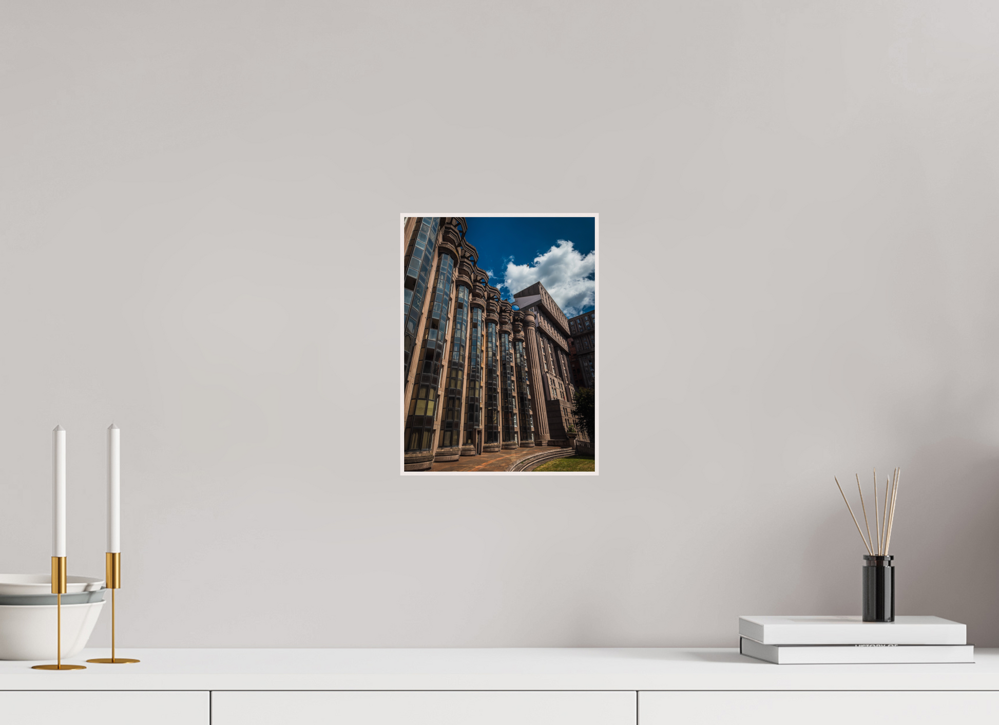 This image captures the striking verticality and architectural grandeur of the Espaces d'Abraxas. The building's facade is characterized by its tall, cylindrical columns that rise majestically against the backdrop of a clear blue sky dotted with fluffy clouds. The reflective glass windows add a modern touch, contrasting with the solid, classical columns. The perspective of the photograph emphasizes the height and symmetry of the structure, drawing the viewer's gaze upward along the lines of the building. The interplay of light and shadow on the building's surface highlights the textures and details of the materials, adding depth and dimension to the scene.