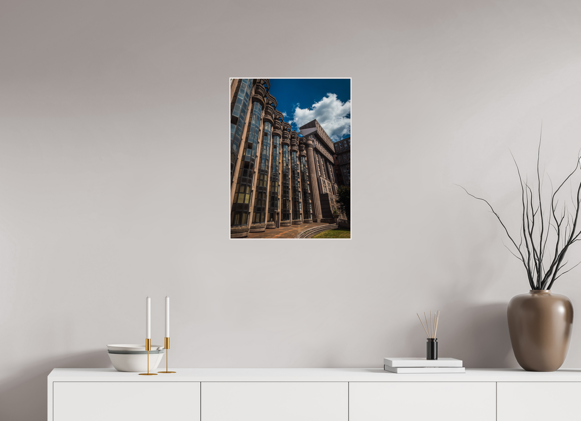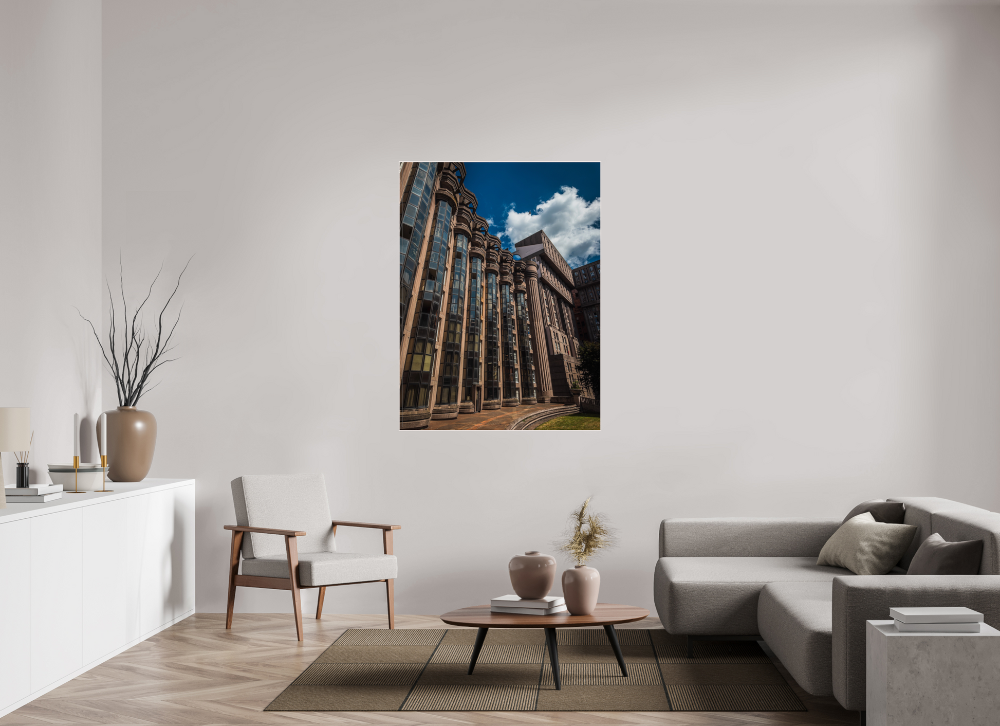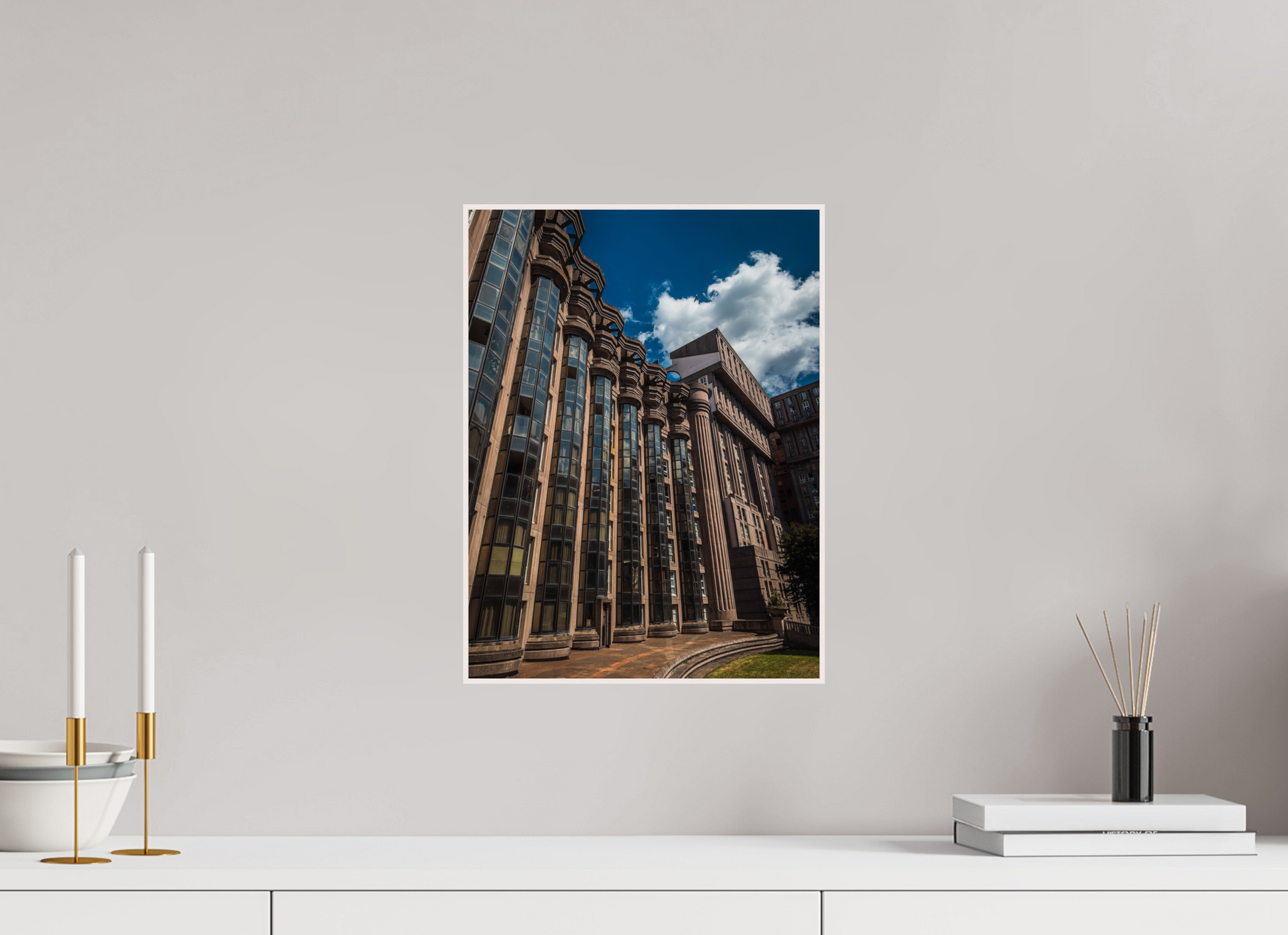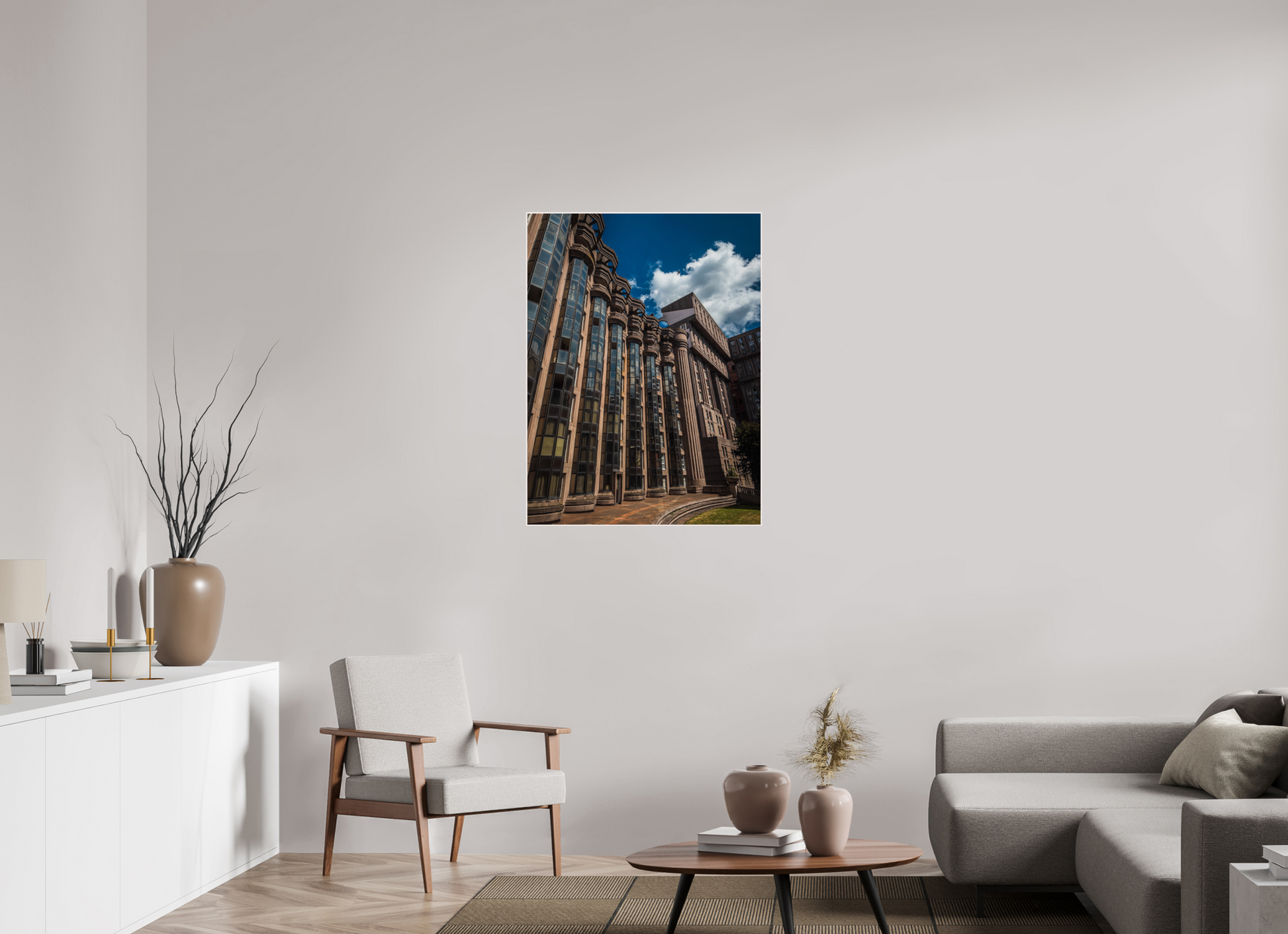 This image captures the striking verticality and architectural grandeur of the Espaces d'Abraxas. The building's facade is characterized by its tall, cylindrical columns that rise majestically against the backdrop of a clear blue sky dotted with fluffy clouds. The reflective glass windows add a modern touch, contrasting with the solid, classical columns. The perspective of the photograph emphasizes the height and symmetry of the structure, drawing the viewer's gaze upward along the lines of the building. The interplay of light and shadow on the building's surface highlights the textures and details of the materials, adding depth and dimension to the scene.