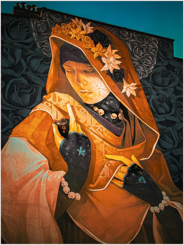 As part of the Street Art 13 project, the renowned artist Inti graced Paris with his striking mural titled "La Madre Secular 2" Located on a large wall along Boulevard Vincent Auriol, this piece depicts a secular representation of the Madonna, transcending traditional religious contexts. Inti's Madonna serves as an allegory for knowledge and skepticism, blending iconic composition with symbols tied to nature and science.