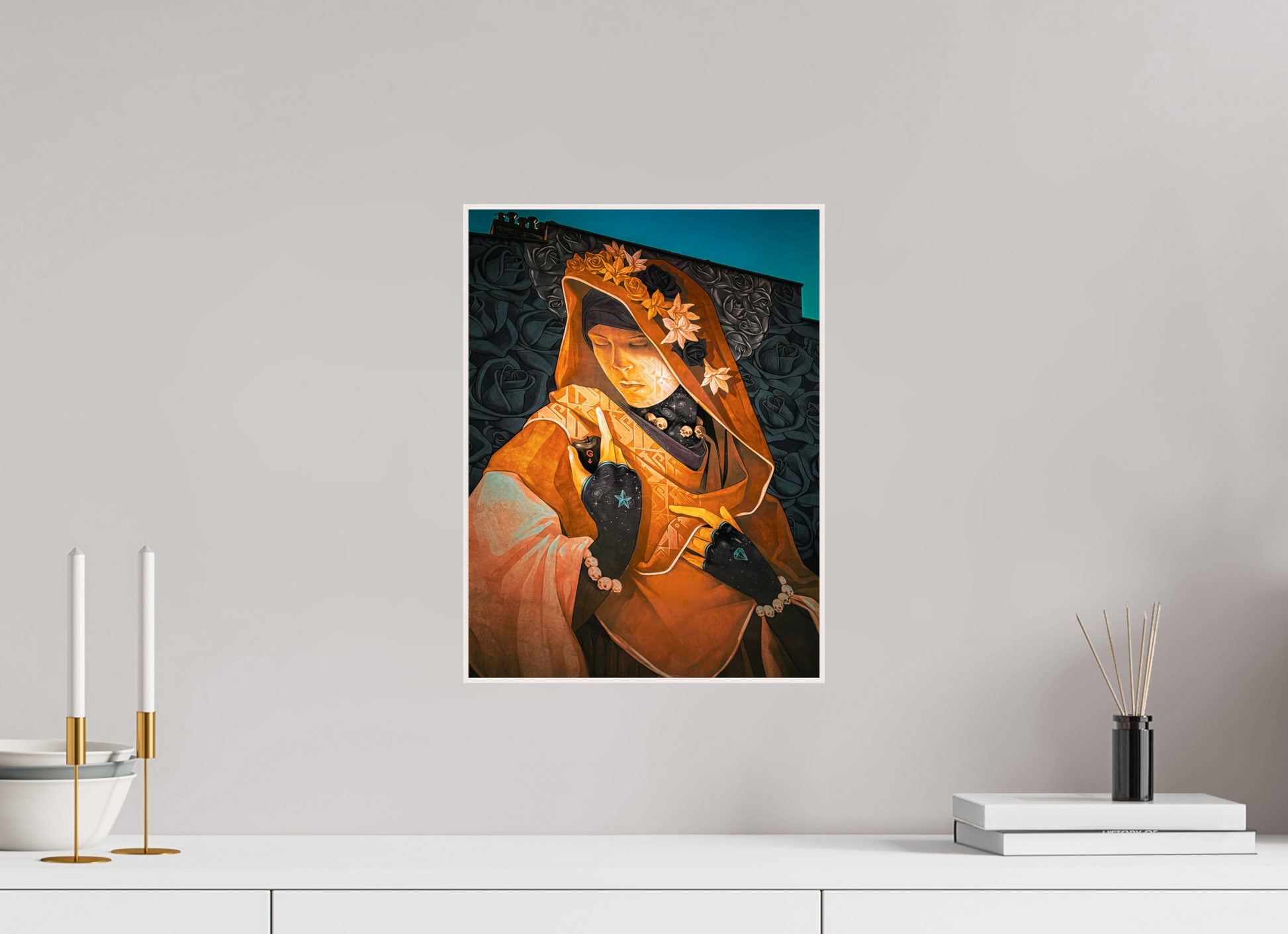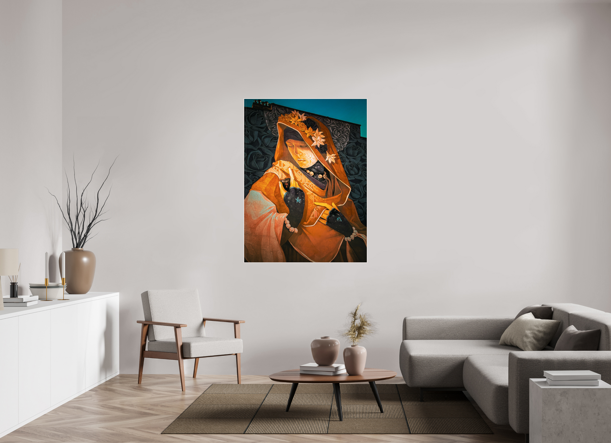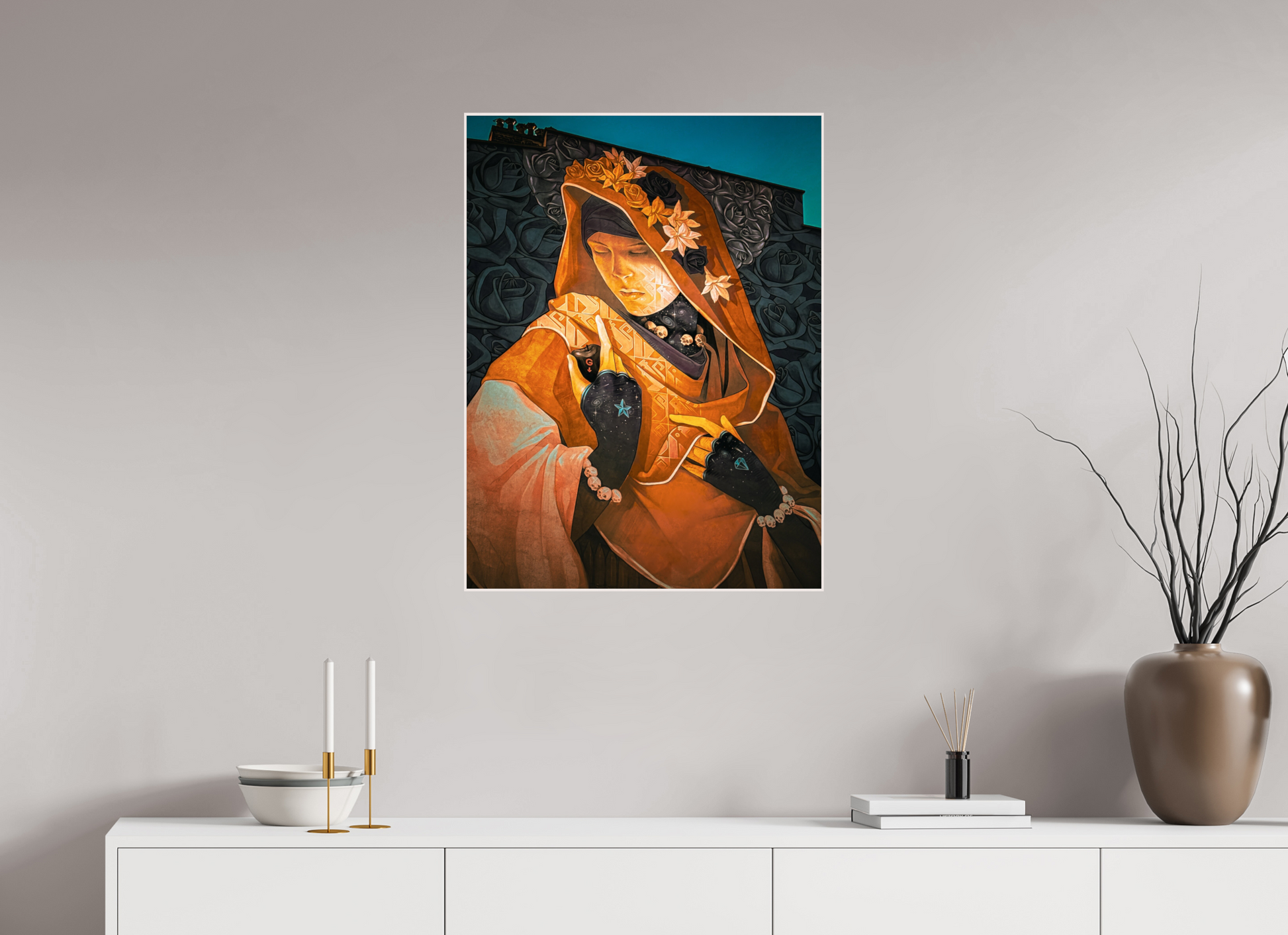 In this captivating artwork, the Madonna's head is tilted towards her right hand, which holds an apple. The apple is marked with the letter "G," transforming the biblical fruit into a nod to Newton and the concept of gravity. This intricate detail underscores the fusion of art and science, inviting viewers to reflect on the intersections of myth, knowledge, and human curiosity.