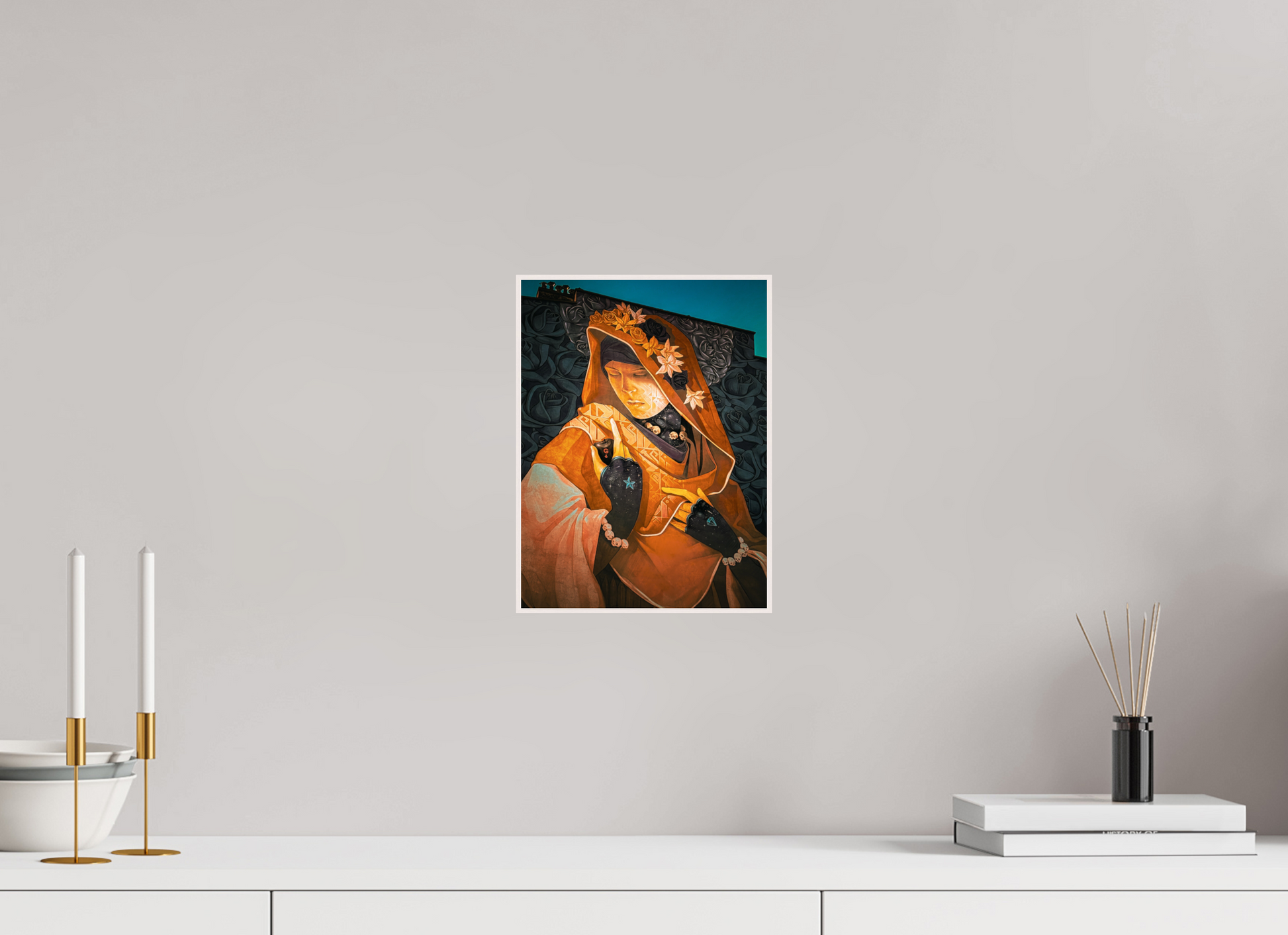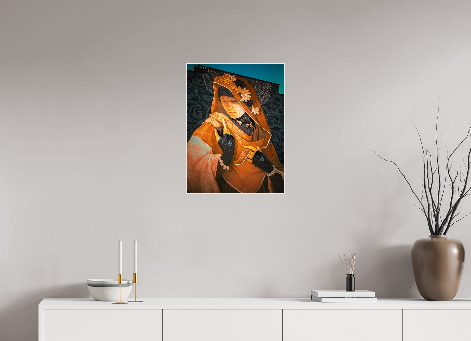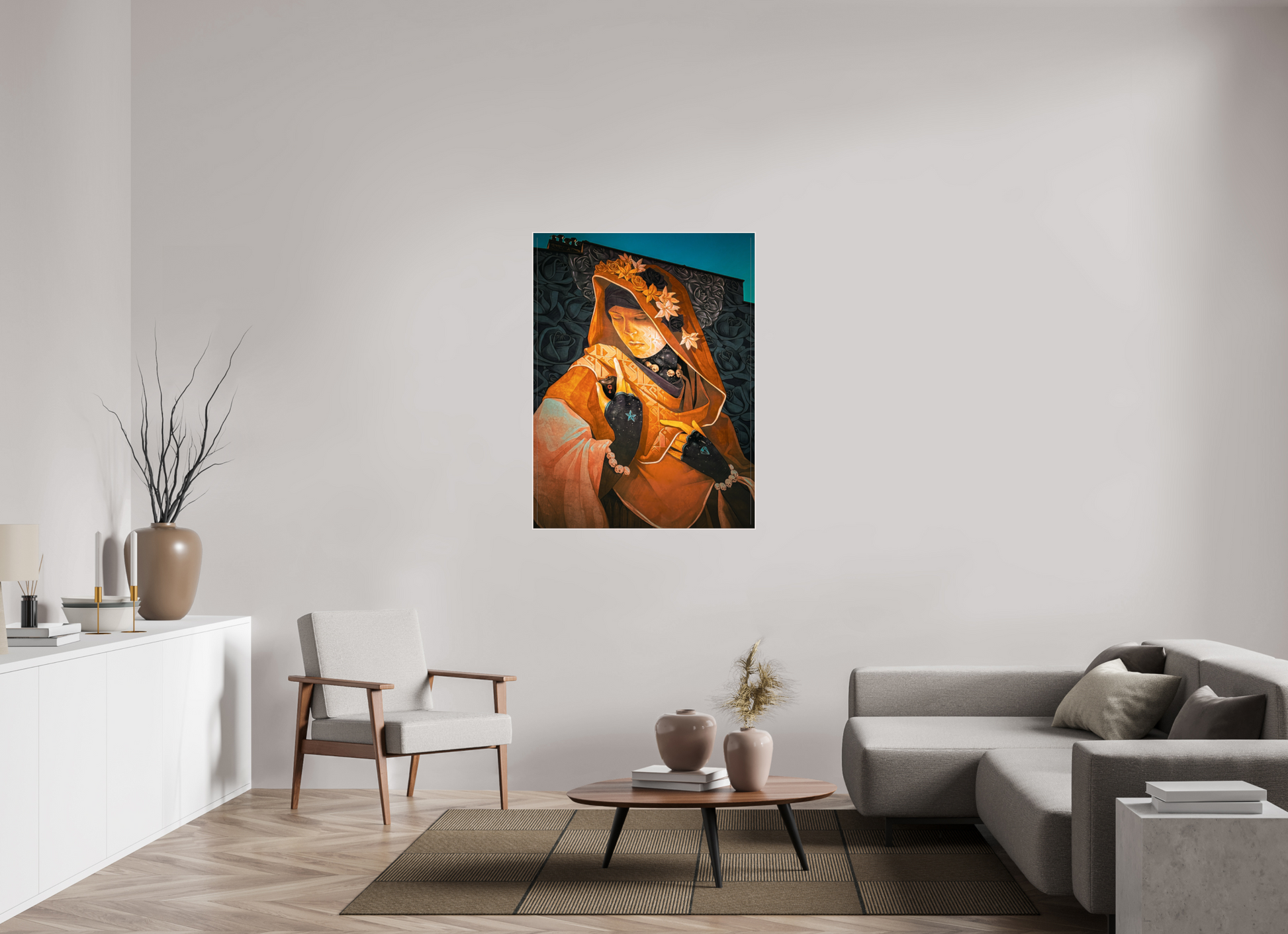 In this captivating artwork, the Madonna's head is tilted towards her right hand, which holds an apple. The apple is marked with the letter "G," transforming the biblical fruit into a nod to Newton and the concept of gravity. This intricate detail underscores the fusion of art and science, inviting viewers to reflect on the intersections of myth, knowledge, and human curiosity.