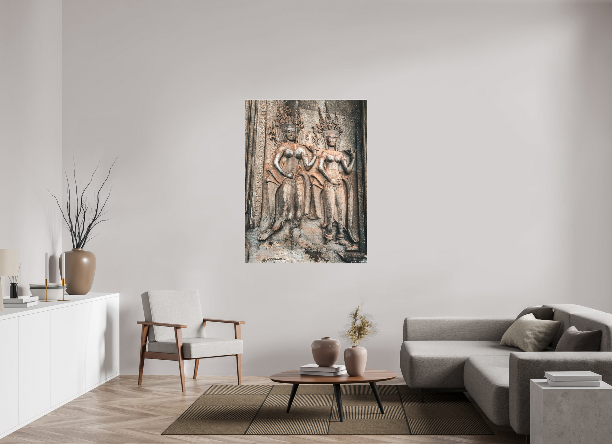 The stone figures of Angkor, adorned with detailed headdresses and flowing garments, seem to dance in the soft light of the jungle canopy. The muted greys and browns of the weathered stone contrast beautifully with the vibrant greens of the encroaching foliage, creating a scene of timeless beauty. The play of light and shadow on the carved surfaces adds depth and texture, highlighting the craftsmanship of a civilization lost to time. The soft light filtering through the jungle canopy adds a sense of tranquility and serenity, capturing the essence of Angkor's mystical allure. This image is a testament to the enduring legacy of the Khmer Empire, where history and nature intertwine.