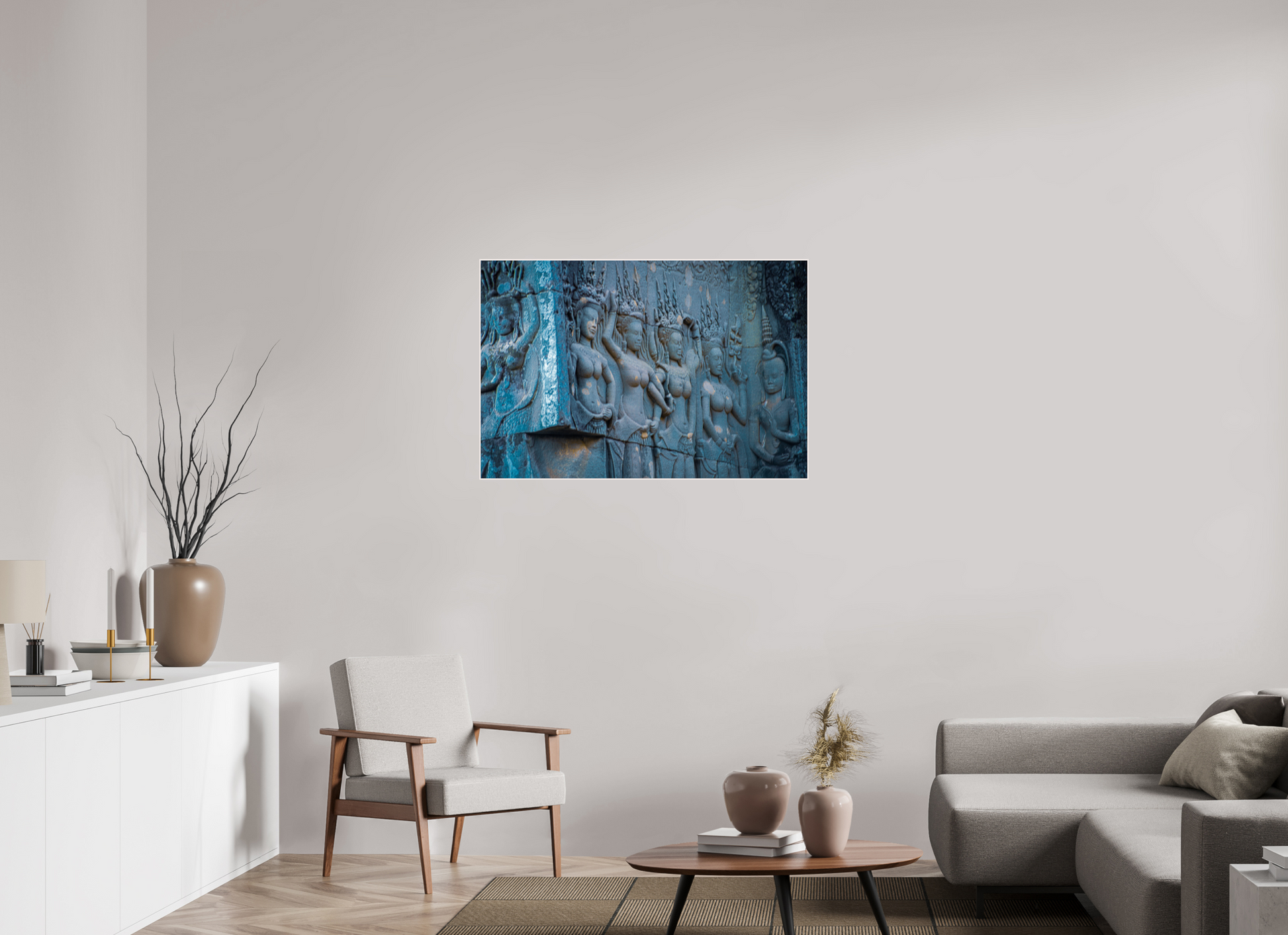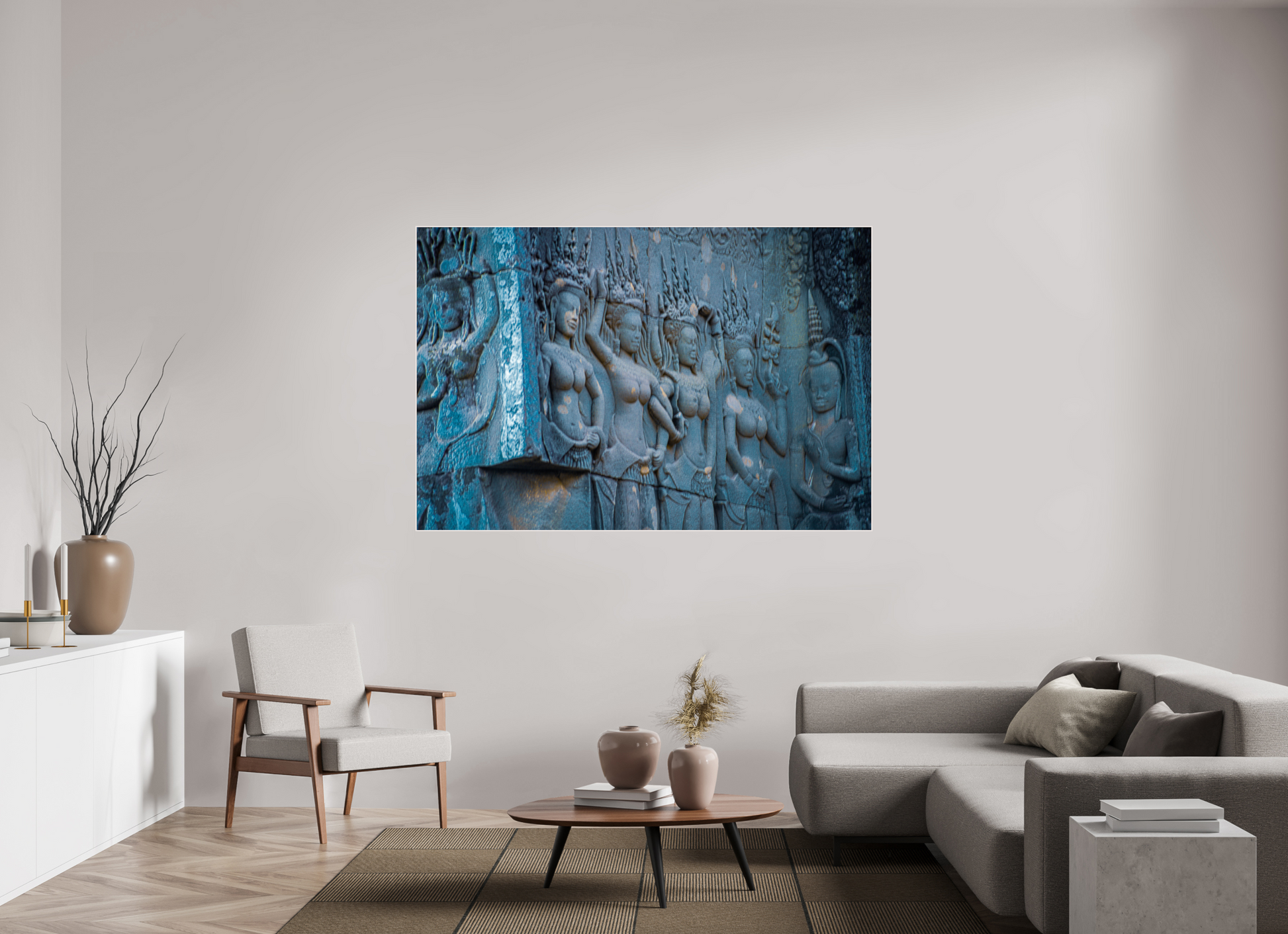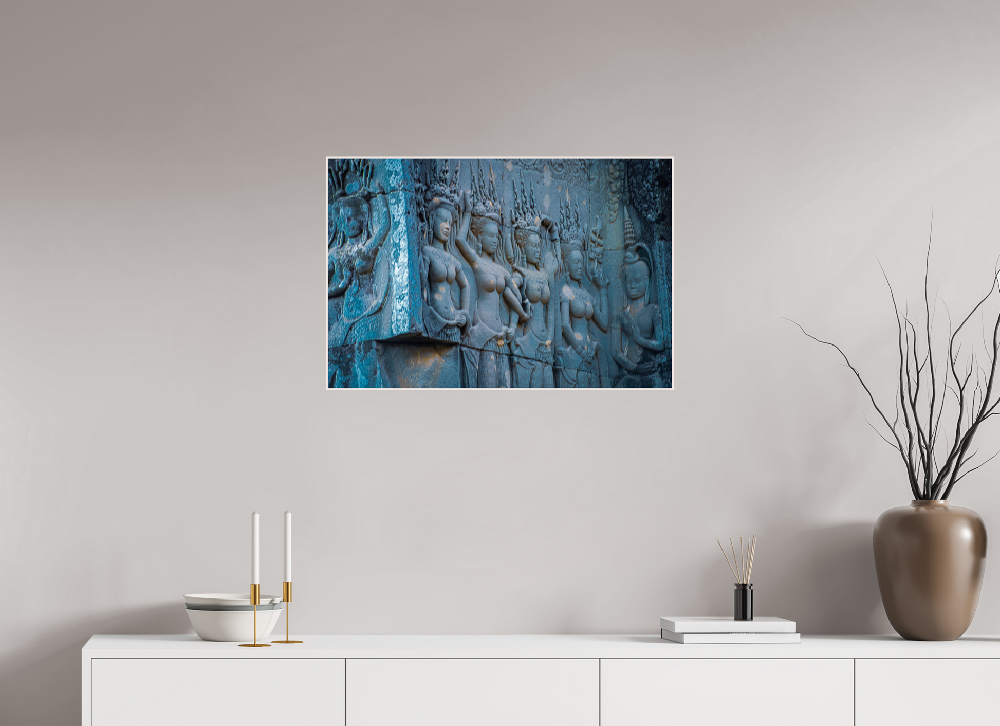 The intricate carvings of celestial dancers at Angkor come to life in this image, their flowing garments and poised stances frozen in stone. The muted blues and greys of the weathered stone contrast beautifully with the soft light that filters through the jungle canopy, casting gentle shadows that add depth and texture to the scene. The detailed craftsmanship of the carvings evokes a sense of grace and elegance, capturing the essence of Angkor's mystical allure. This image is a testament to the enduring legacy of the Khmer Empire, where history and artistry intertwine.