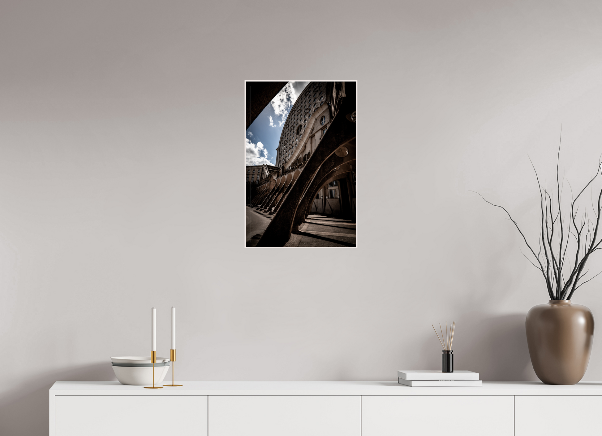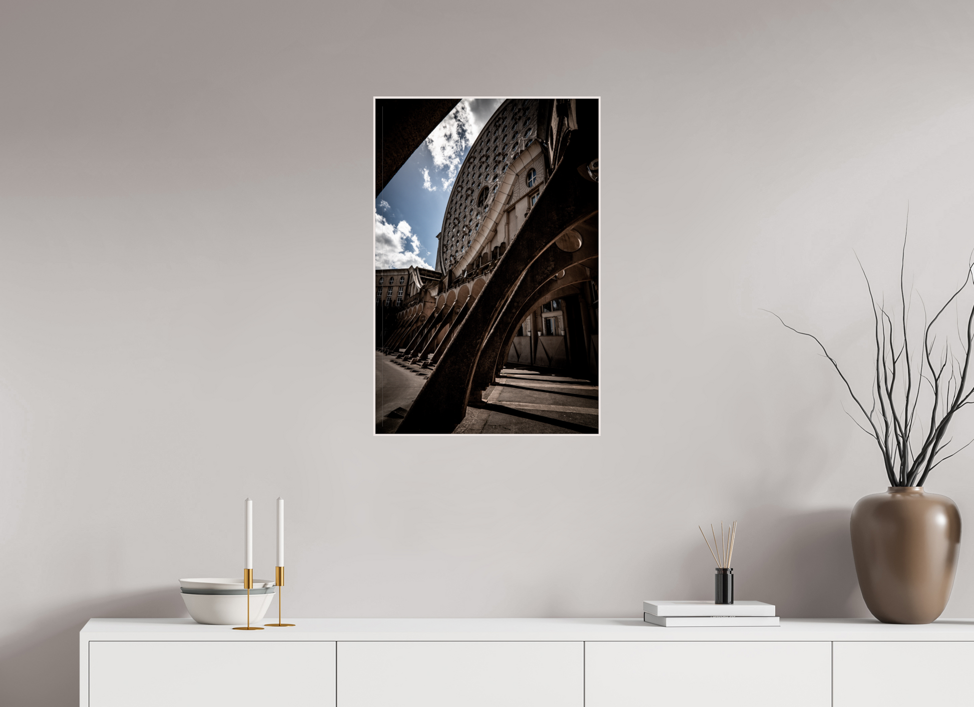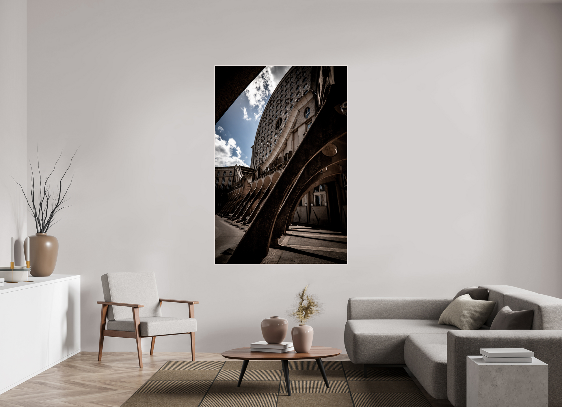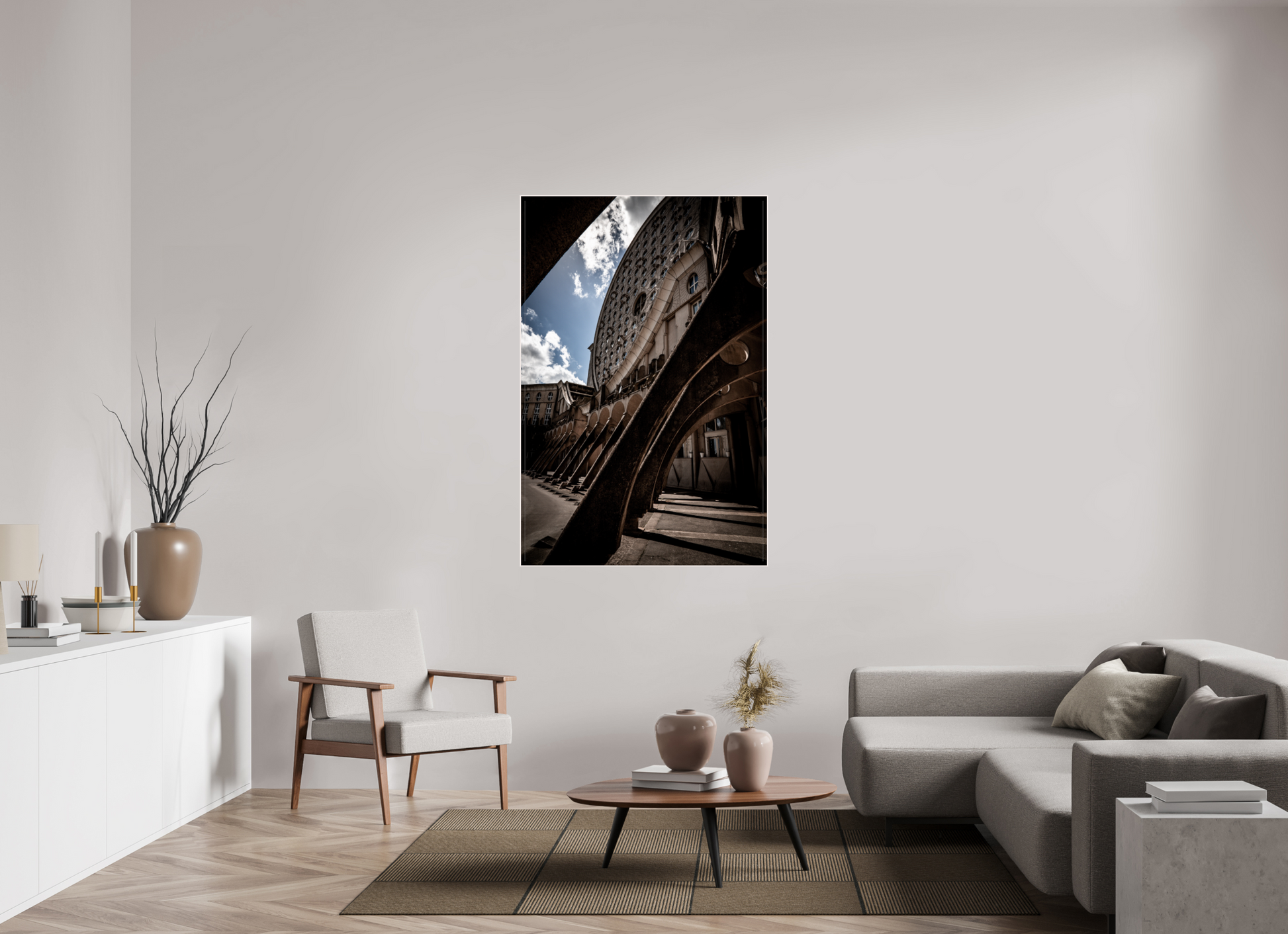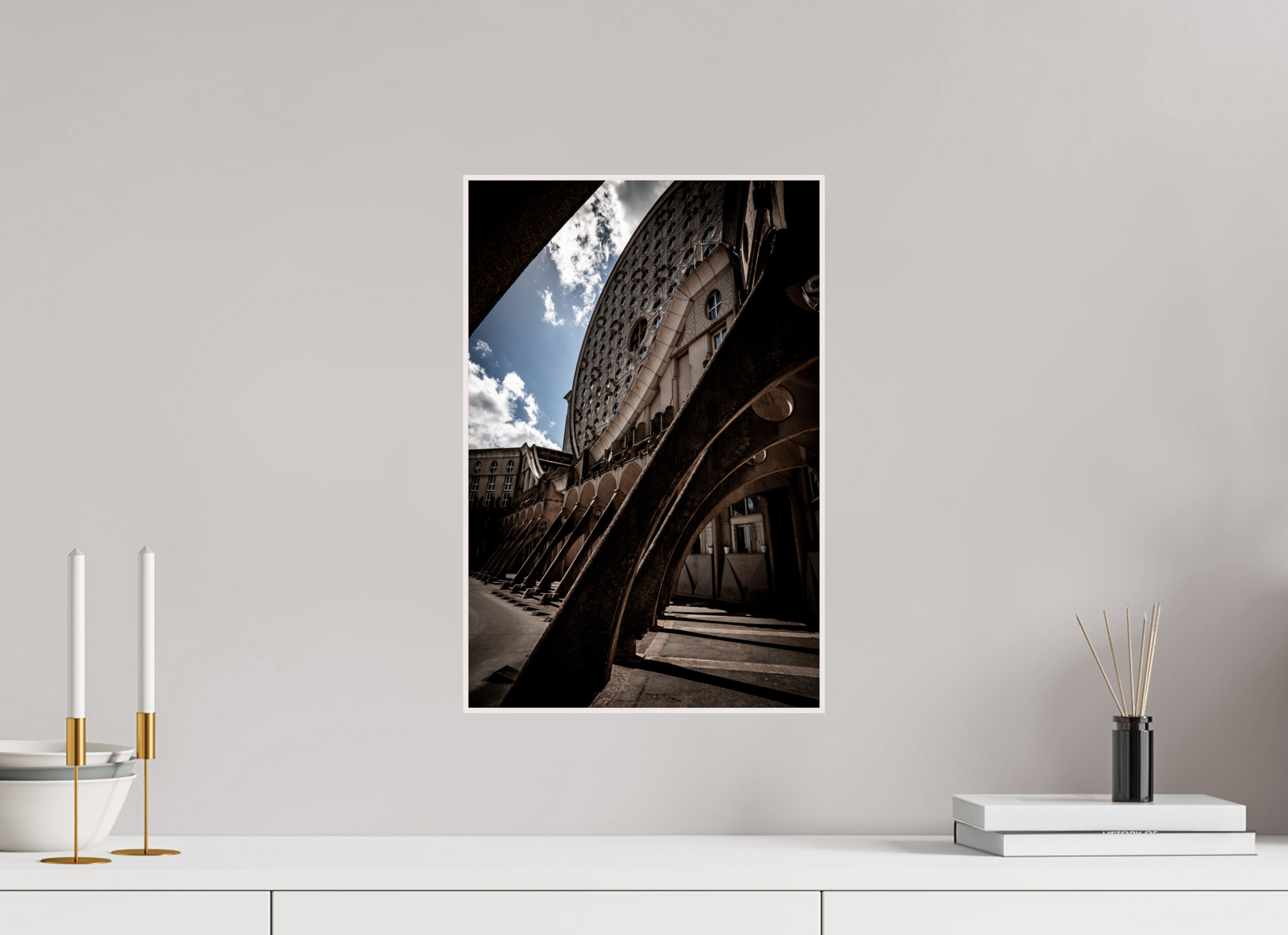 Showcasing the unique interplay between modernist architecture and the sky, this image presents a dramatic perspective of the bold lines and stark contrasts of Arènes de Picasso. The angular forms and the stark contrast between the concrete structures and the sky create a sense of dynamic tension, highlighting the powerful geometric lines and the imposing presence of the buildings. Arènes de Picasso in Noisy-le-Grand, designed by architects Manuel Núñez Yanowsky, is a notable example of modernist architecture, which is known for its innovative use of shapes and materials. This architectural style, which flourished in the late 20th century, is often associated with a sense of creativity and forward-thinking design. The work at Arènes de Picasso exemplifies these characteristics, with its bold, angular forms and unique structural elements. The complex is renowned for its innovative design, which includes a series of interconnected residential buildings and communal spaces. An interesting anecdote about Arènes de Picasso is that the integration of classical and contemporary elements was a deliberate effort to create a timeless architectural masterpiece.