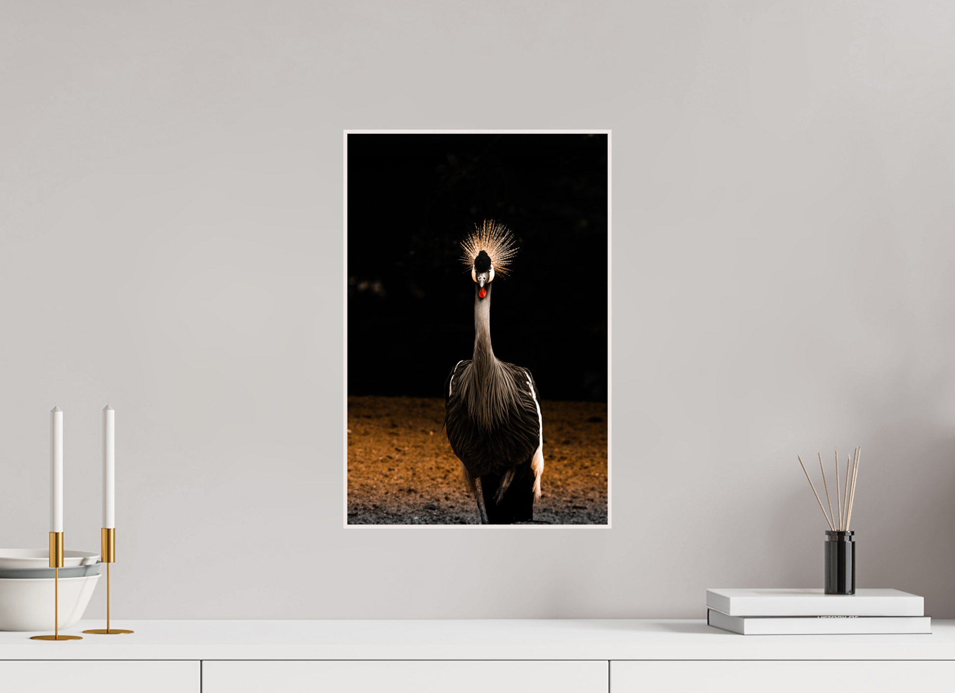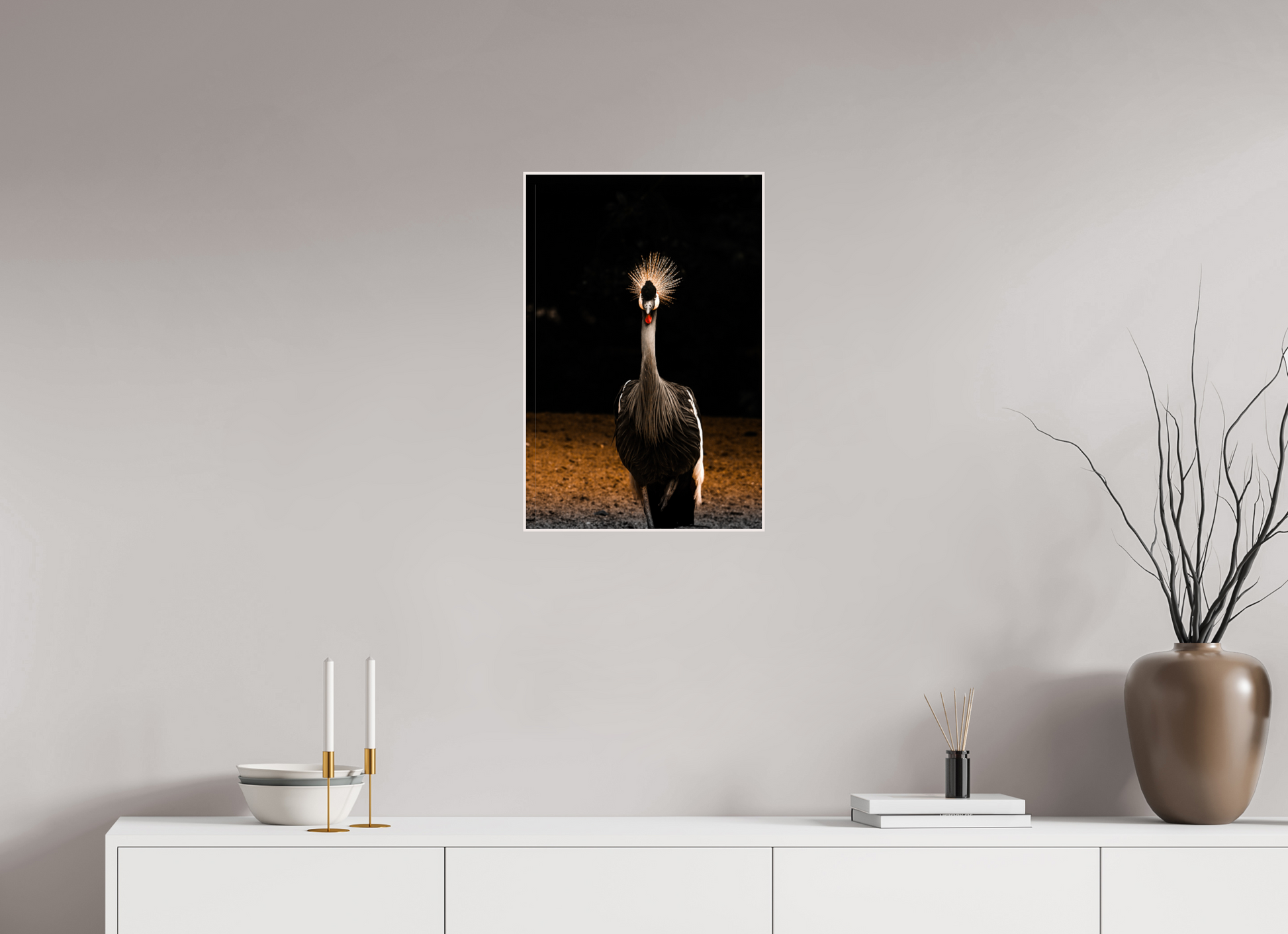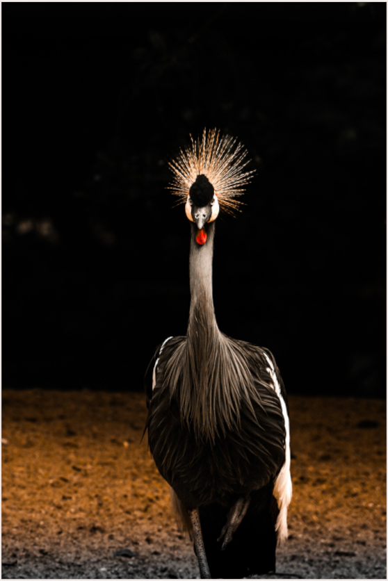 In the quiet of the night, a crowned crane stands poised, its golden crest glowing under the faint moonlight. The dark background accentuates its elegant form, creating a silhouette that speaks of grace and mystery. The subtle hues of its plumage blend seamlessly with the shadows, while its eyes reflect a world unseen to us. This regal bird, with its distinctive crown of feathers, seems to rule the night with quiet dignity. The soft light highlights the intricate details of its feathers, adding depth and texture to the scene.