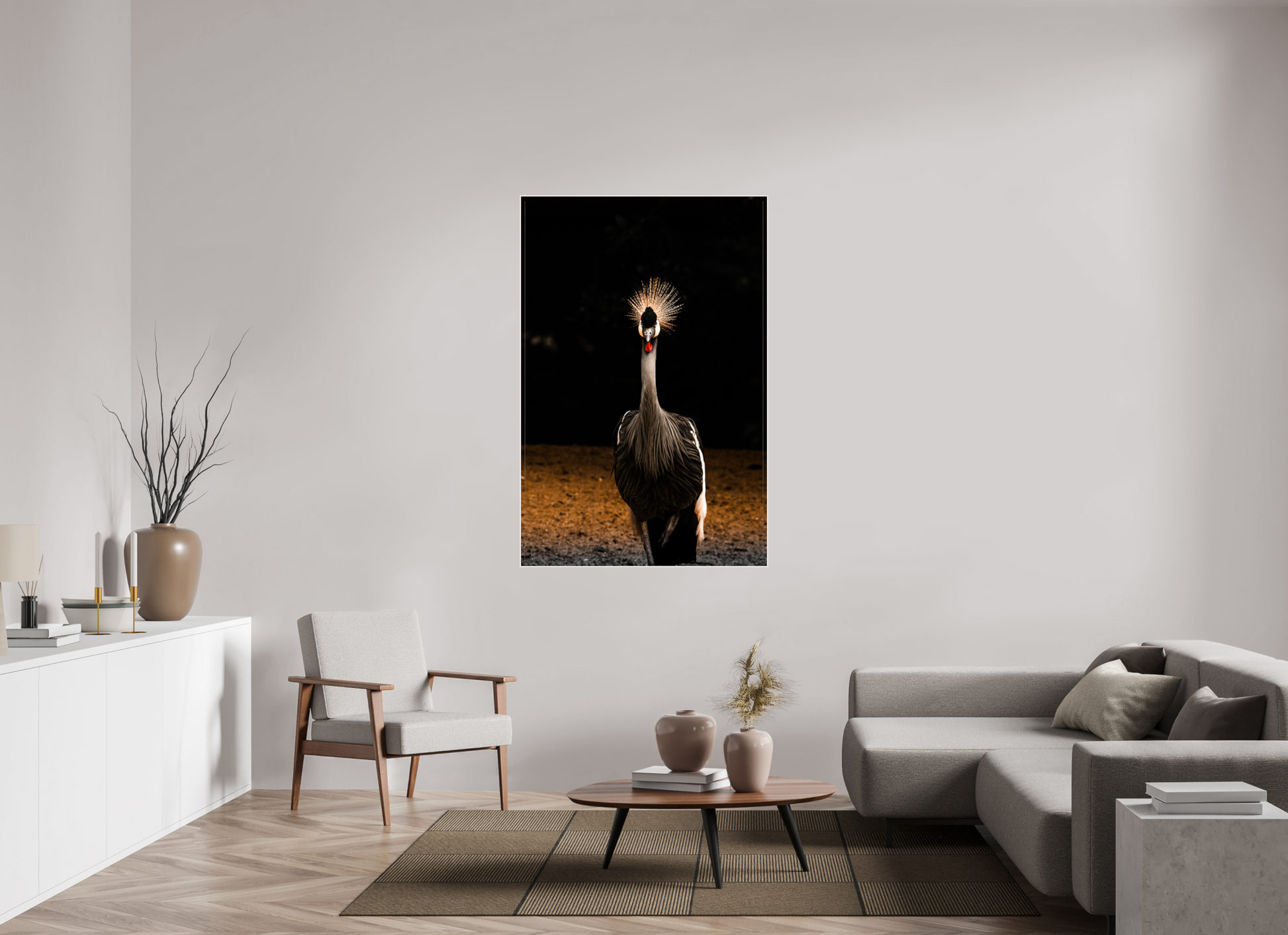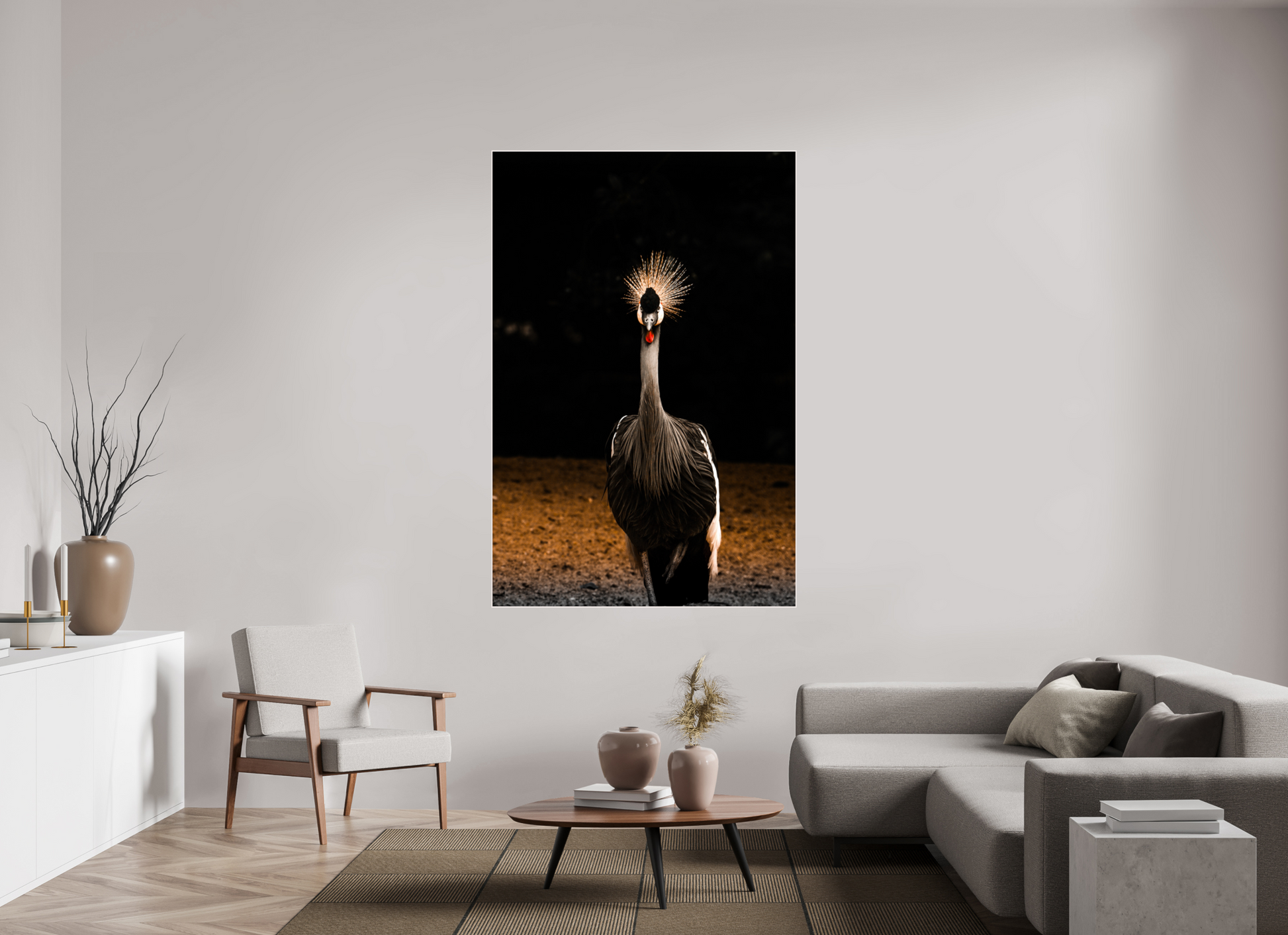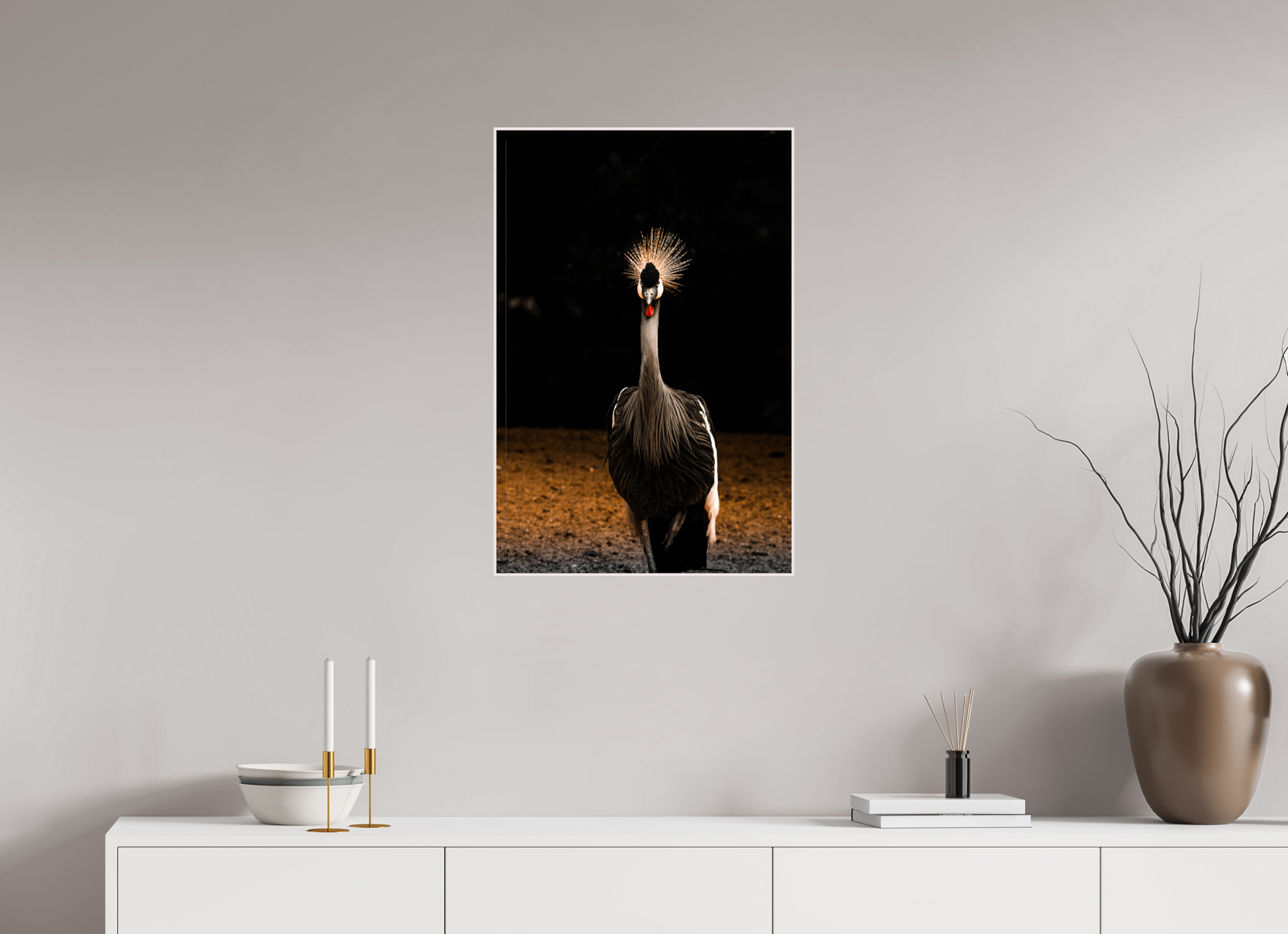 In the quiet of the night, a crowned crane stands poised, its golden crest glowing under the faint moonlight. The dark background accentuates its elegant form, creating a silhouette that speaks of grace and mystery. The subtle hues of its plumage blend seamlessly with the shadows, while its eyes reflect a world unseen to us. This regal bird, with its distinctive crown of feathers, seems to rule the night with quiet dignity. The soft light highlights the intricate details of its feathers, adding depth and texture to the scene.