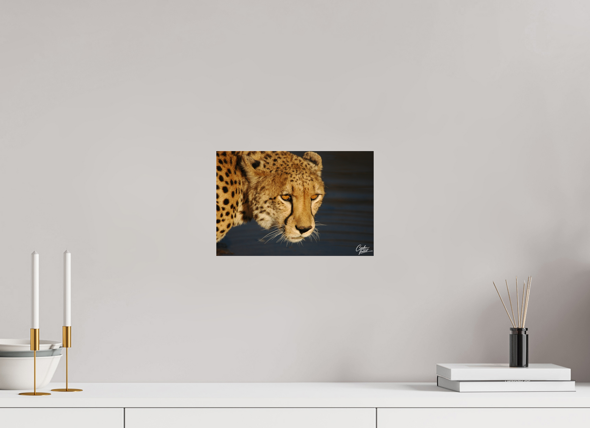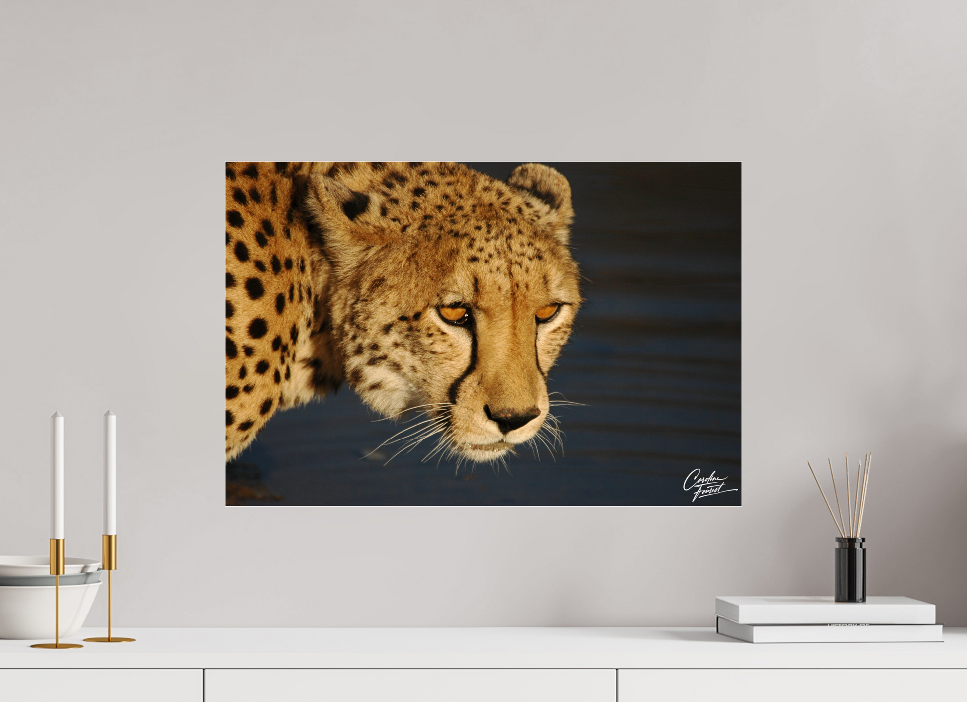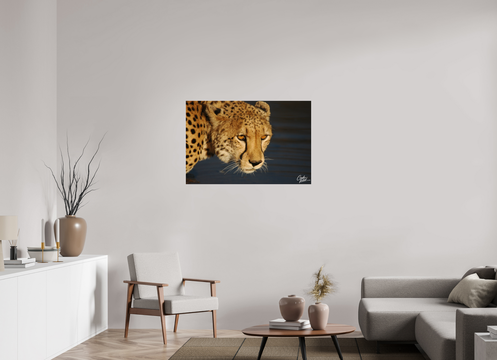 A cheetah's piercing eyes reflect the golden hues of the setting sun, capturing a moment of serene beauty and the untamed spirit of the wild, inviting you into a world of natural elegance.