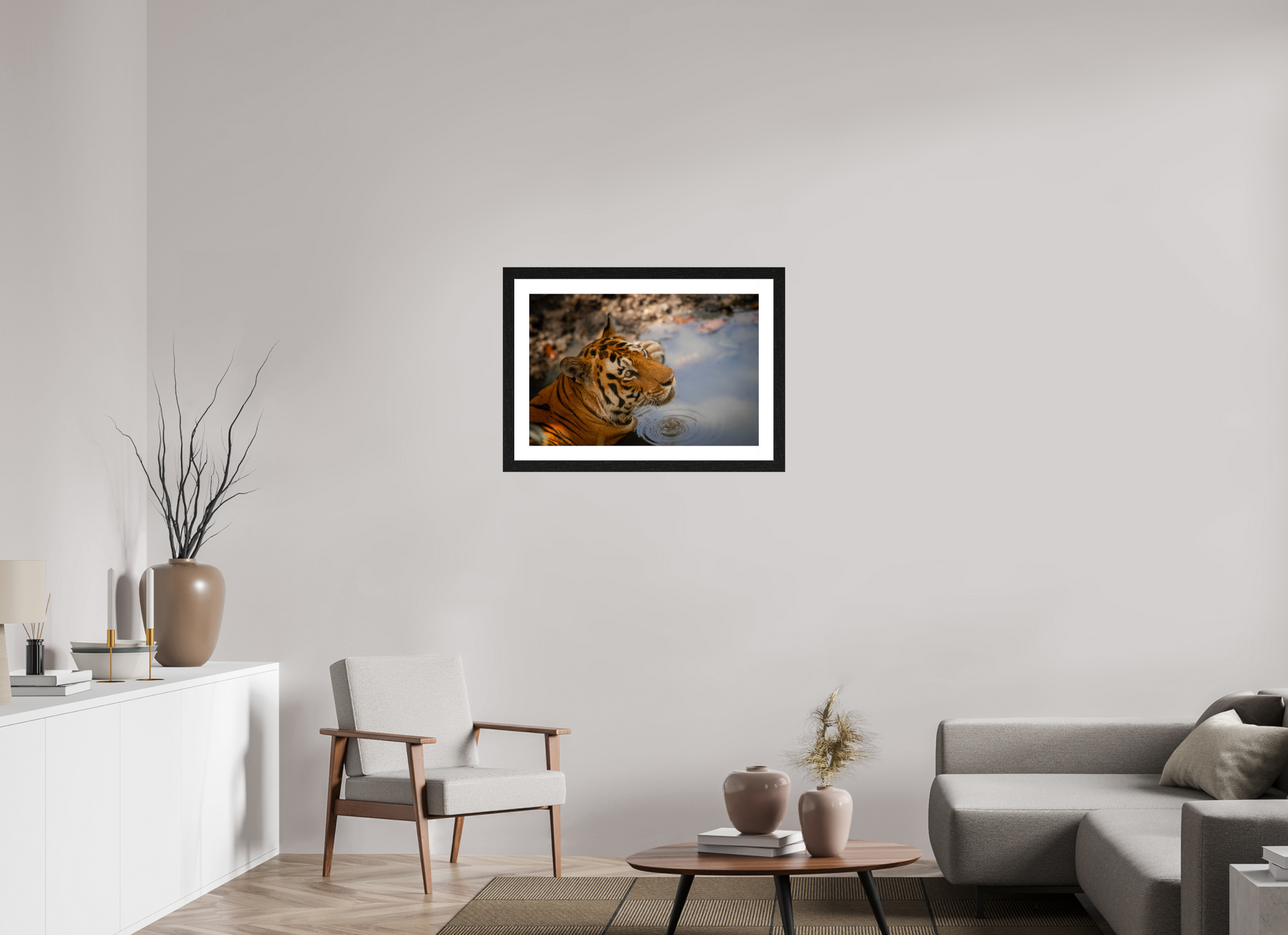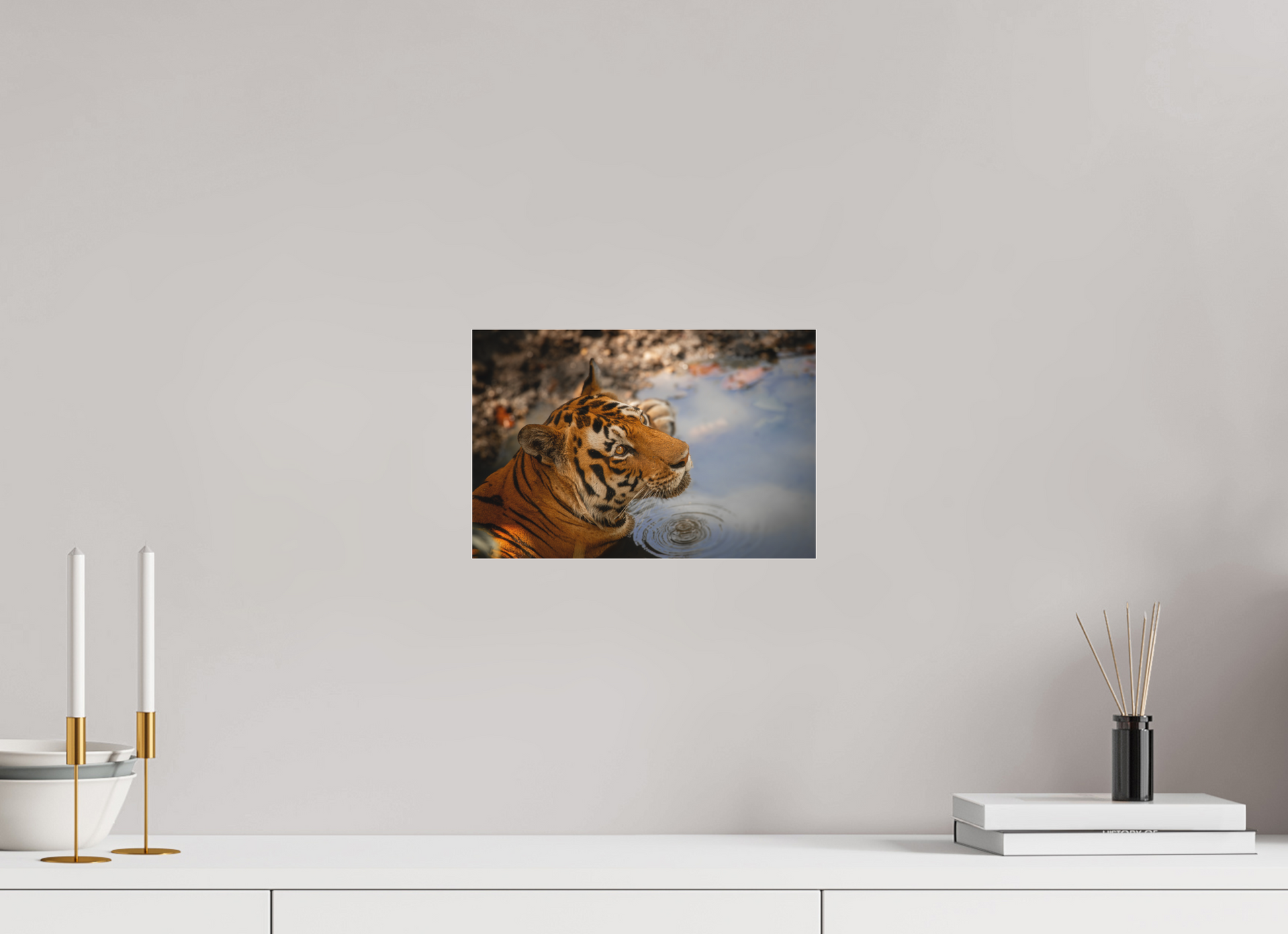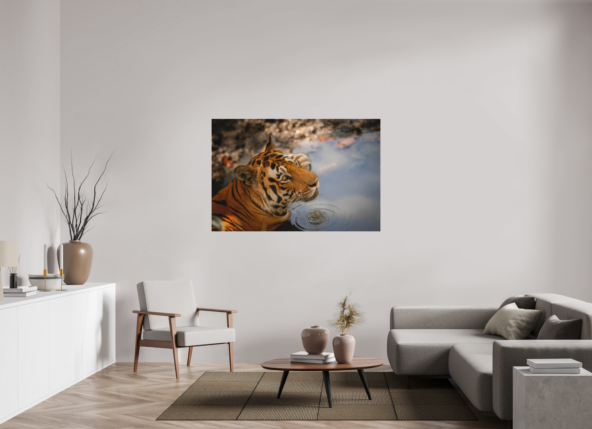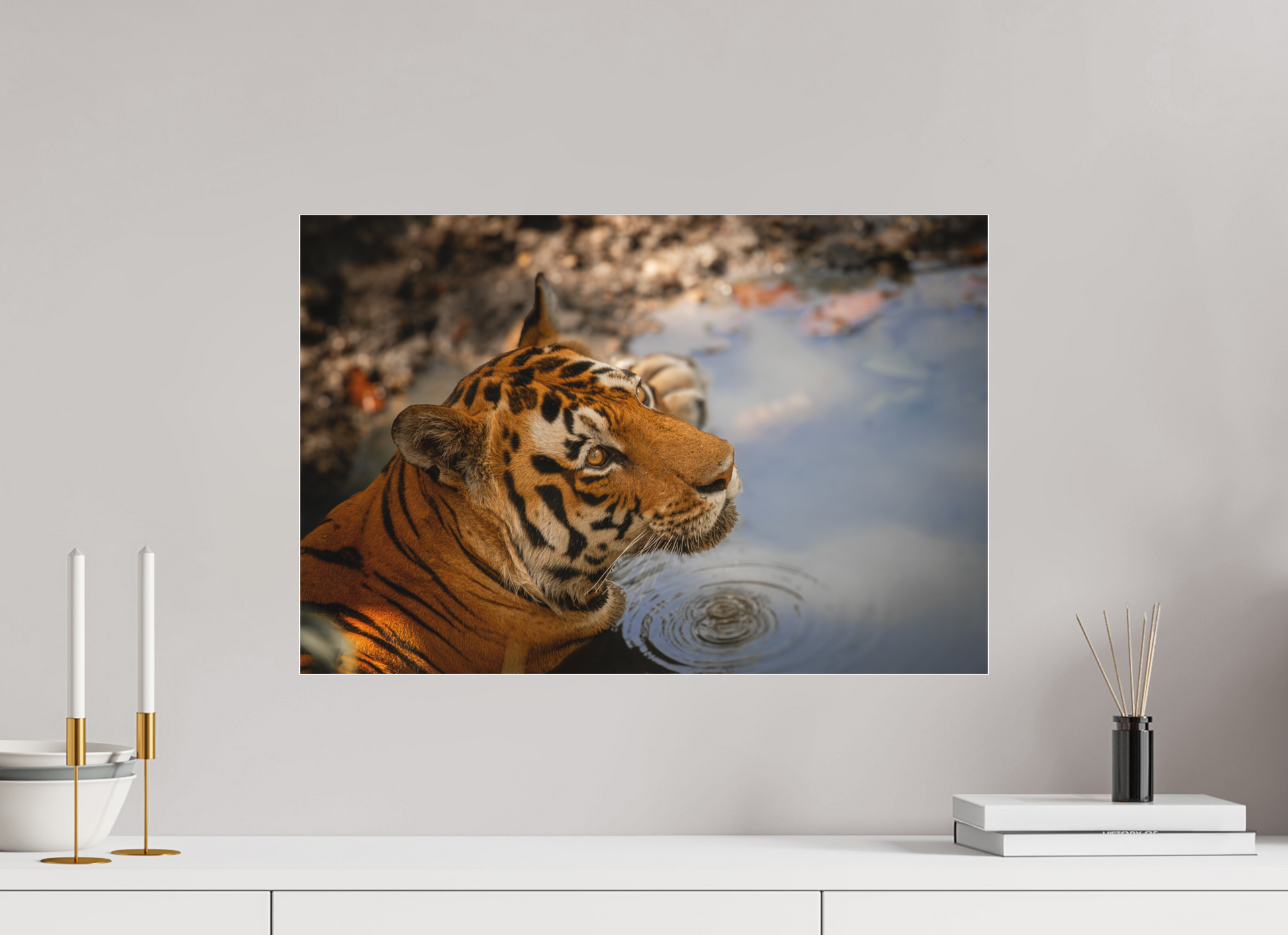 A tiger's gaze meets the calm waters, creating delicate ripples that echo the serene balance between power and peace in nature.