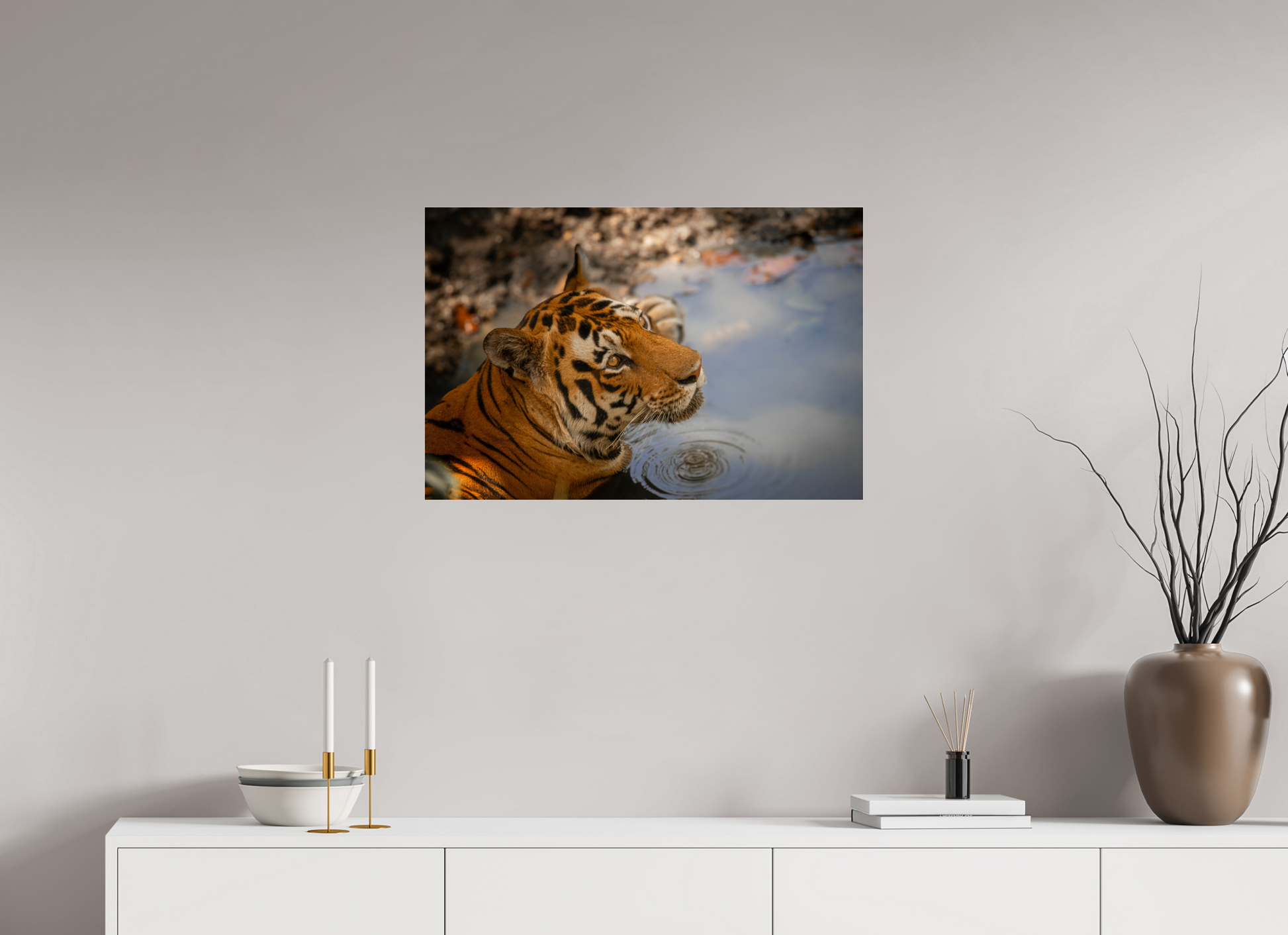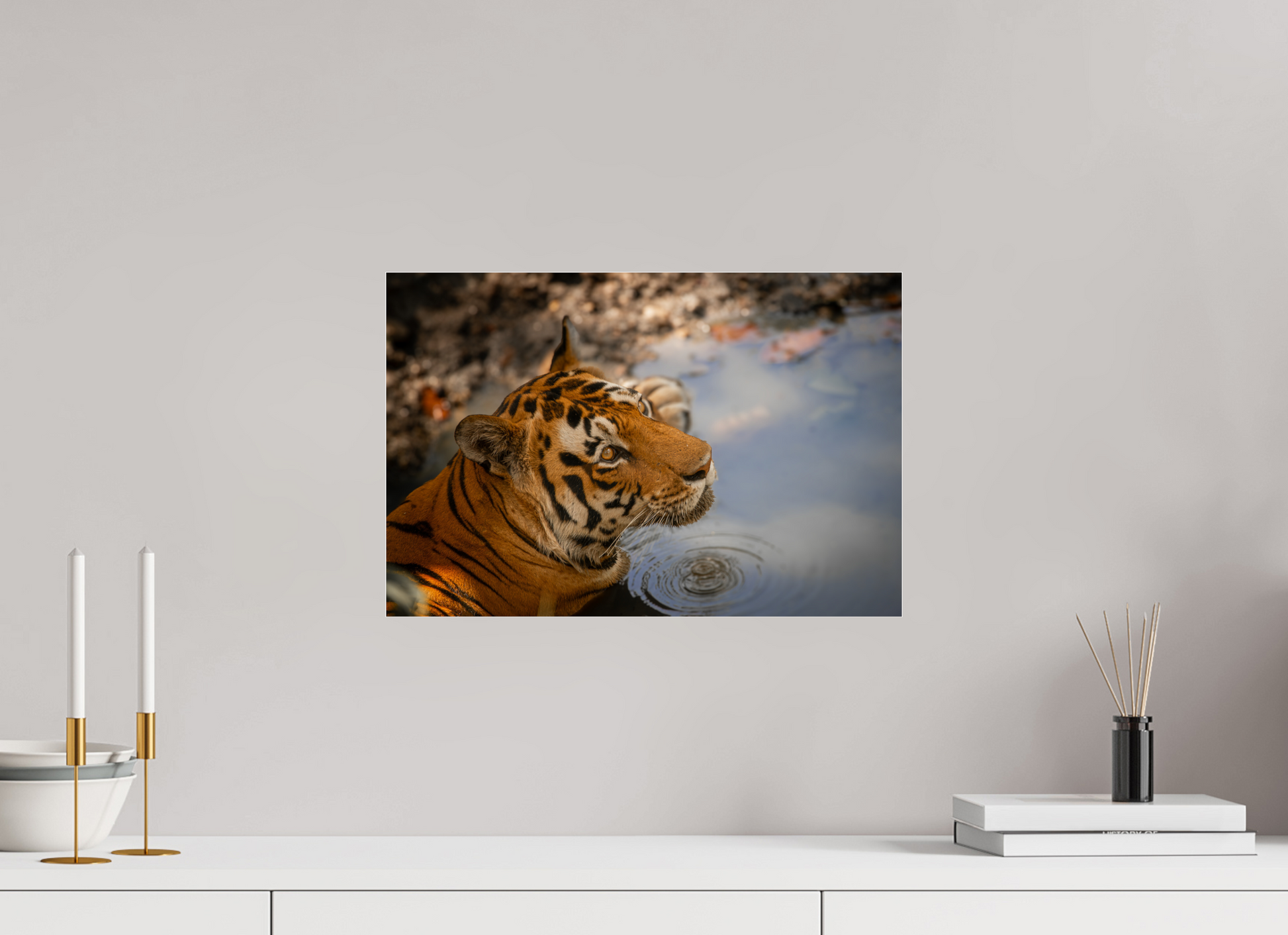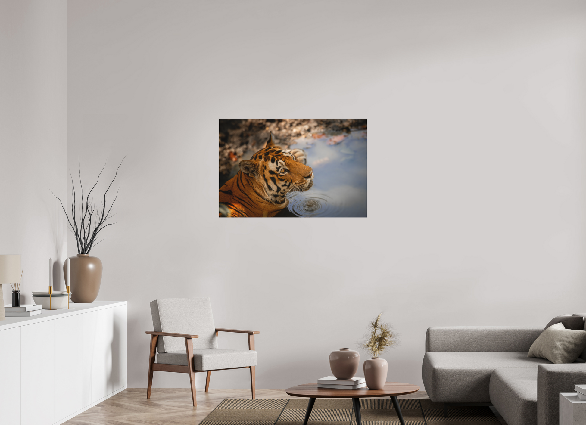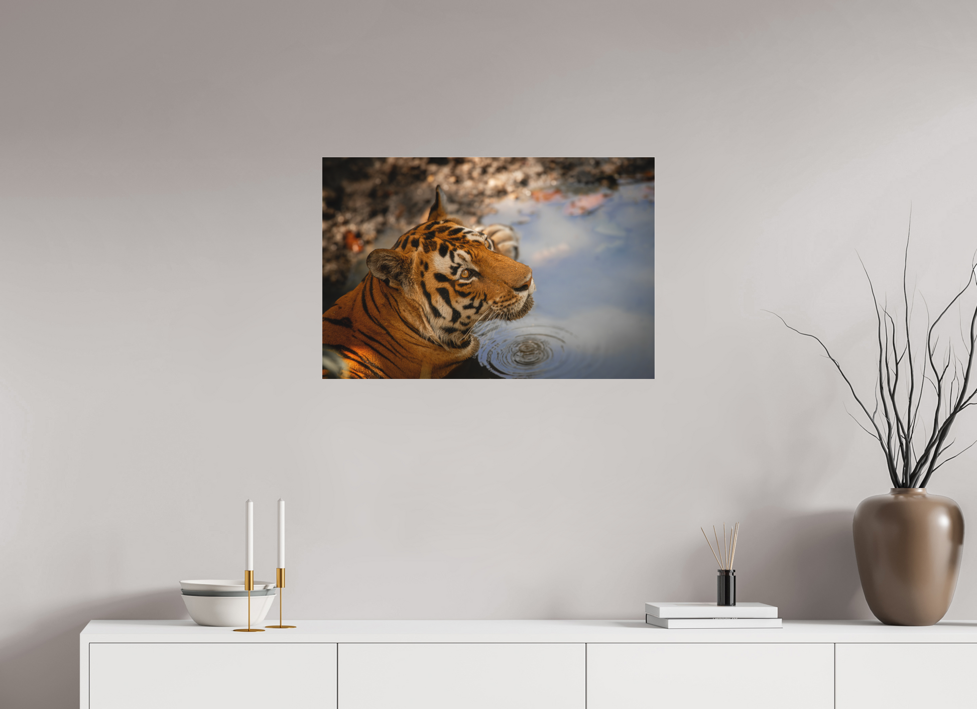 A tiger's gaze meets the calm waters, creating delicate ripples that echo the serene balance between power and peace in nature.