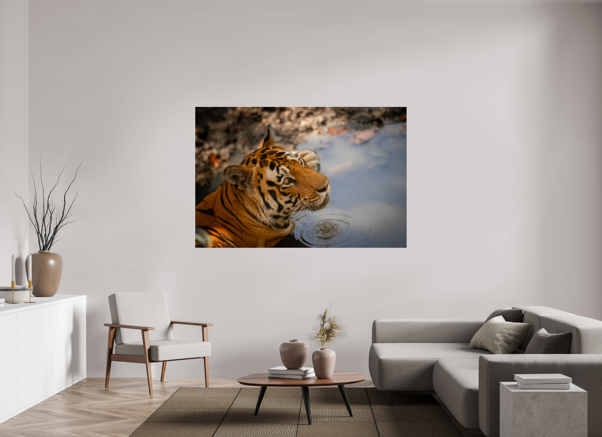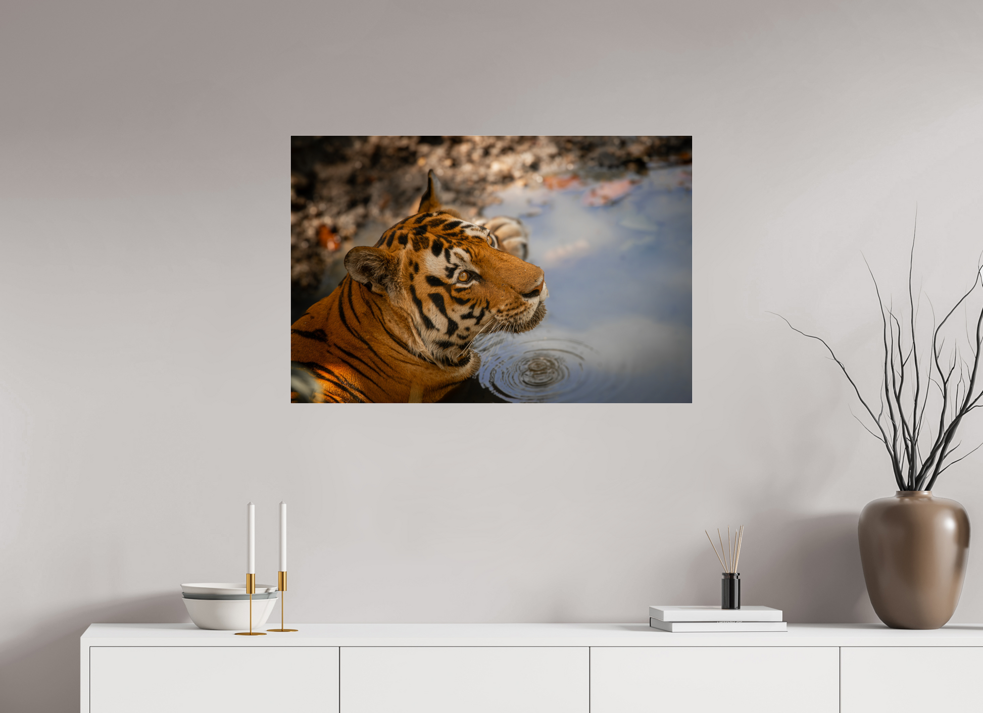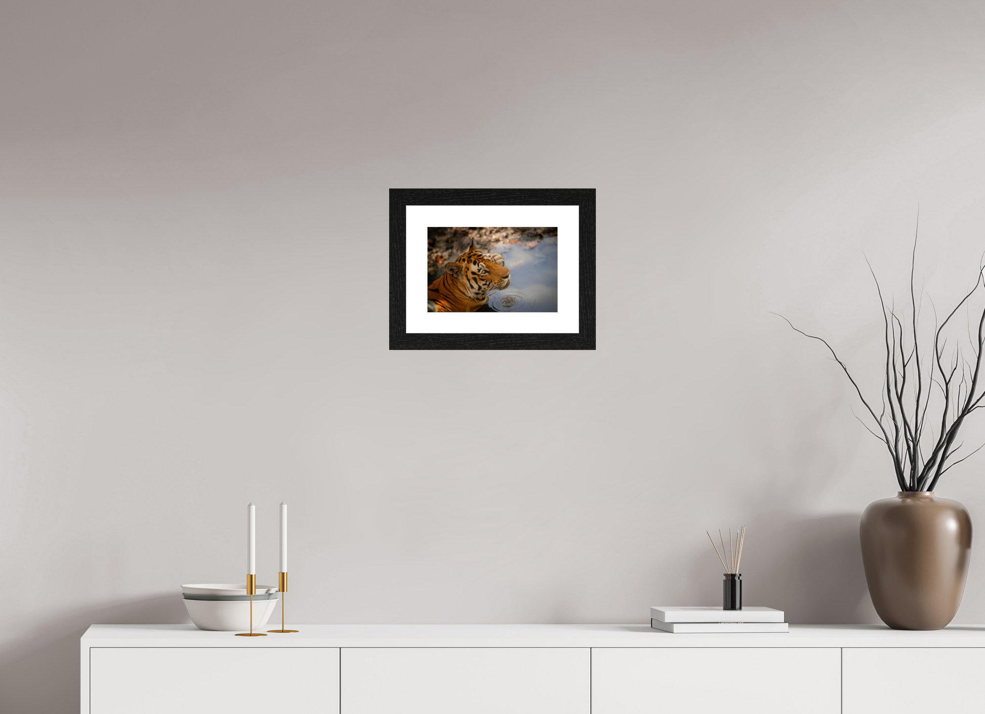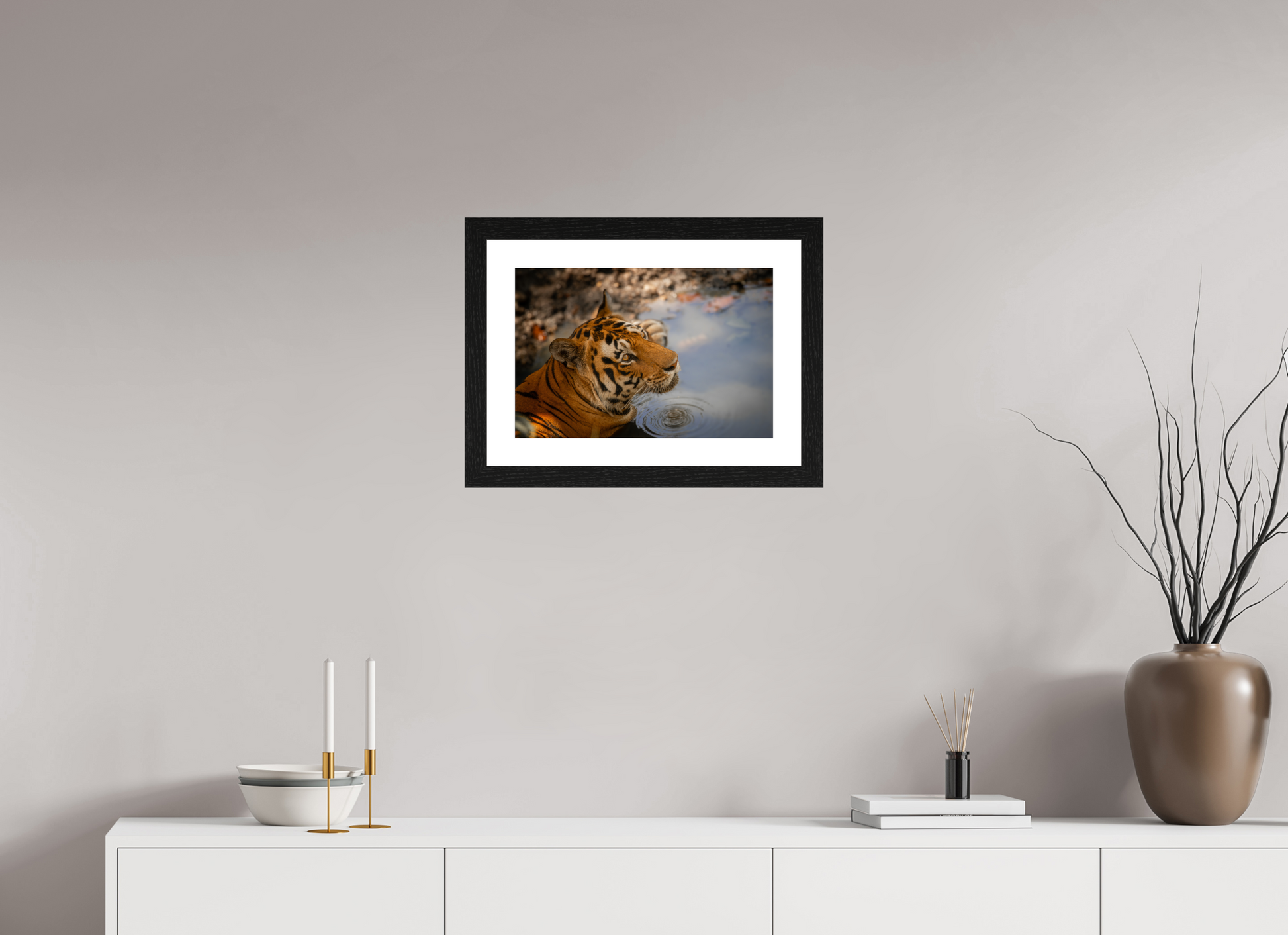 A tiger's gaze meets the calm waters, creating delicate ripples that echo the serene balance between power and peace in nature.