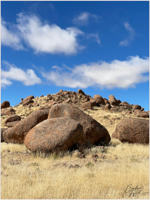 Boulders rest under a dramatic sky, capturing the rugged beauty of the desert terrain.