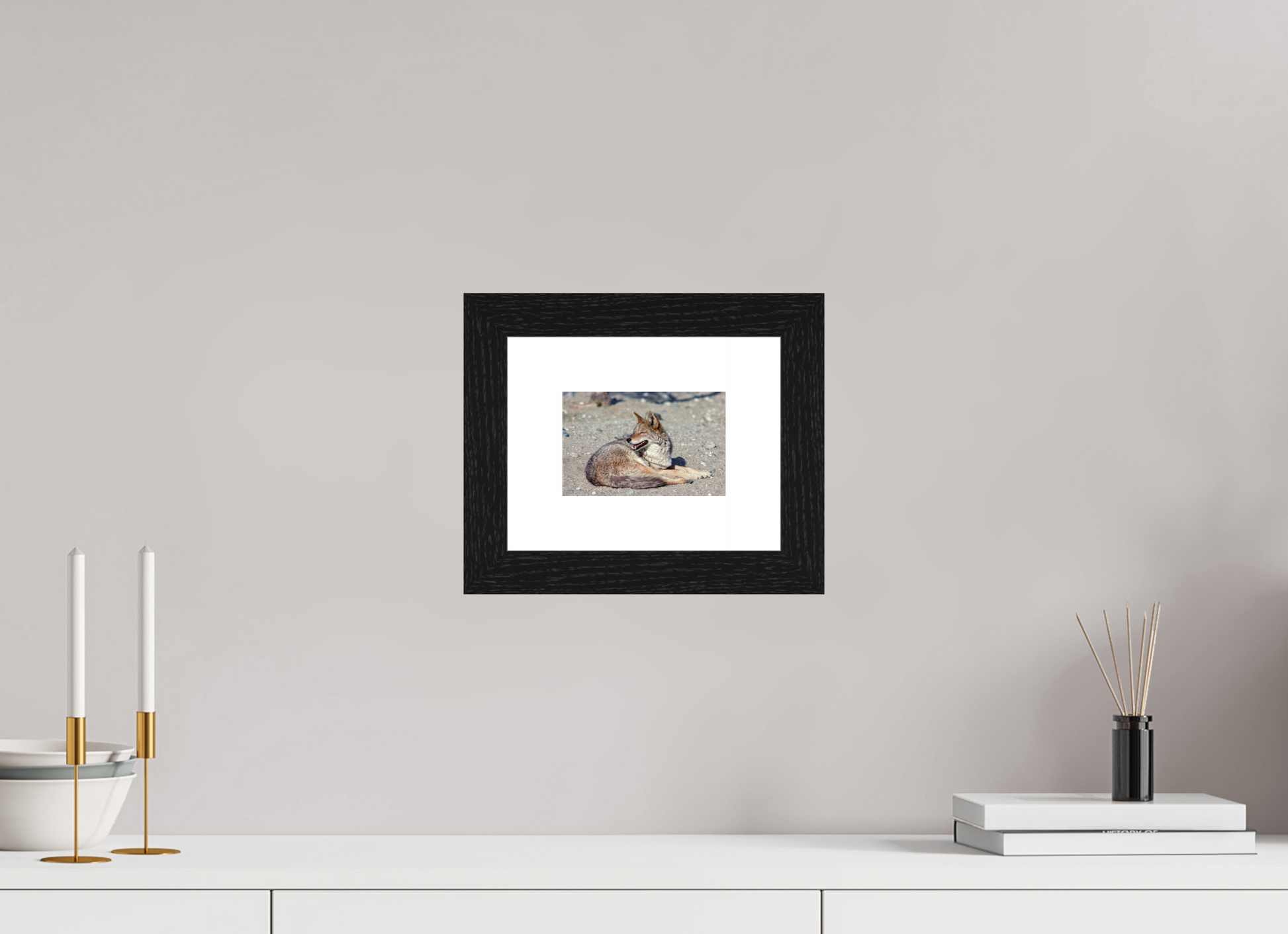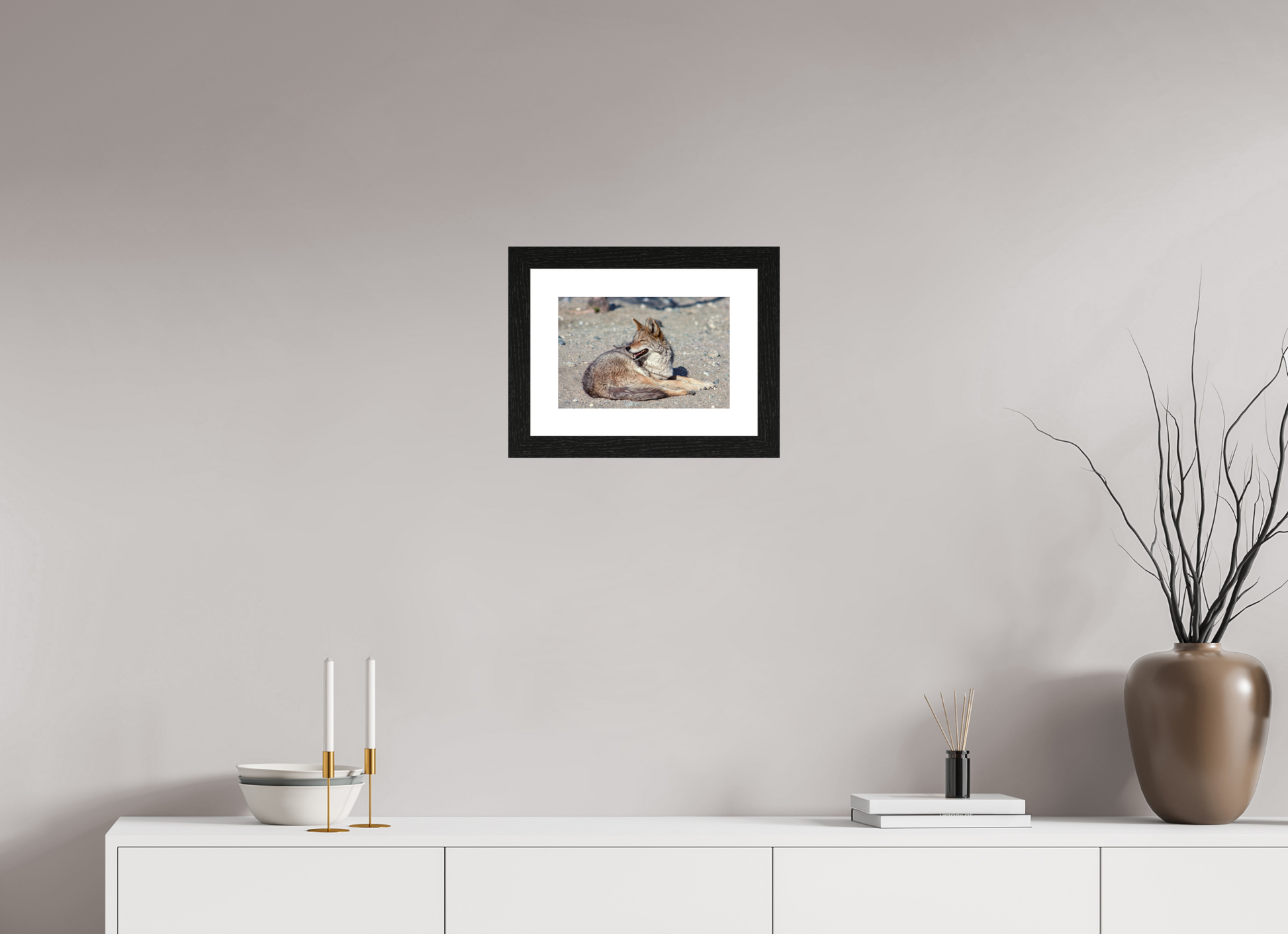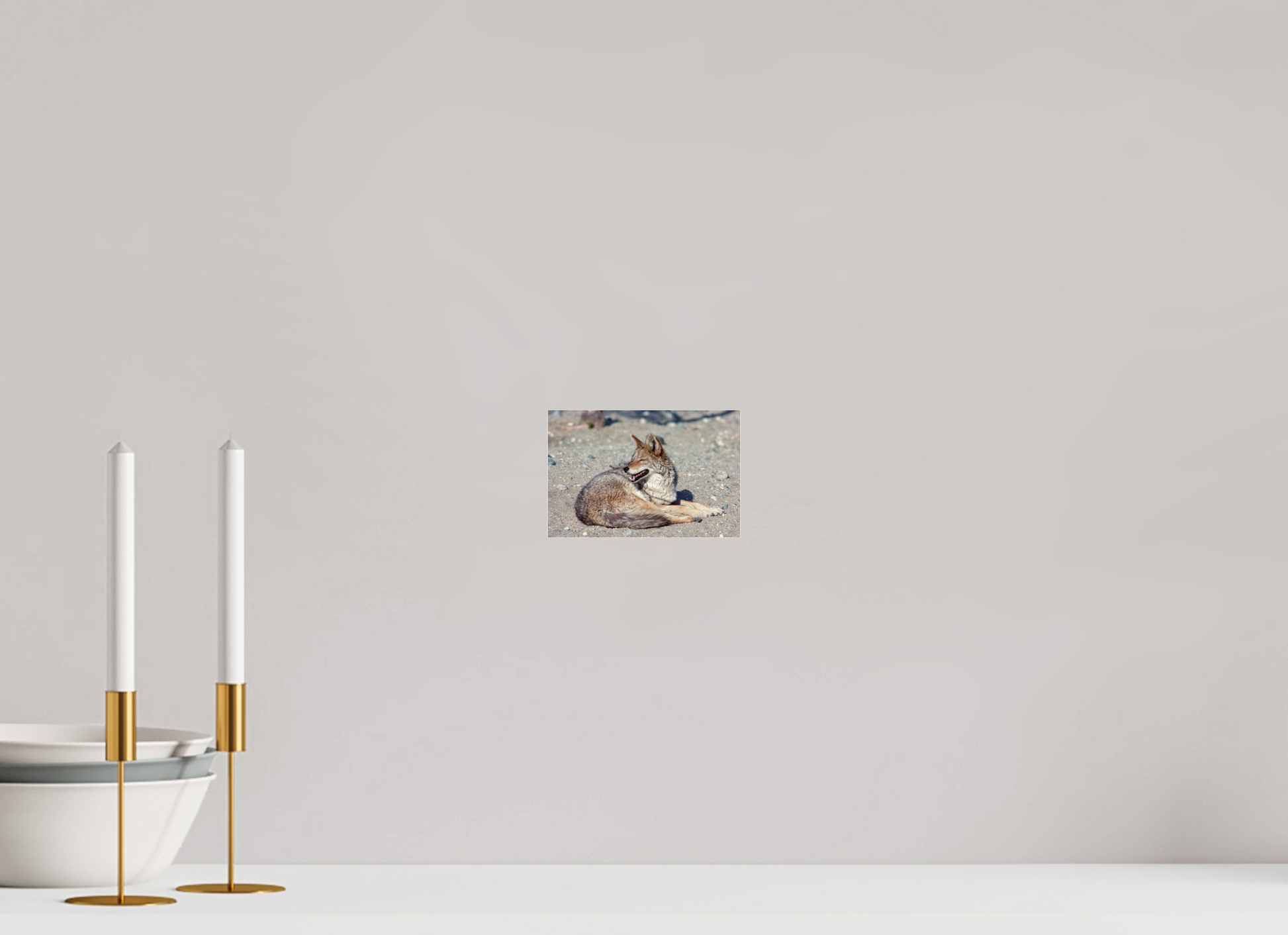 A coyote rests gracefully in the desert landscape, its keen eyes reflecting the wisdom of the wild, inviting you to appreciate the serene beauty of untamed nature.