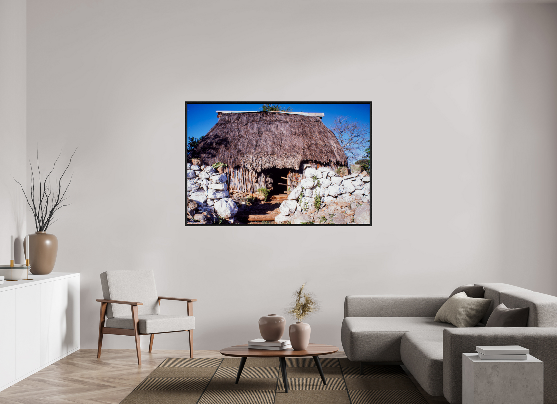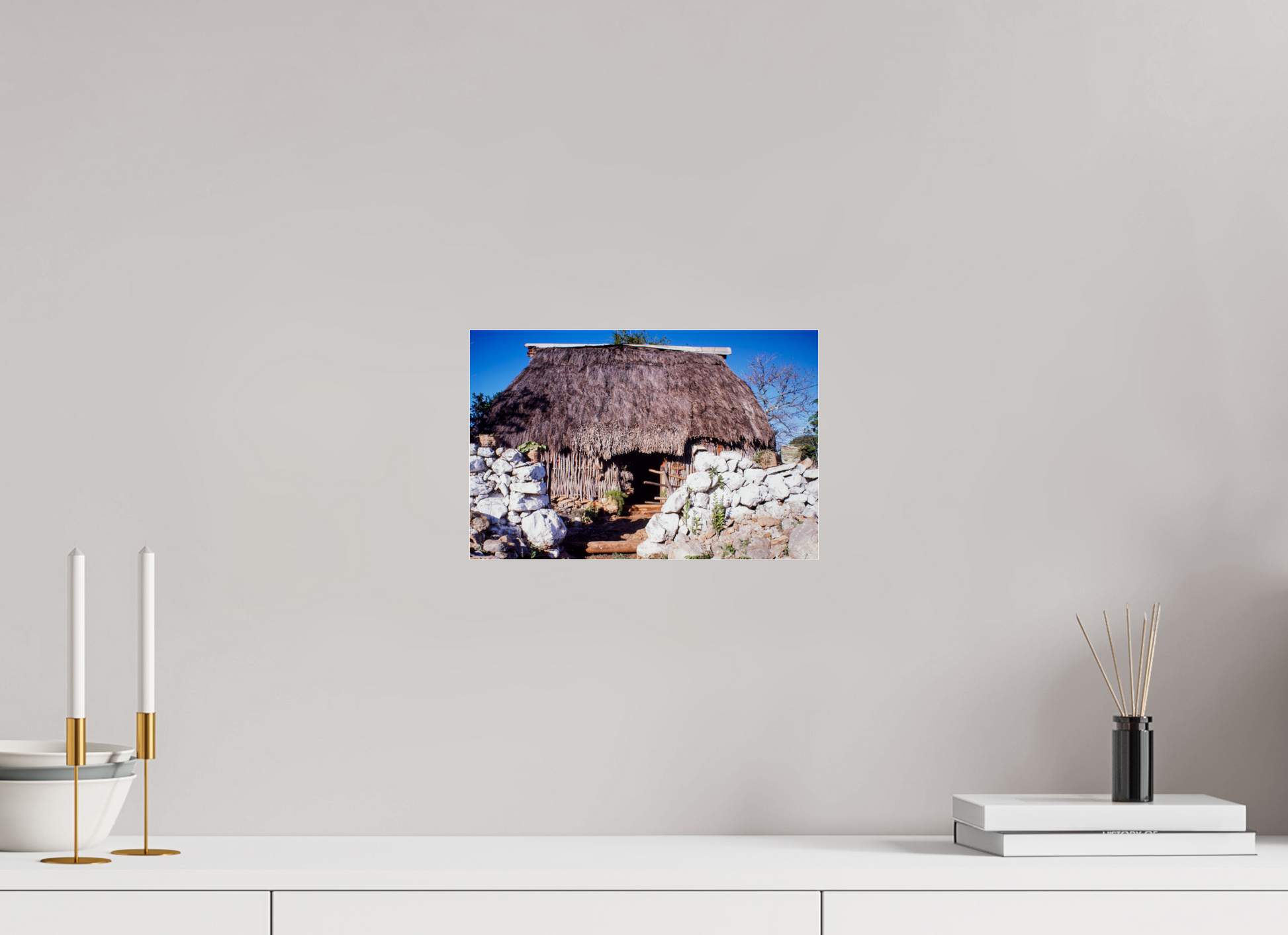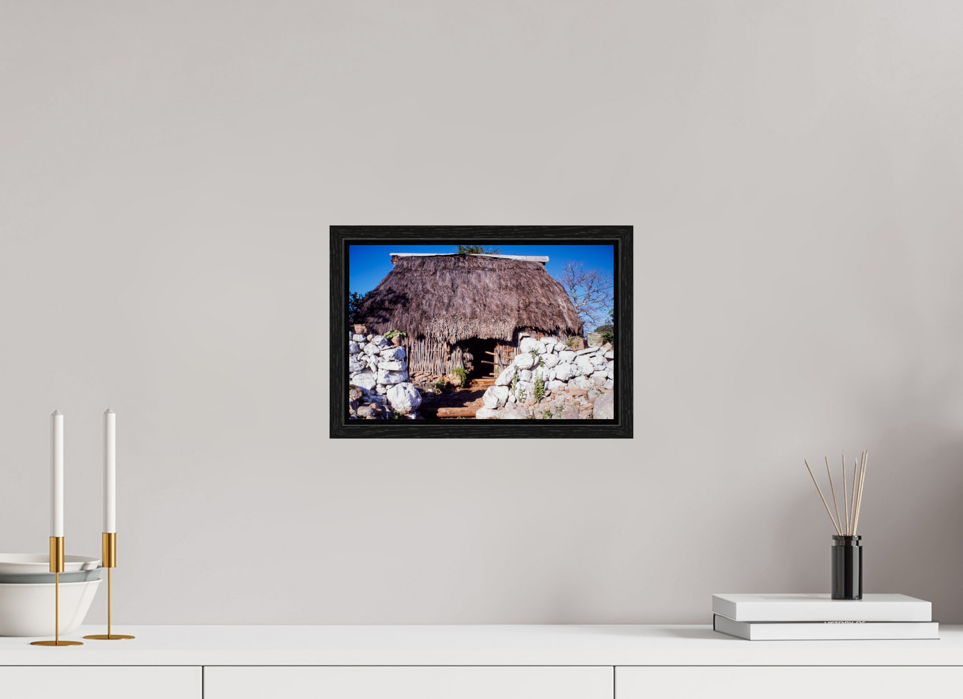 A quaint thatched hut nestles amidst stone walls, its humble structure offering a sanctuary of simplicity and tranquility, a testament to the enduring beauty of rural life.