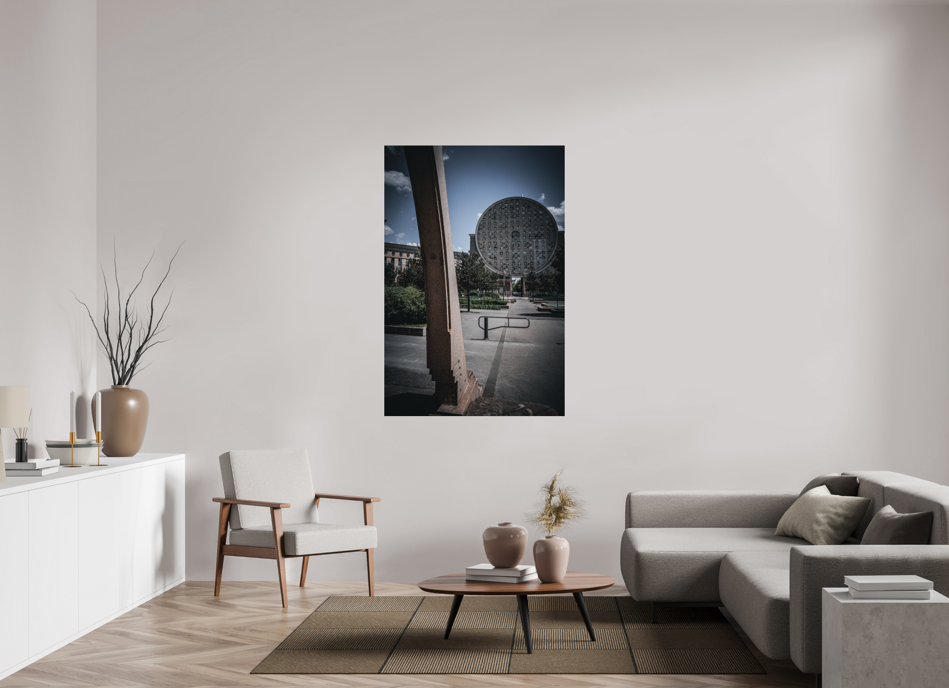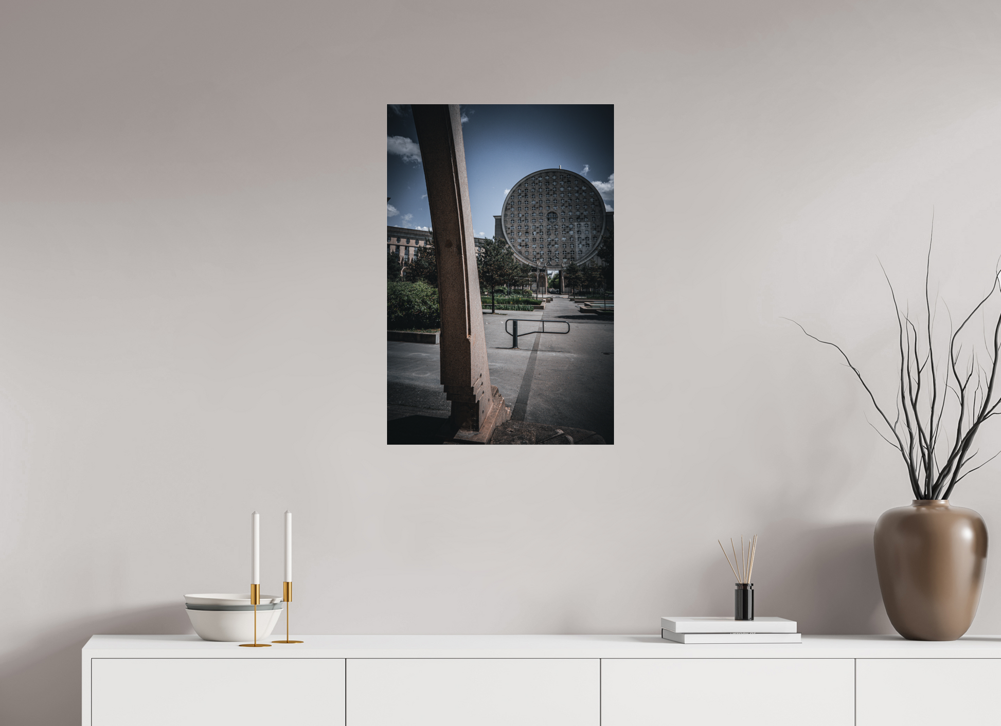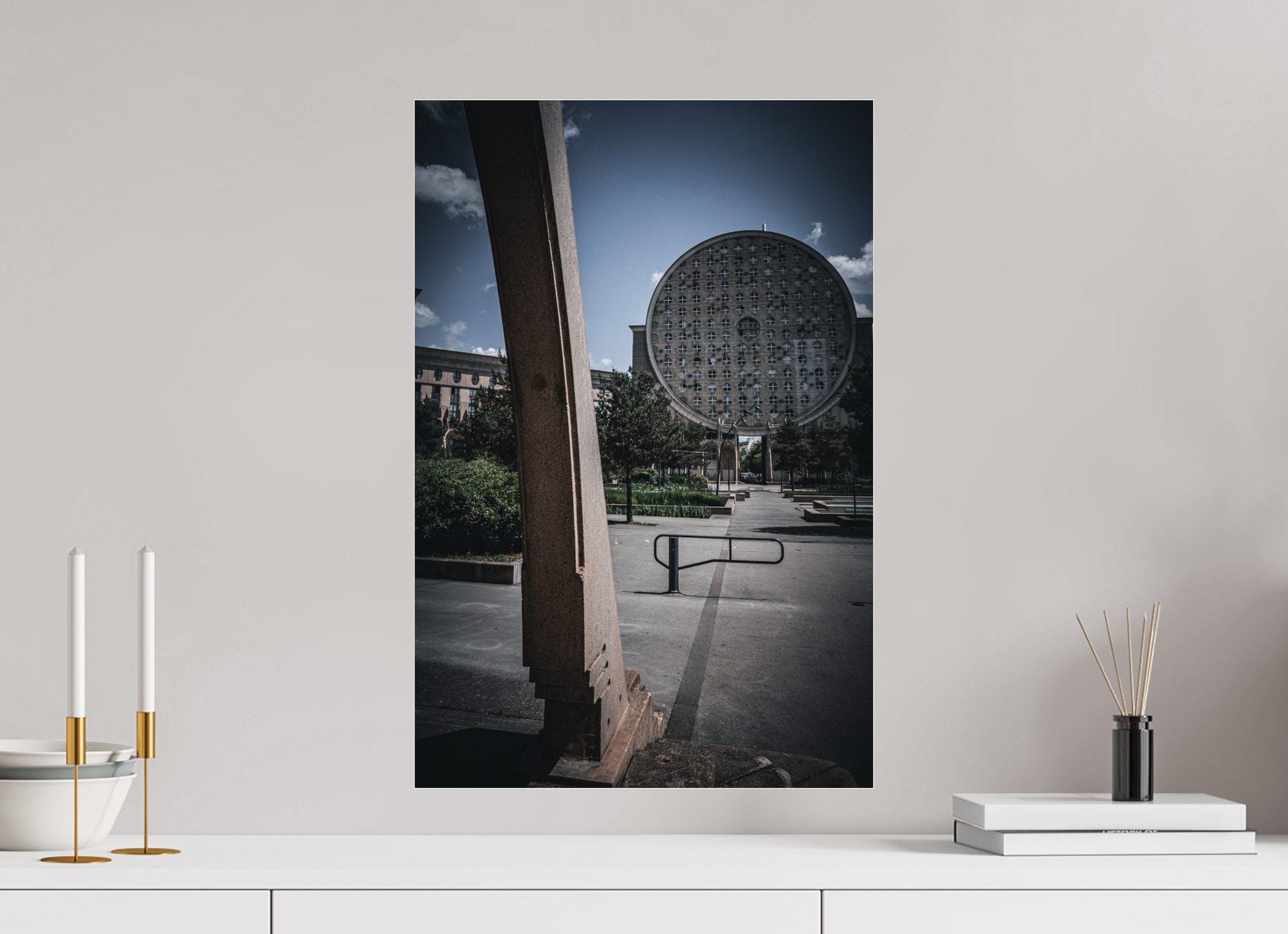 In this striking composition, the bold lines and stark contrasts of modernist architecture are beautifully captured. The circular forms and the interplay of light and shadow accentuate the geometric precision and the unyielding nature of the materials used, creating a visually compelling scene. The perspective highlights the grandeur and imposing nature of the buildings, showcasing the unique aesthetic of modernism. Arènes de Picasso, located in Noisy-le-Grand, is a prime example of modernist architecture designed by architect Manuel Núñez Yanowsky. This style, known for its innovative use of shapes and materials, often features a blend of classical and contemporary elements. The design for Arènes de Picasso is emblematic of this style, showcasing a complex of residential buildings that challenge conventional aesthetics with their bold, geometric shapes and unique structural forms. The complex is celebrated for its innovative approach to urban living, integrating communal spaces and residential areas in a uniquely interconnected design. An interesting anecdote about Arènes de Picasso is that its construction involved extensive community consultations to ensure that the design met the needs and aspirations of future residents.