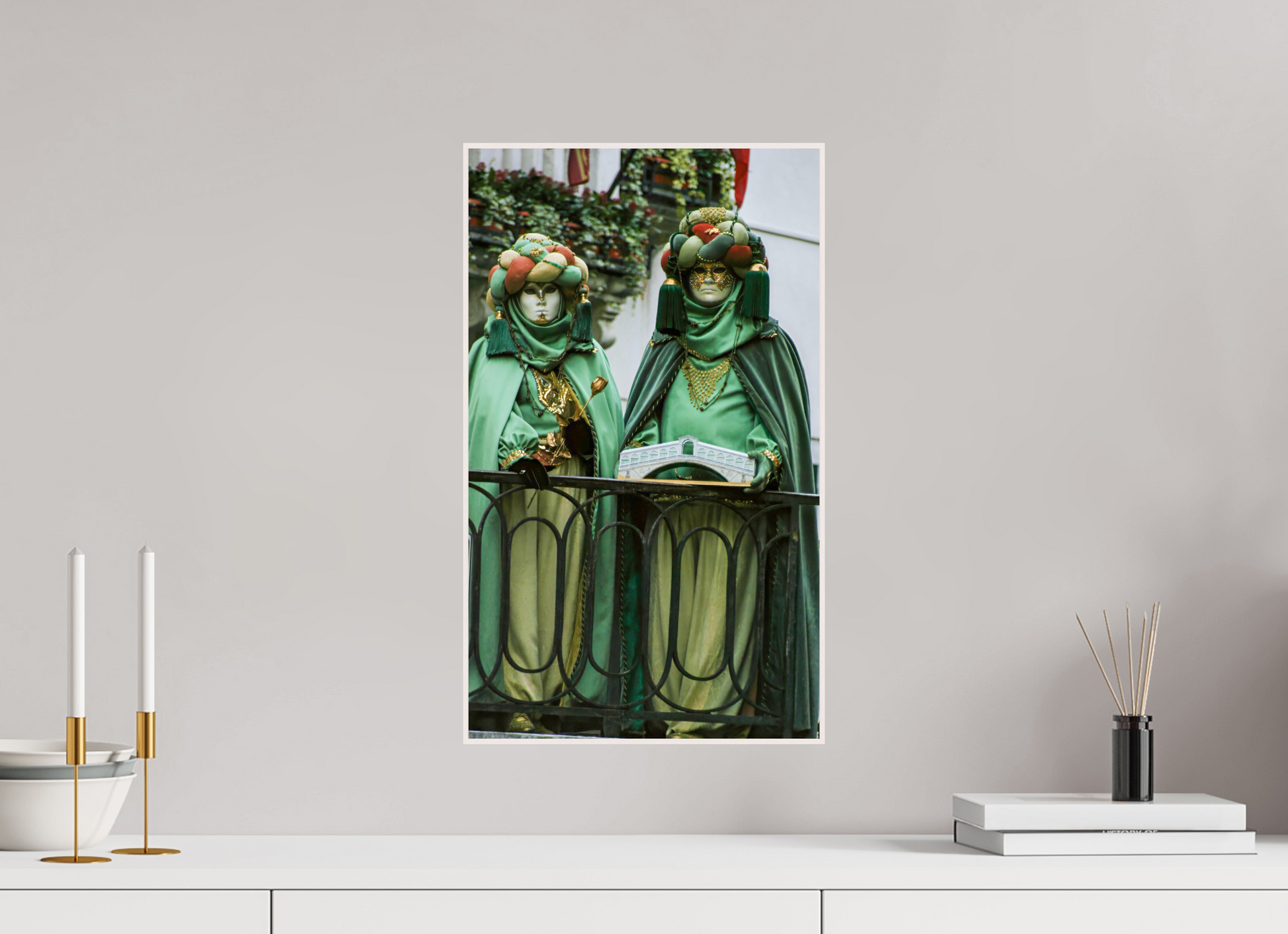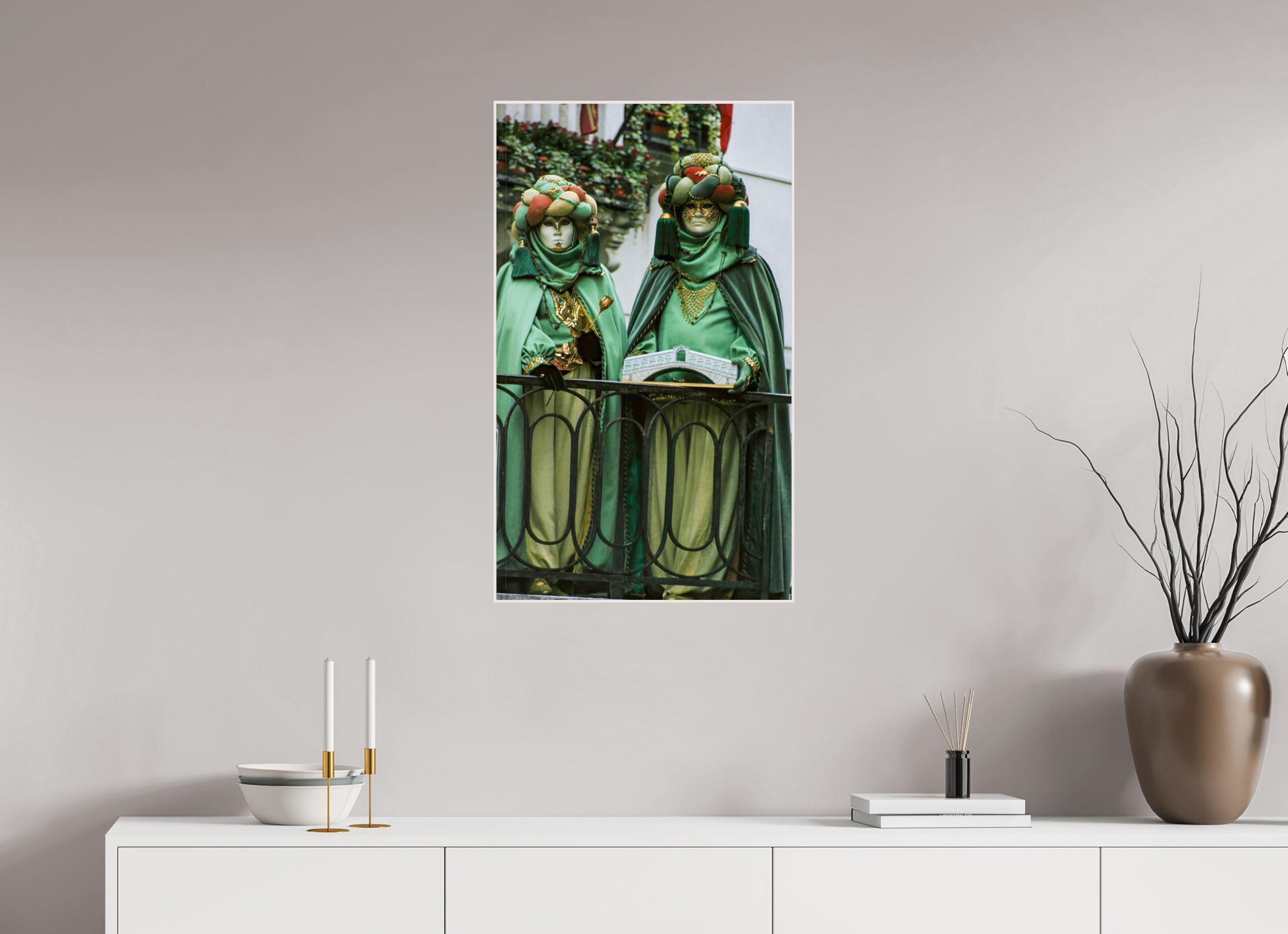 This image captures the enchanting allure of the Carnival of Venice with two figures adorned in matching green and gold costumes. The intricate details and vibrant colors of their attire reflect the city's rich history of craftsmanship and artistry. The masks, embellished with jewels and feathers, add a touch of regality and mystery, embodying the spirit of the Carnival.
