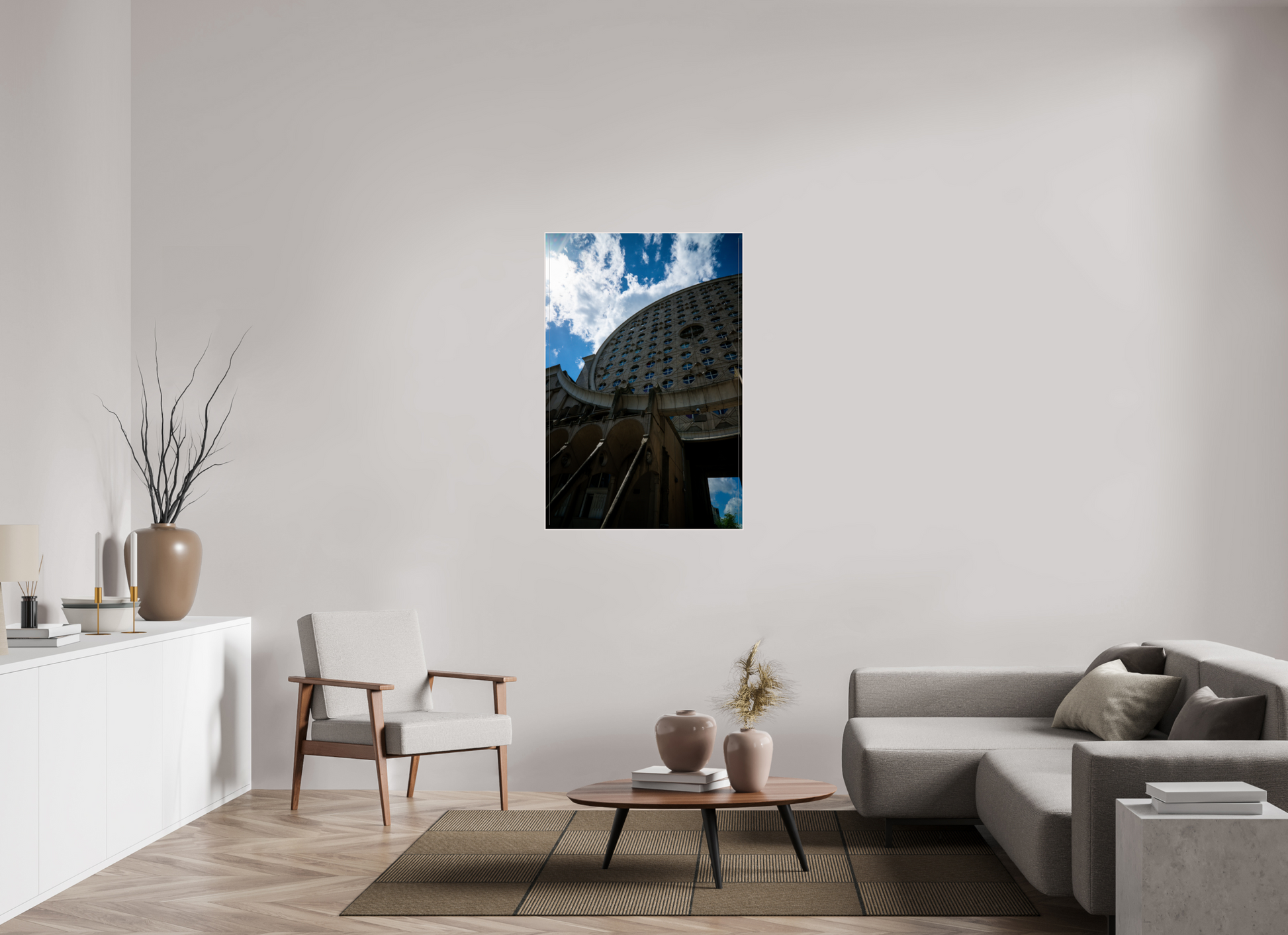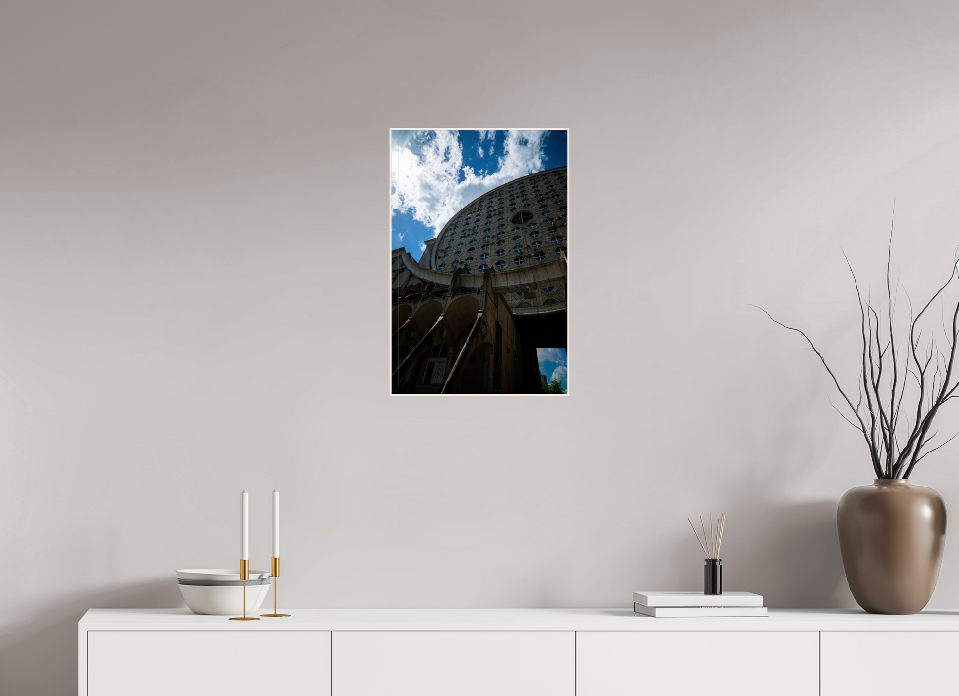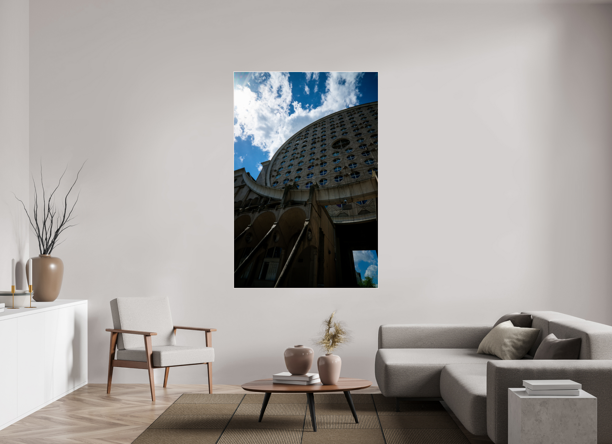 Presenting a dramatic perspective of the modernist architecture that defines Arènes de Picasso, this photograph highlights the interplay of angular forms and the stark contrast between the concrete structures and the sky. The powerful geometric lines and the imposing presence of the buildings are captured, showcasing the essence of modernist design.