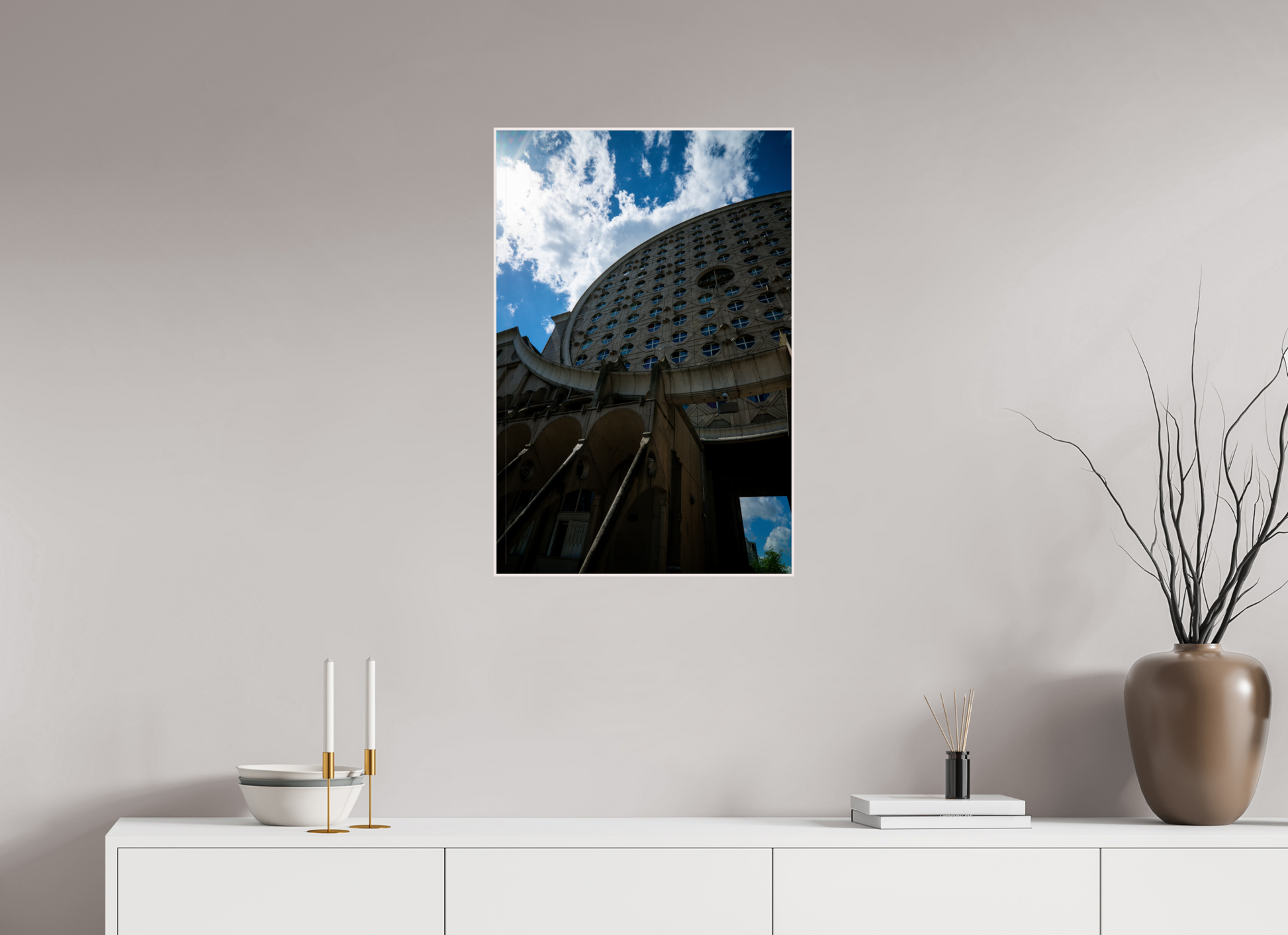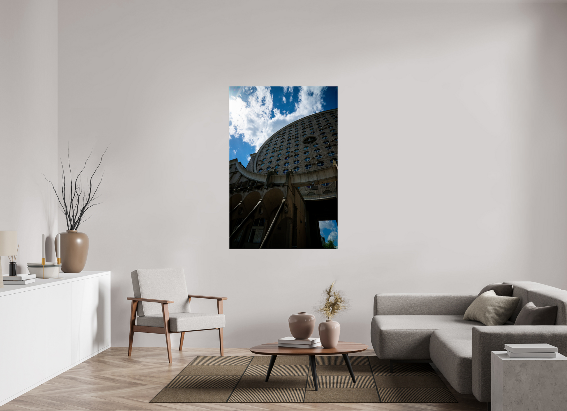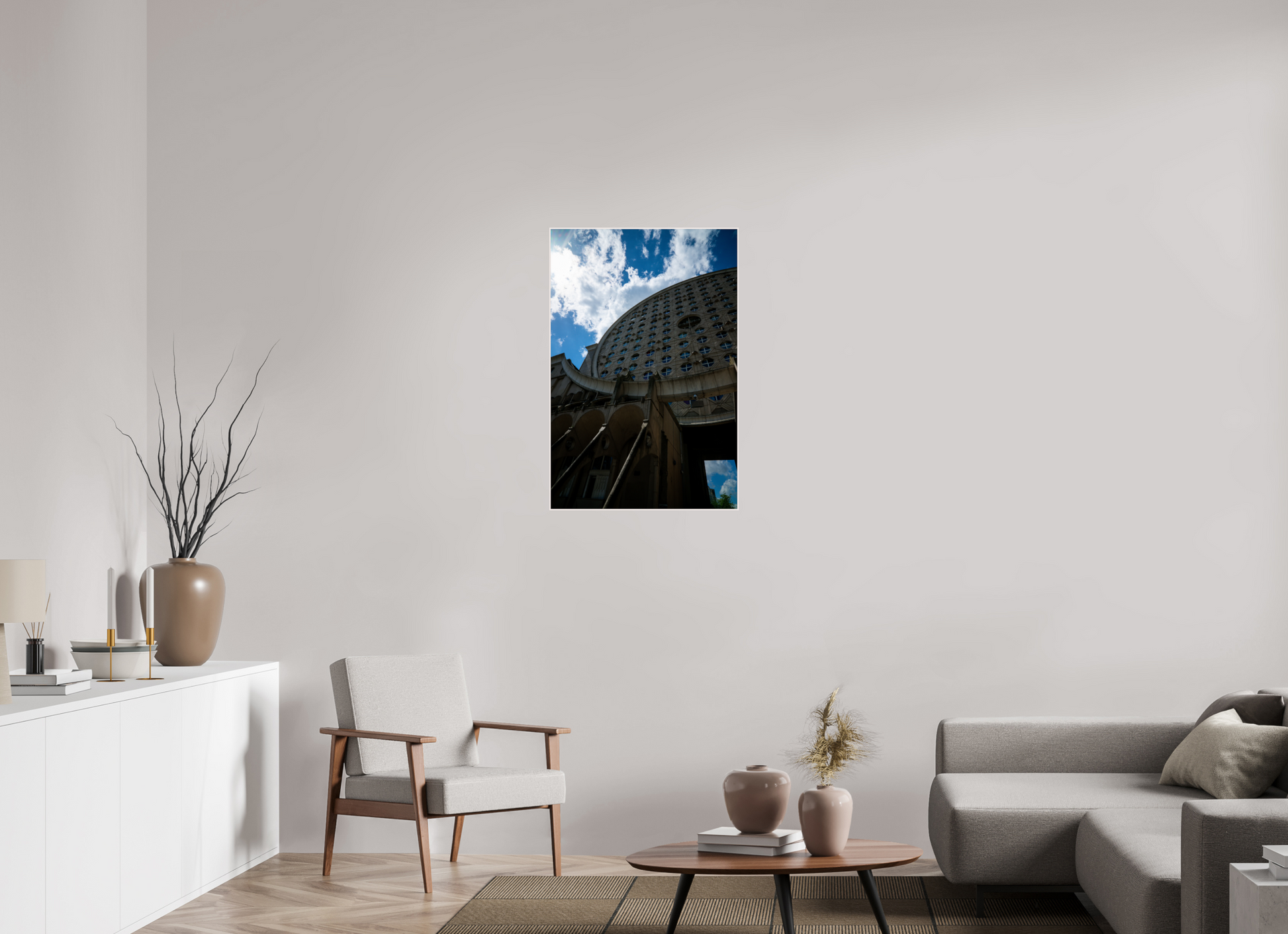 Presenting a dramatic perspective of the modernist architecture that defines Arènes de Picasso, this photograph highlights the interplay of angular forms and the stark contrast between the concrete structures and the sky. The powerful geometric lines and the imposing presence of the buildings are captured, showcasing the essence of modernist design.