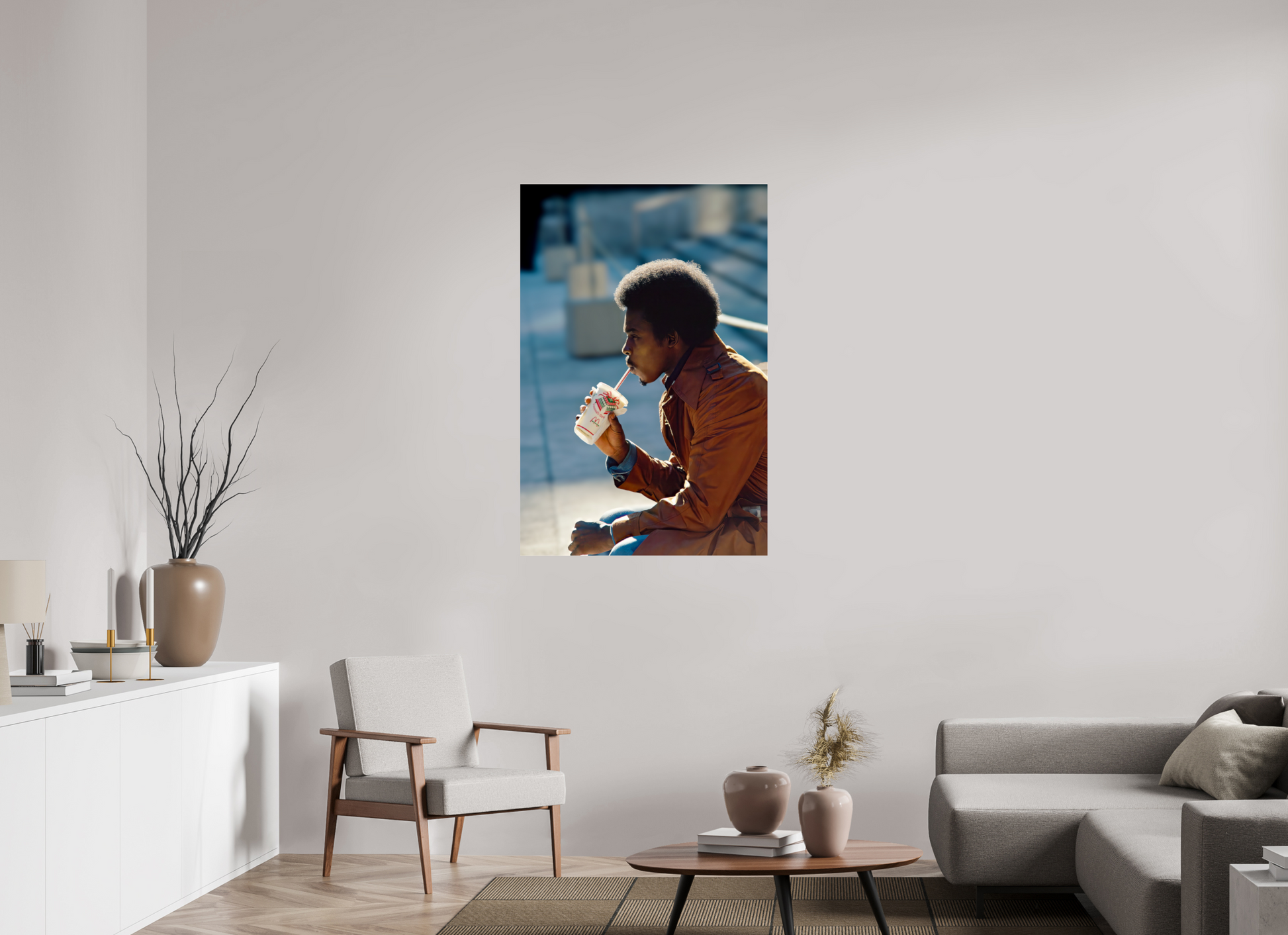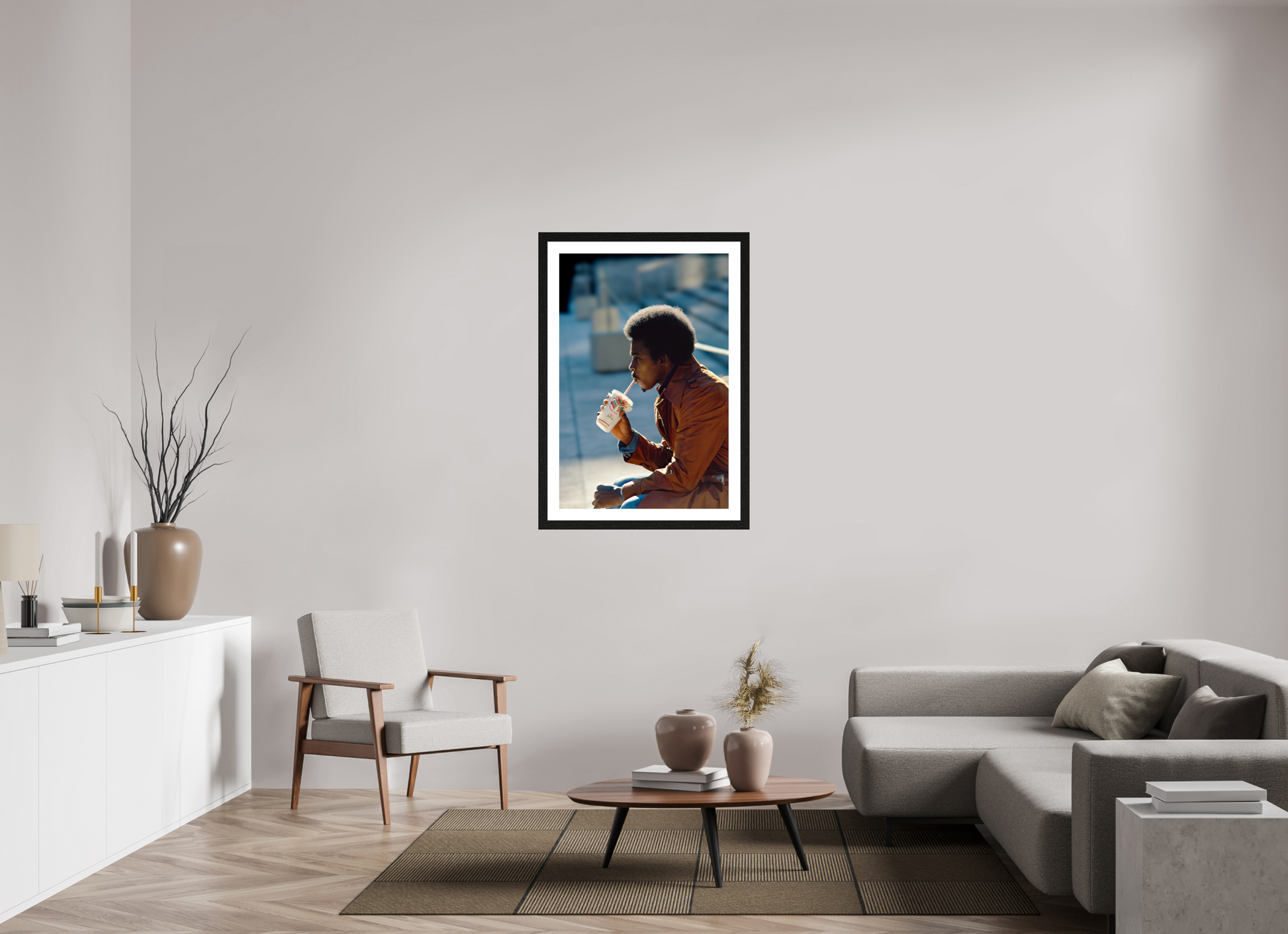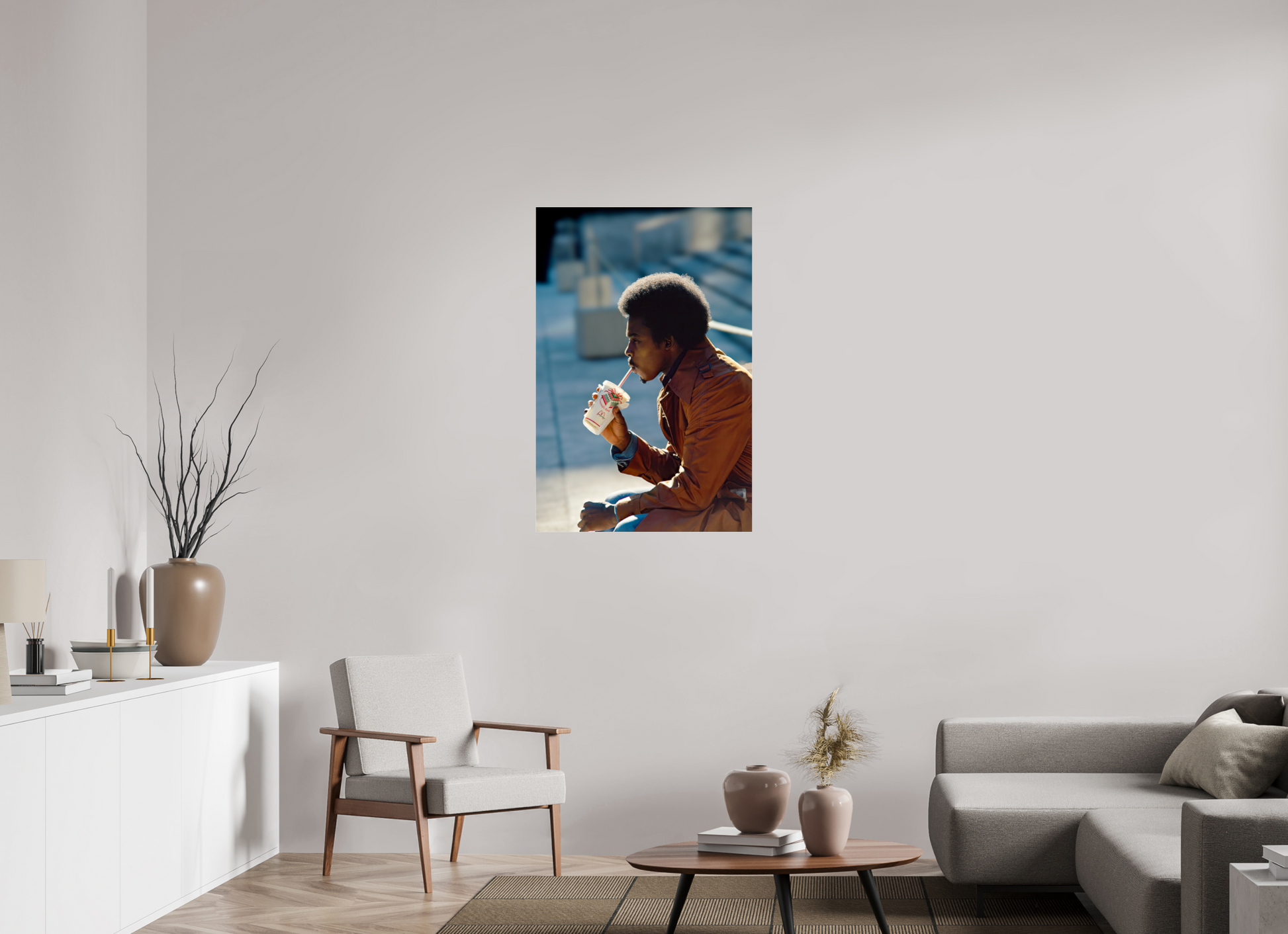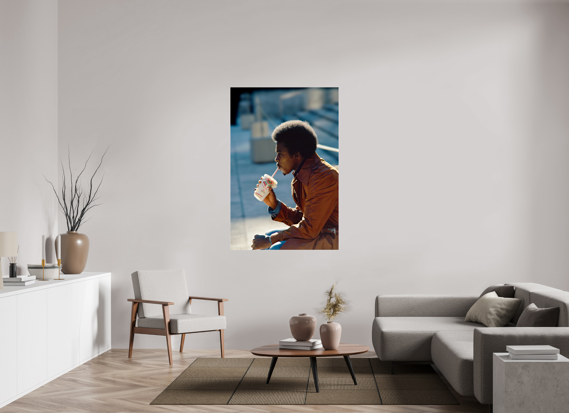 A young man sits in quiet contemplation, the soft glow of sunlight illuminating his face as he sips from a straw, capturing a moment of serenity amidst the urban backdrop.
