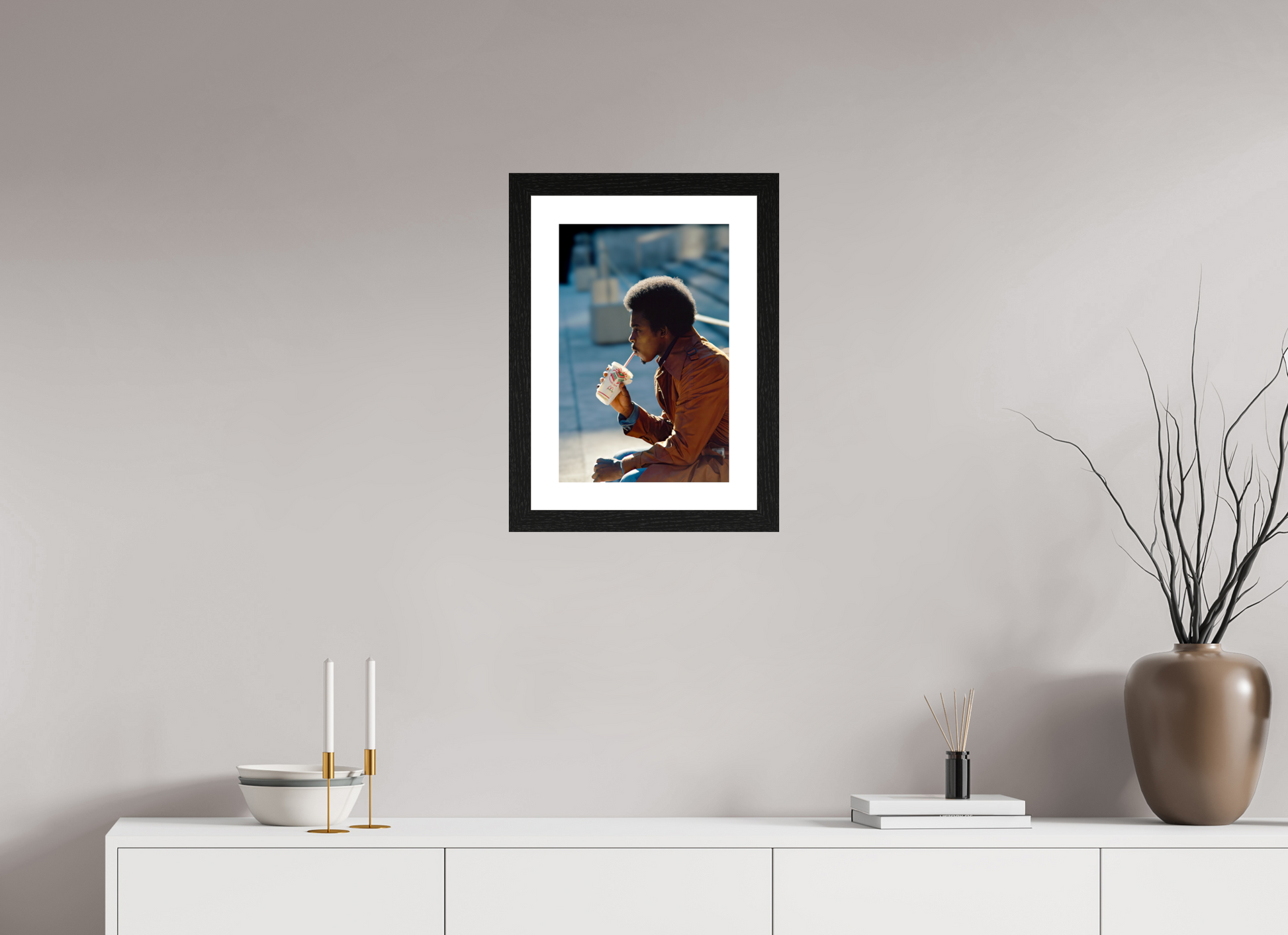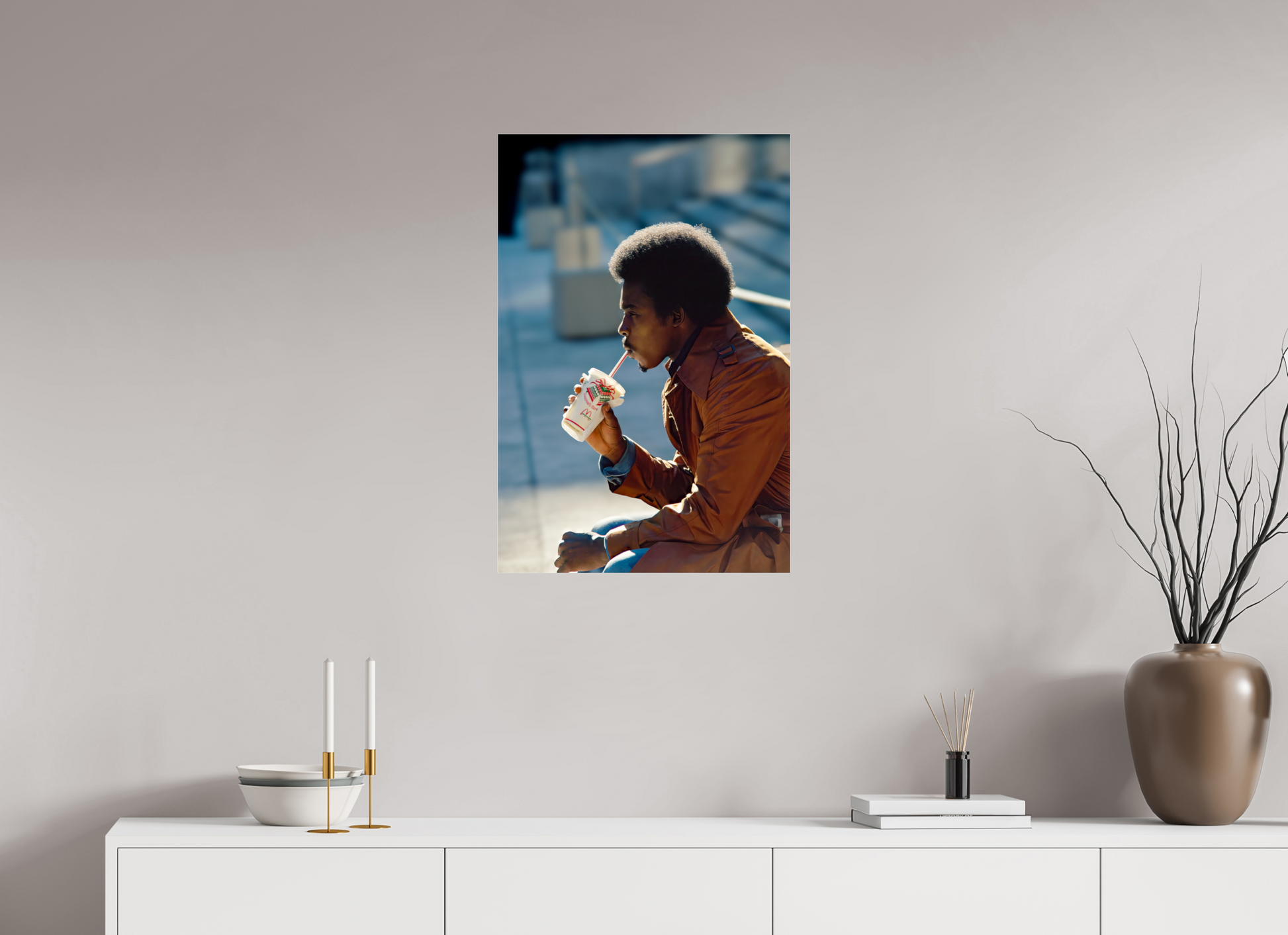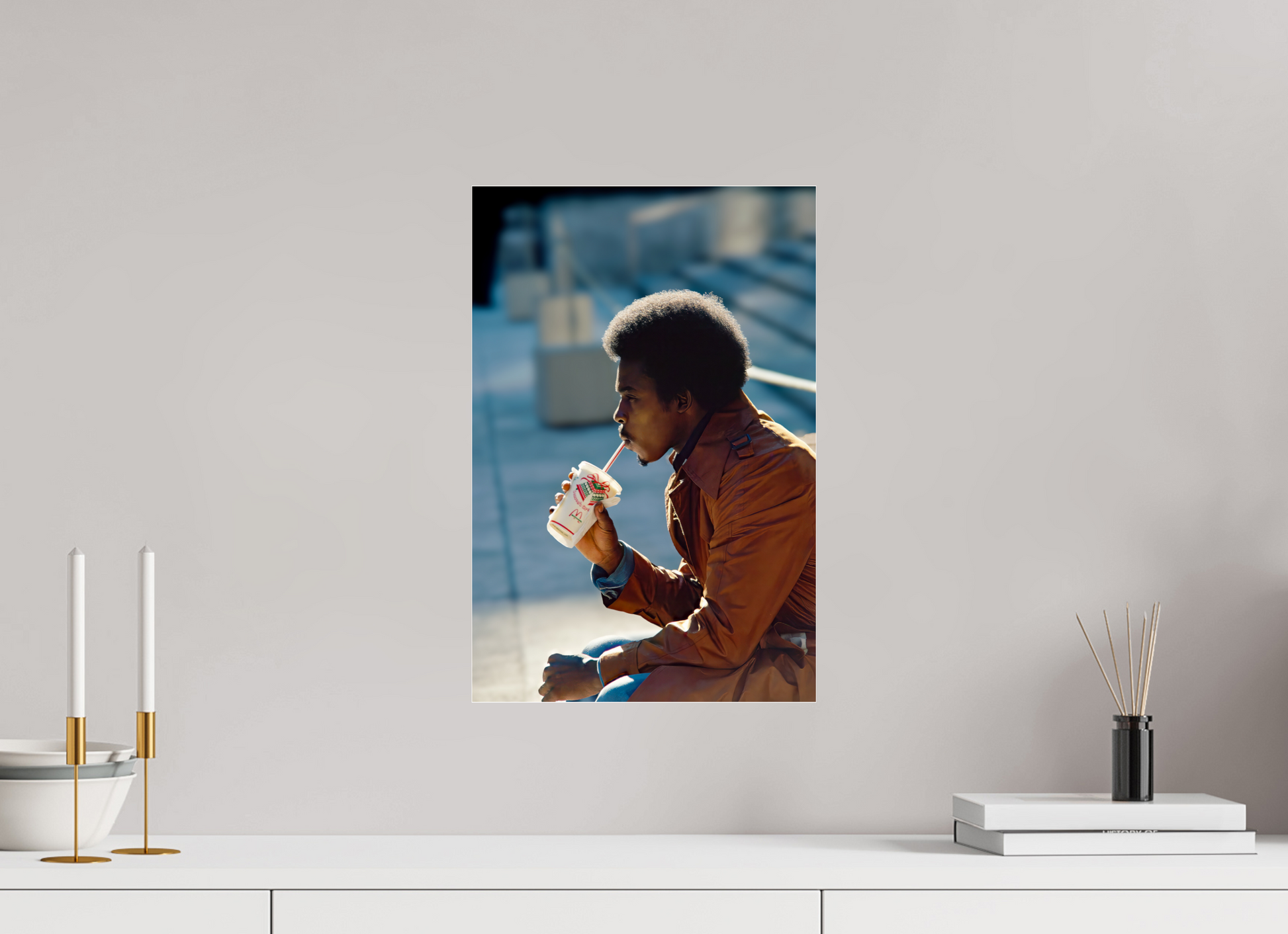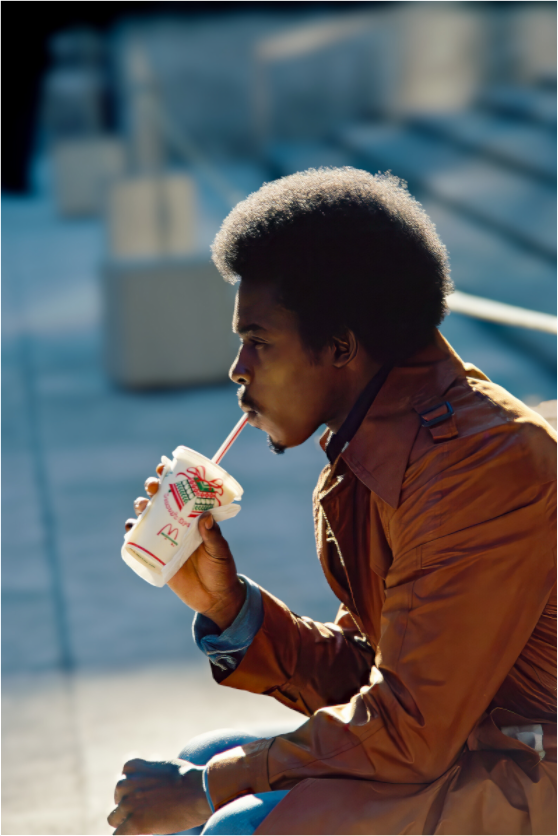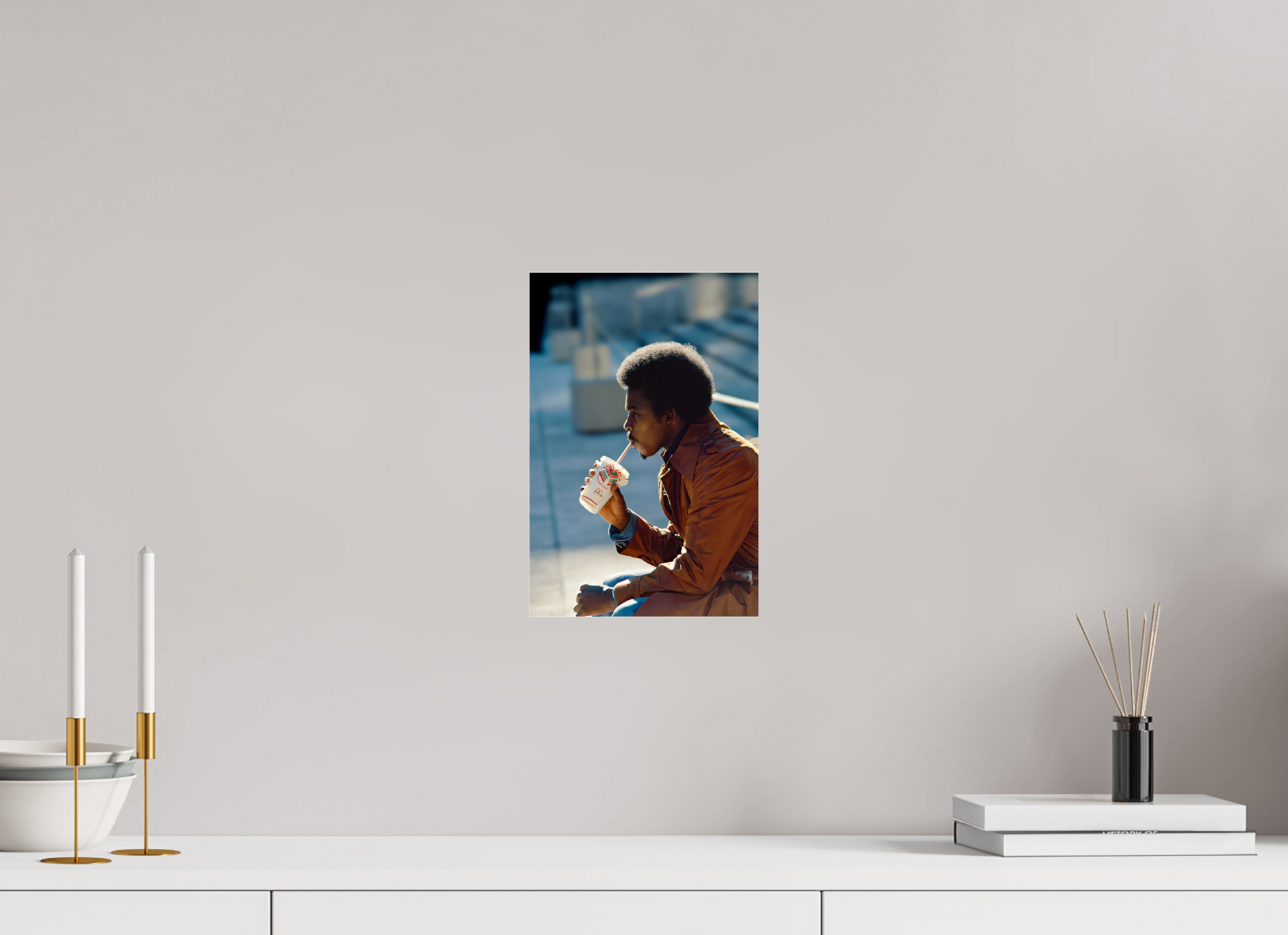 A young man sits in quiet contemplation, the soft glow of sunlight illuminating his face as he sips from a straw, capturing a moment of serenity amidst the urban backdrop.