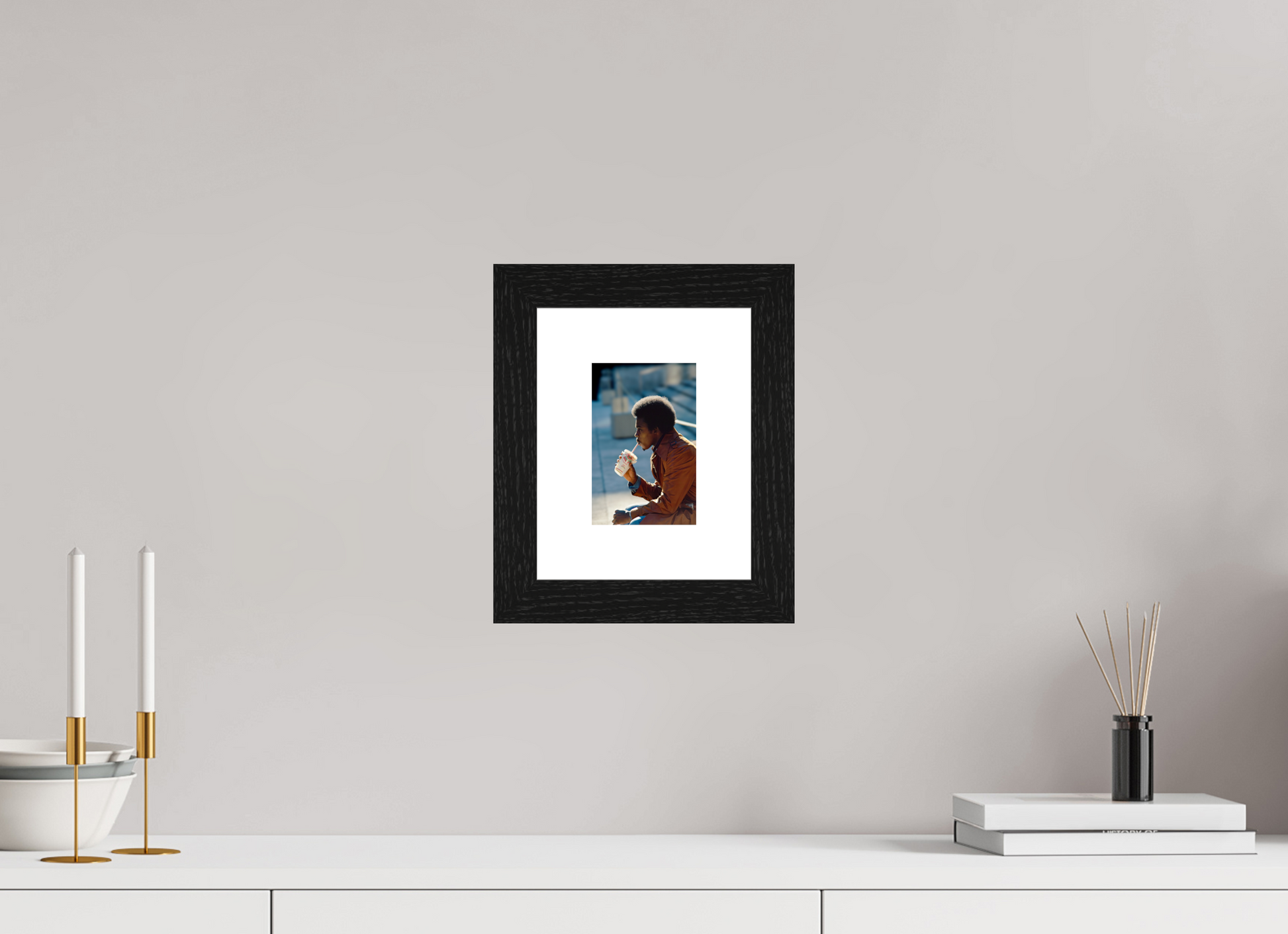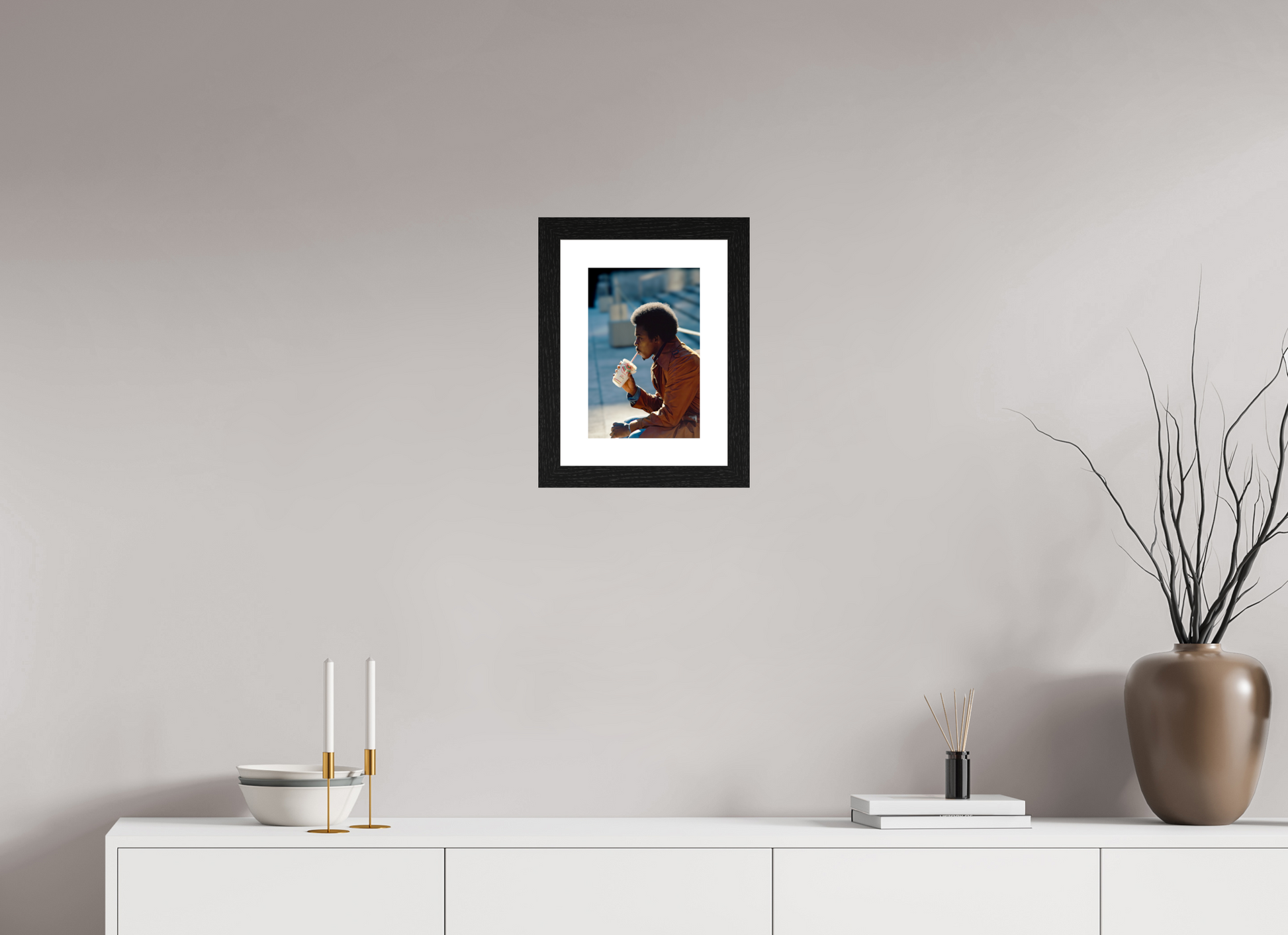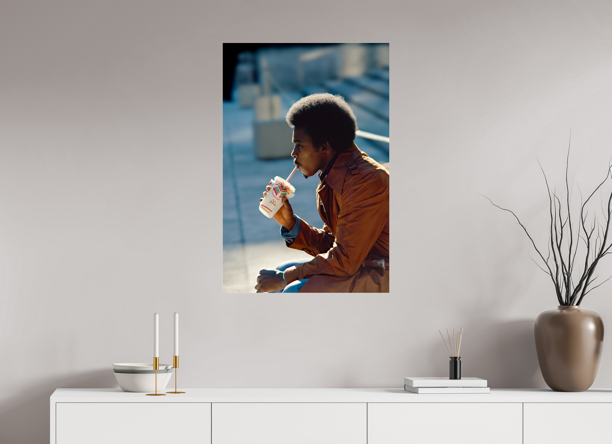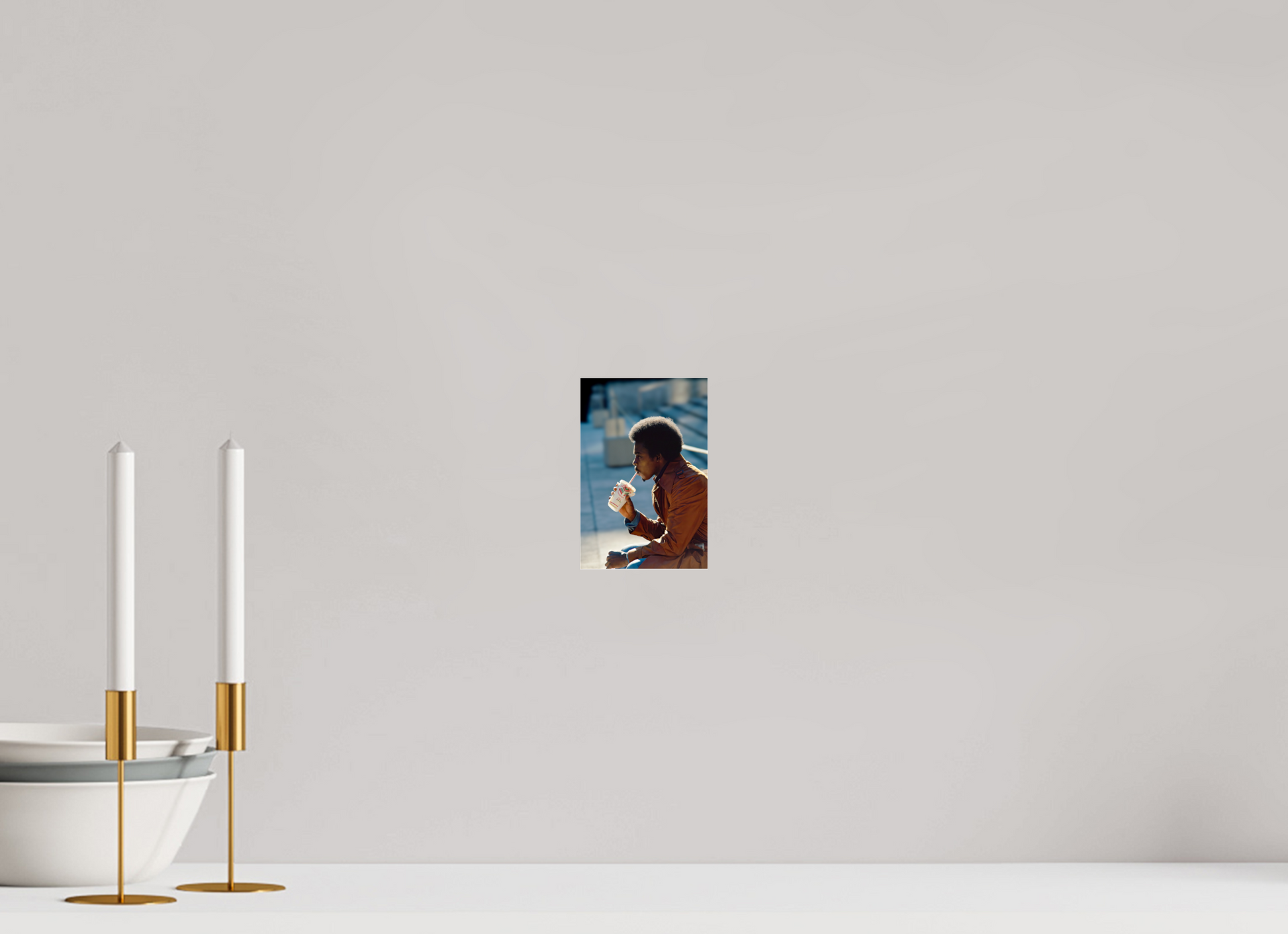 A young man sits in quiet contemplation, the soft glow of sunlight illuminating his face as he sips from a straw, capturing a moment of serenity amidst the urban backdrop.