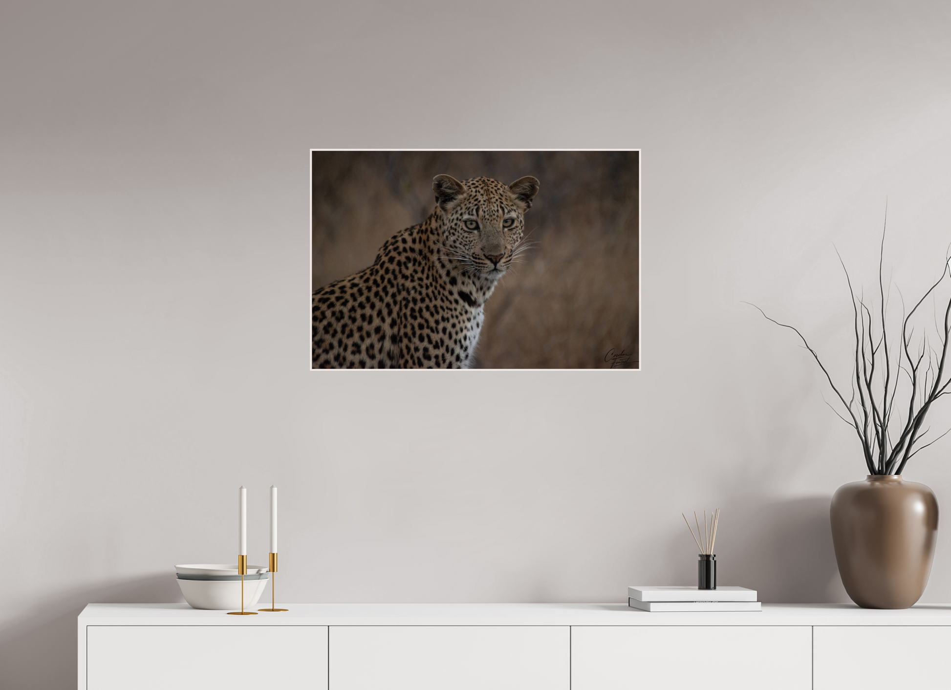 The regal presence of a leopard is captured in this striking portrait. The intricate pattern of its spotted coat stands out against the soft, blurred background, highlighting the animal's natural beauty and strength. The leopard's intense gaze and poised stance convey a sense of power and grace.