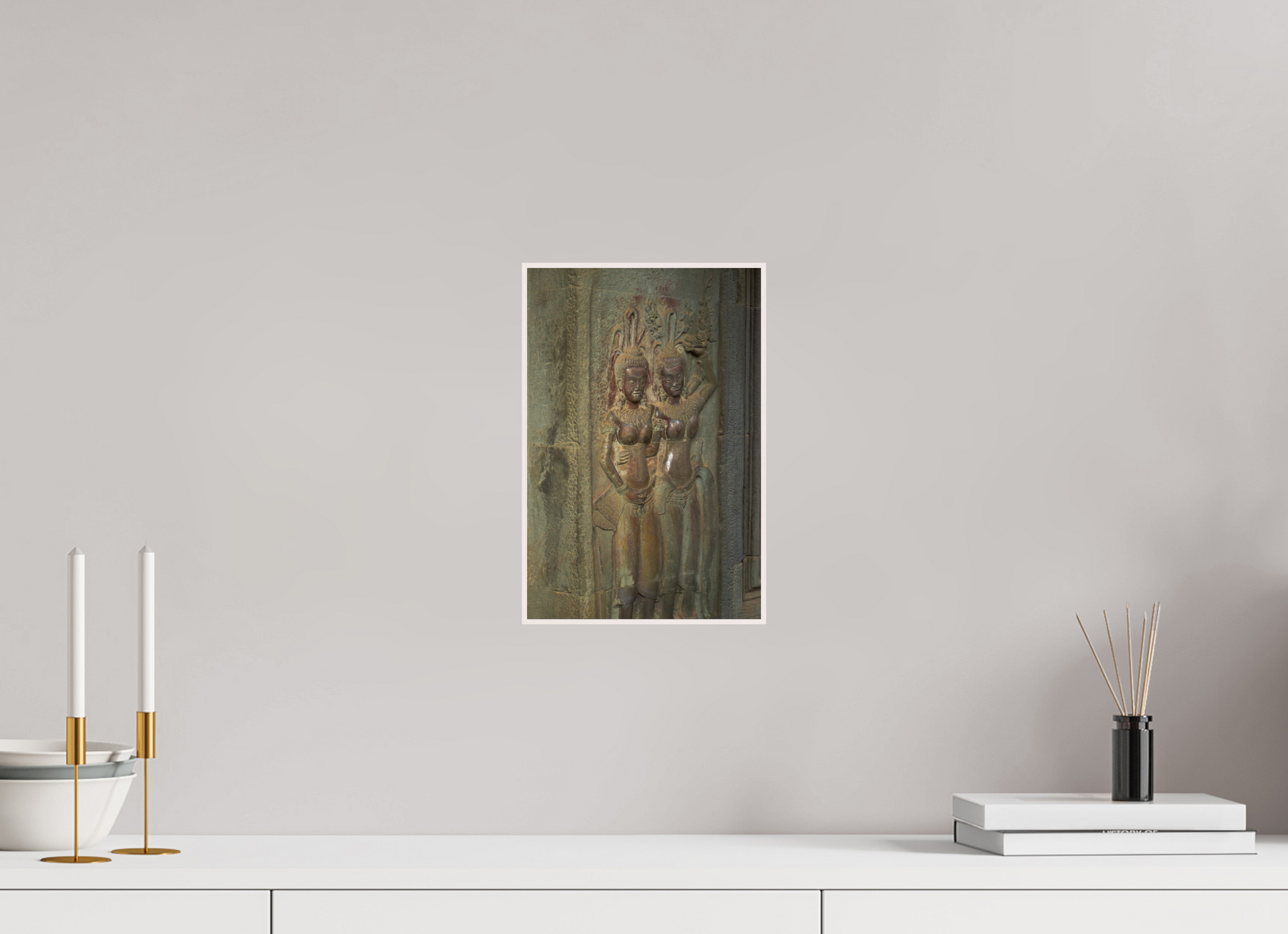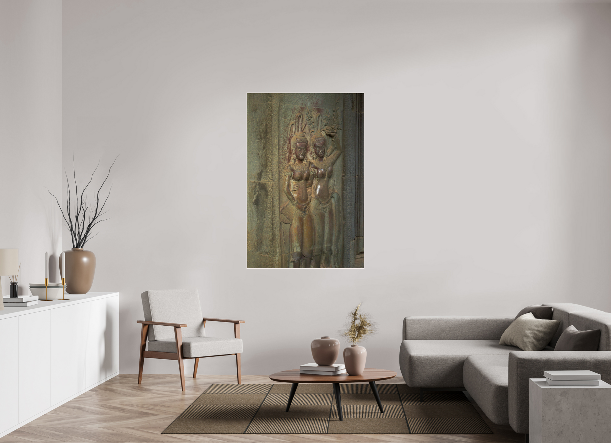 A stone figure stands guard in the ancient corridors of Angkor, its intricate carvings and detailed headdress a testament to the craftsmanship of the Khmer people. The muted greys of the weathered stone contrast beautifully with the vibrant greens of the encroaching foliage, creating a scene of timeless beauty. The soft light filtering through the jungle canopy adds a sense of tranquility and serenity, capturing the essence of Angkor's mystical allure. The guardian's serene expression and poised stance evoke a sense of reverence and awe. This image is a testament to the enduring legacy of the Khmer Empire, where history and nature intertwine.