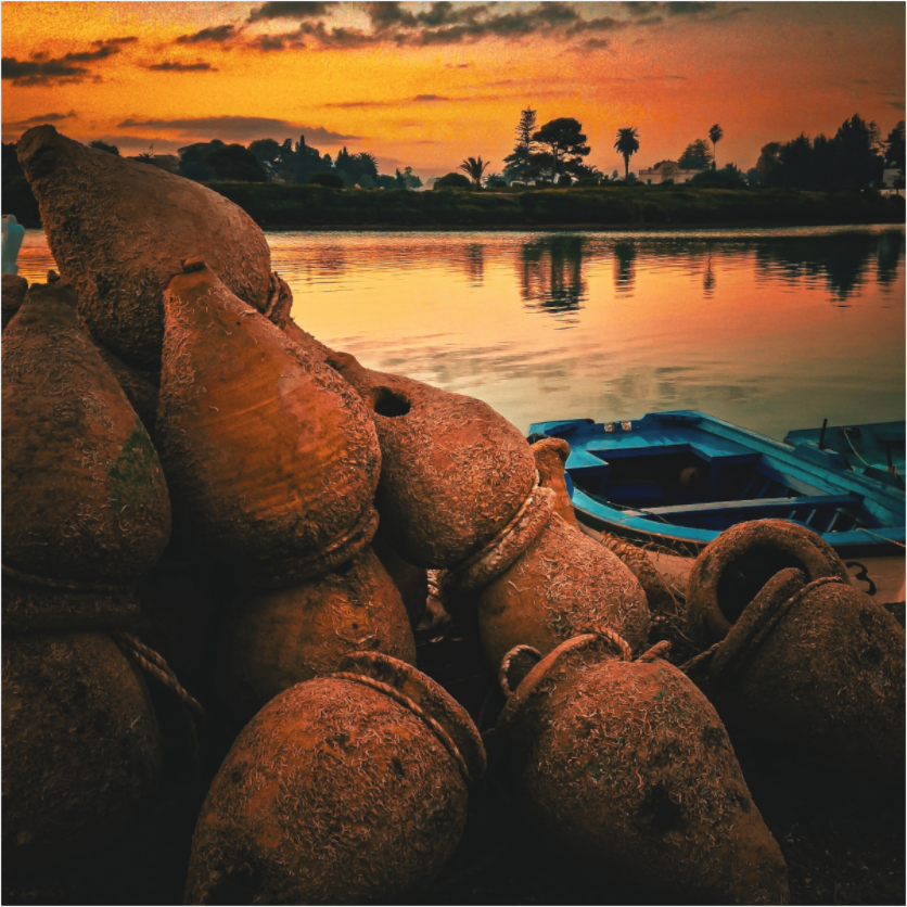 This evocative image captures a tranquil harbor scene in Tunisia at sunset. A collection of traditional clay pots is foregrounded against the calm water, with a small boat gently floating nearby. The warm hues of the sunset sky are reflected in the water, creating a serene and picturesque atmosphere. The image beautifully encapsulates the peaceful ambiance and timeless charm of a Tunisian port at dusk.
