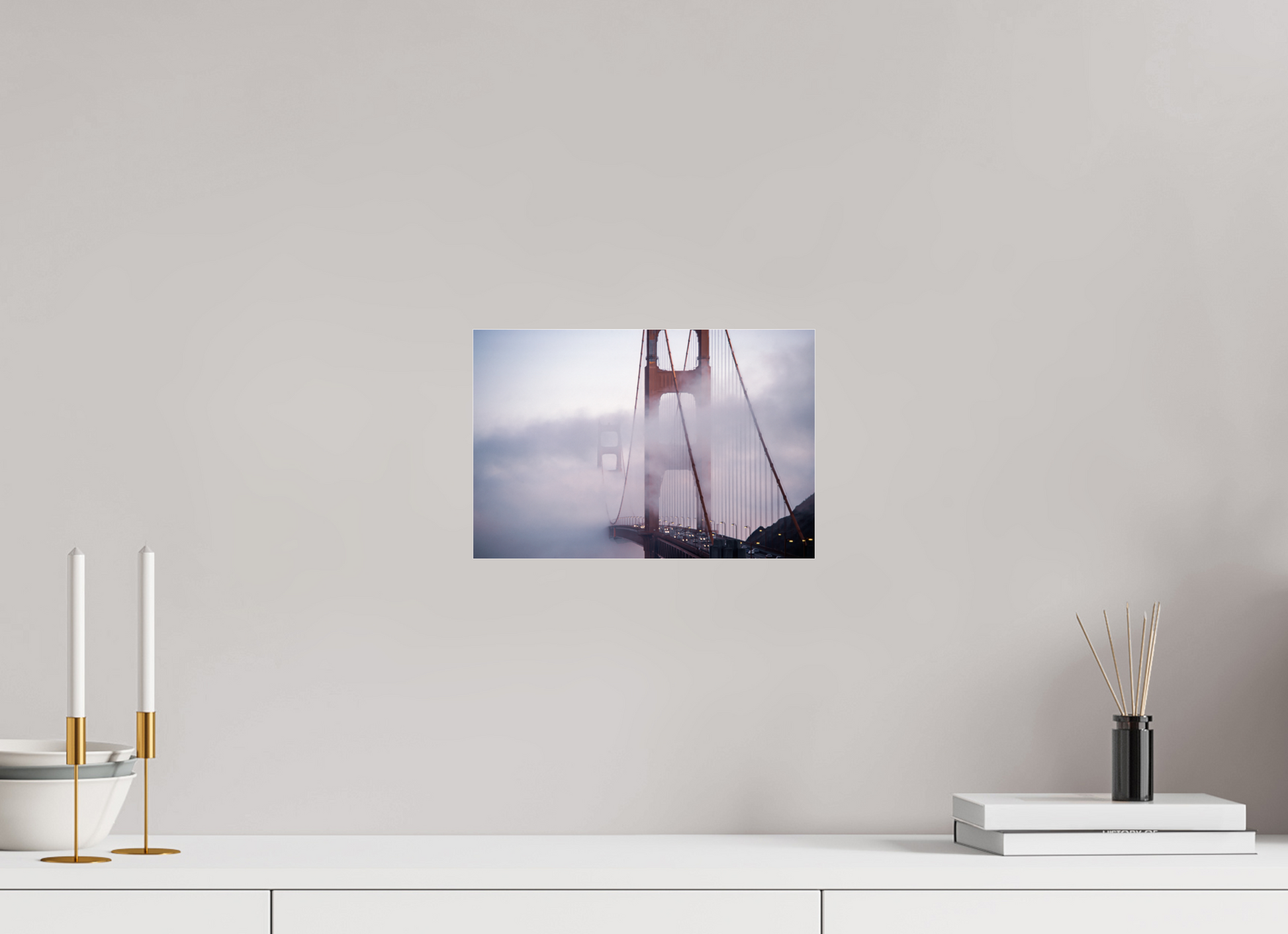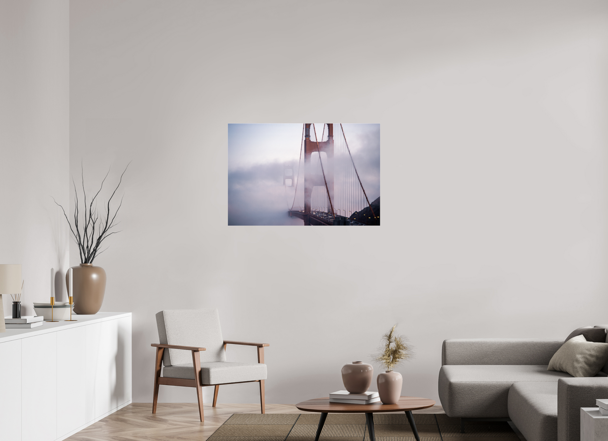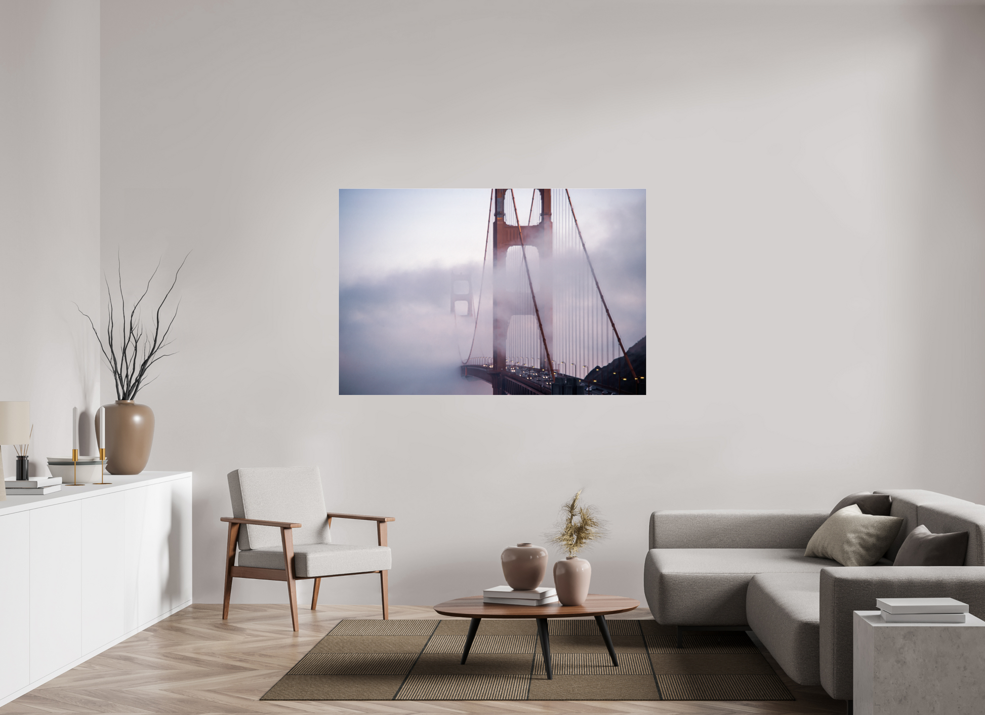 The iconic bridge emerges from the mist, its towering structure shrouded in a delicate veil of fog, creating a scene of ethereal beauty and romantic allure.