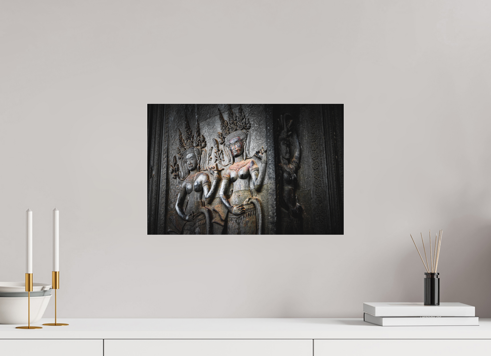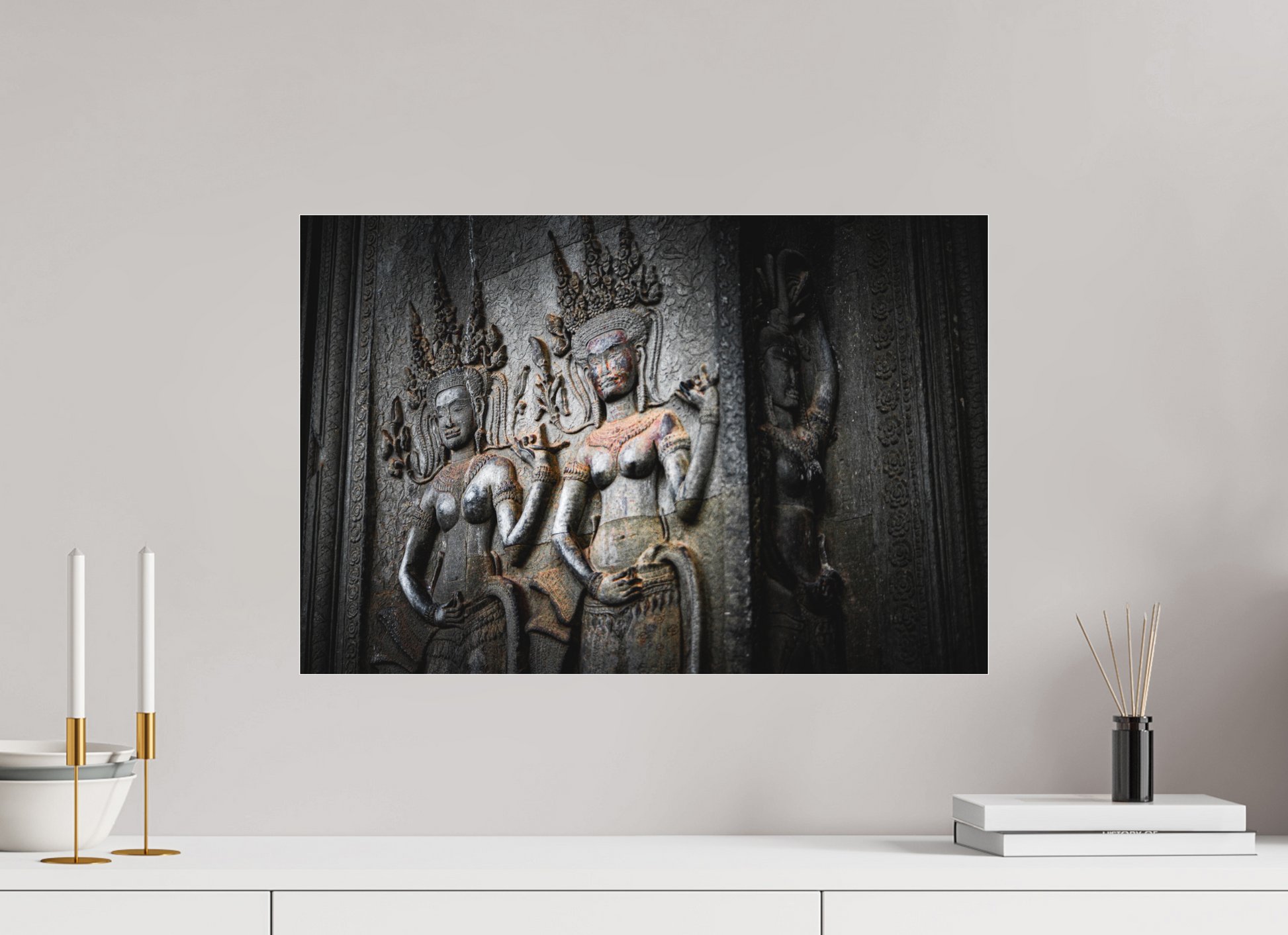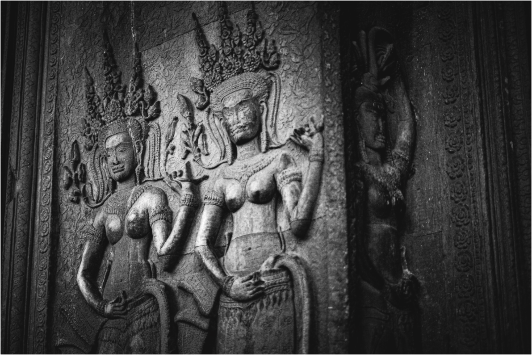 A stone figure of a deity graces the walls of an Angkor temple, its intricate carvings and flowing garments a testament to the artistry of the Khmer people. The muted greys of the weathered stone contrast beautifully with the vibrant greens of the encroaching foliage, creating a scene of timeless beauty. The soft light filtering through the jungle canopy adds a sense of tranquility and serenity, capturing the essence of Angkor's mystical allure. The deity's serene expression and poised stance evoke a sense of reverence and awe. This image is a testament to the enduring legacy of the Khmer Empire, where history and nature intertwine.