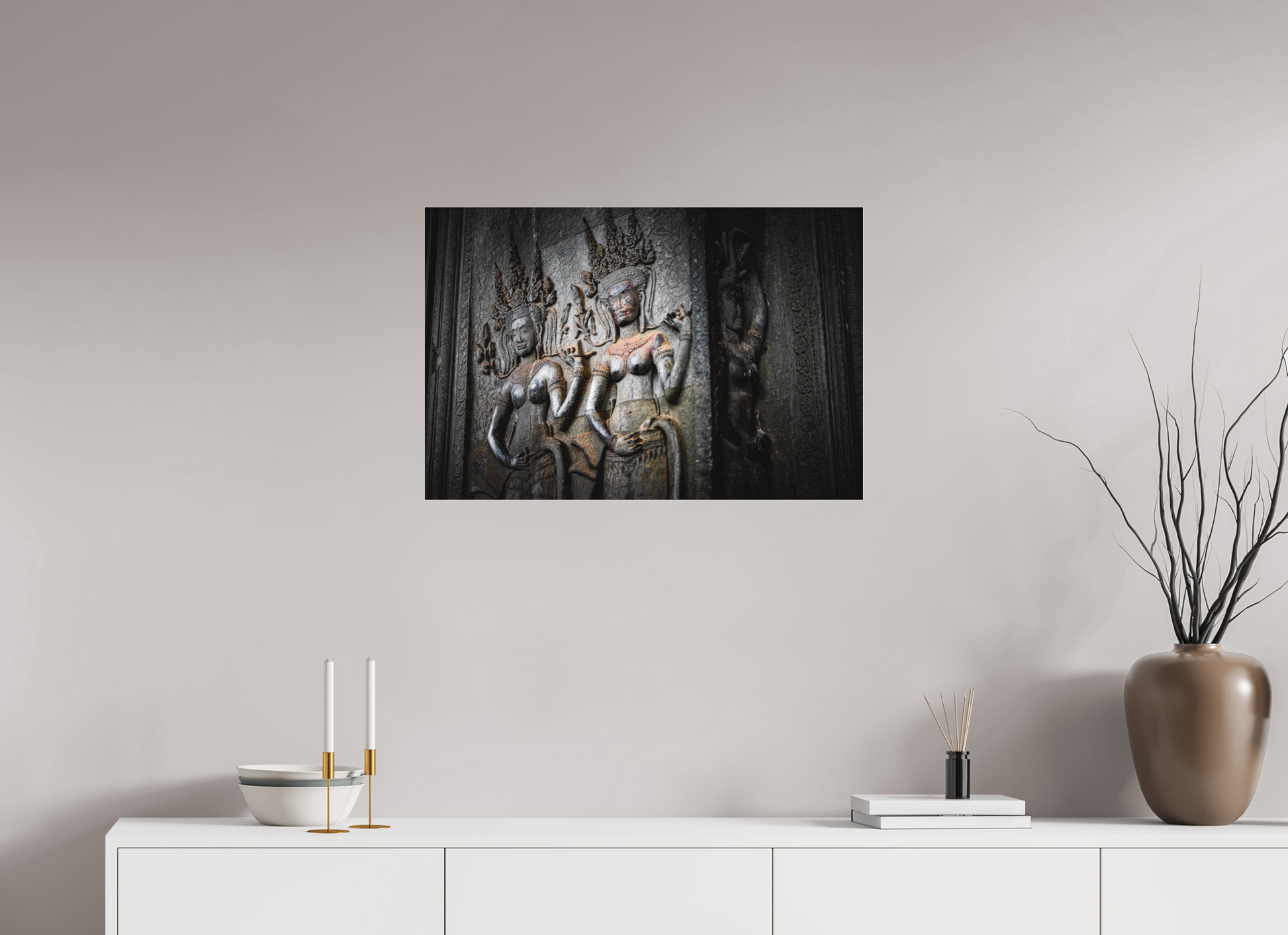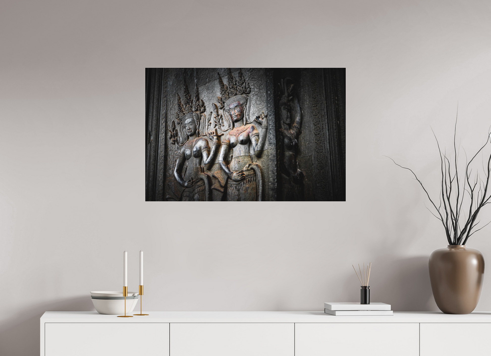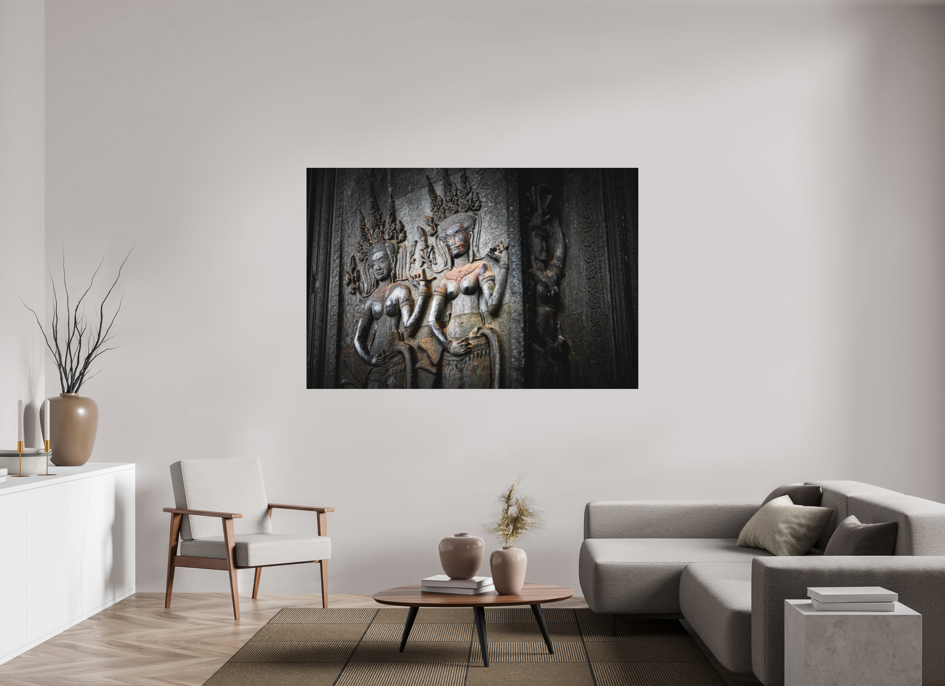 A stone figure of a deity graces the walls of an Angkor temple, its intricate carvings and flowing garments a testament to the artistry of the Khmer people. The muted greys of the weathered stone contrast beautifully with the vibrant greens of the encroaching foliage, creating a scene of timeless beauty. The soft light filtering through the jungle canopy adds a sense of tranquility and serenity, capturing the essence of Angkor's mystical allure. The deity's serene expression and poised stance evoke a sense of reverence and awe. This image is a testament to the enduring legacy of the Khmer Empire, where history and nature intertwine.