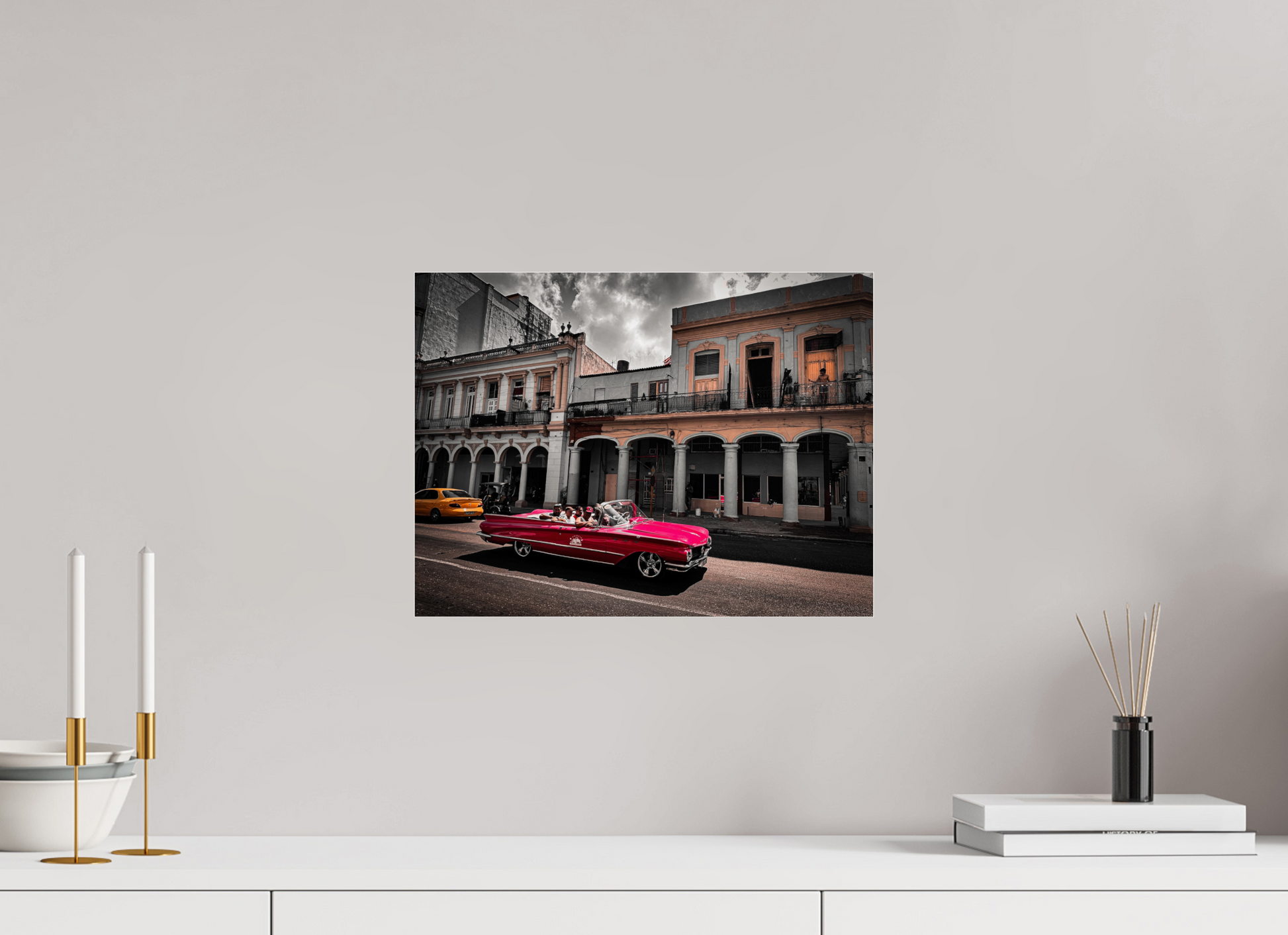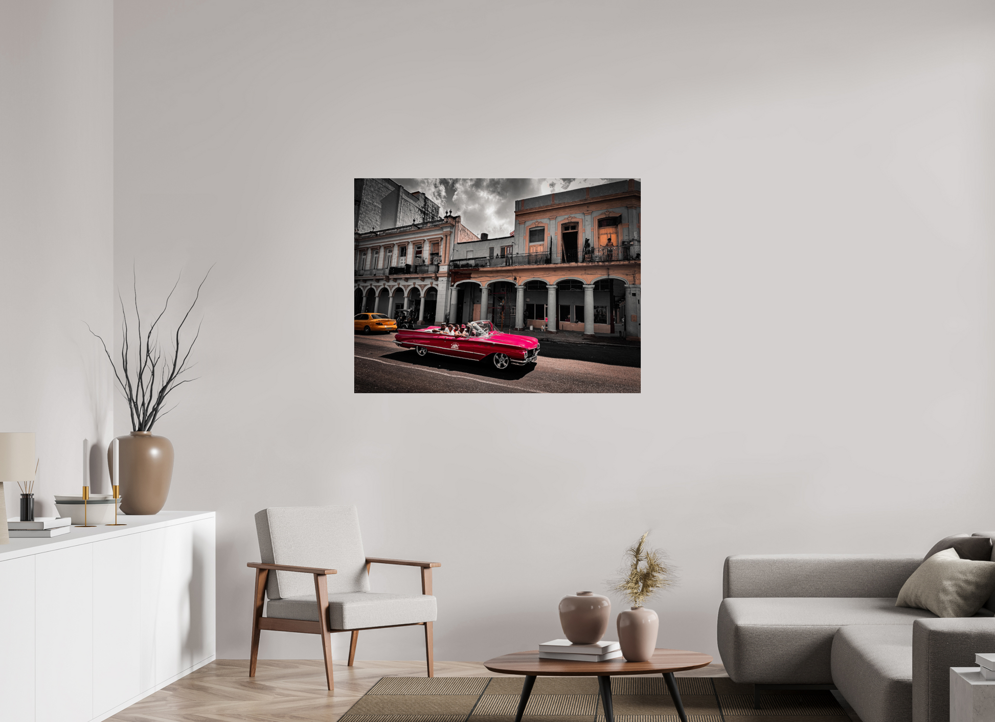 This image features a classic pink convertible car driving down a Havana street, its vibrant color contrasting beautifully with the muted tones of the surrounding buildings. The car's sleek design and the warm, golden light of the day create a nostalgic and dreamy atmosphere. The historic buildings and palm trees lining the street add to the charm and character of the scene. The pink car, a symbol of Havana's love for vintage automobiles, adds a touch of whimsy and elegance.