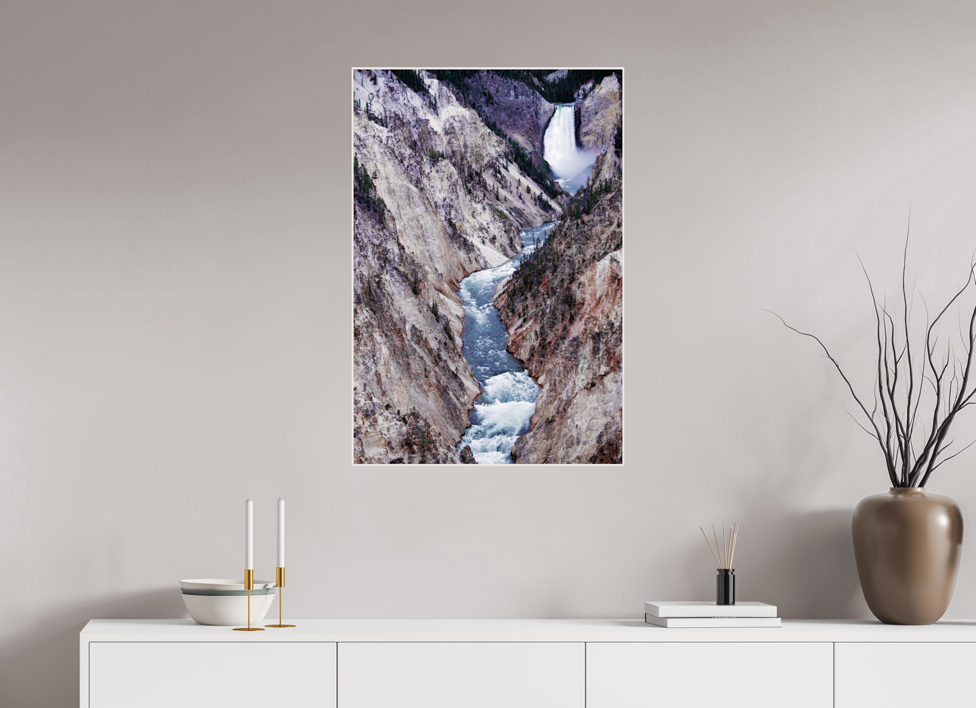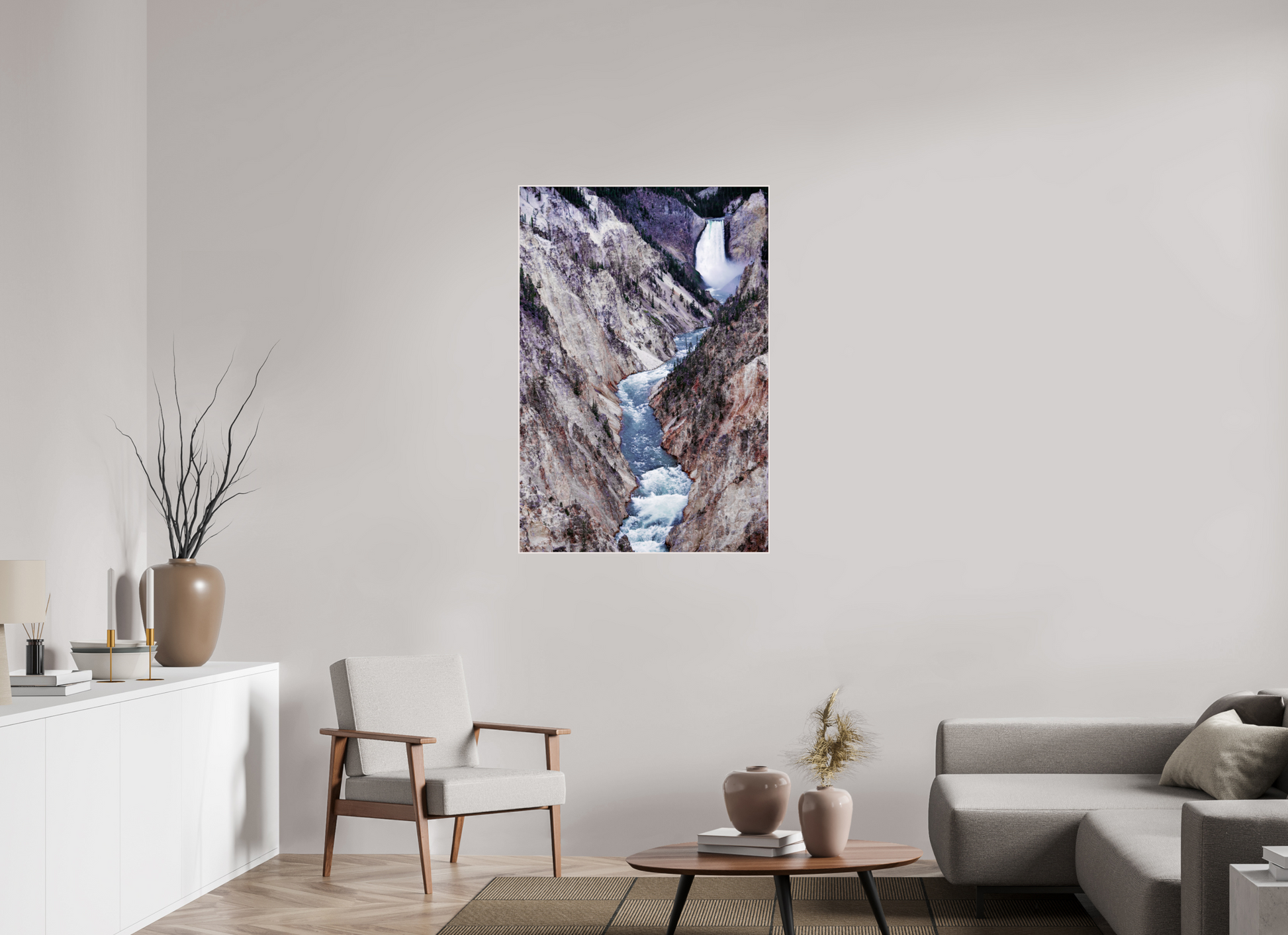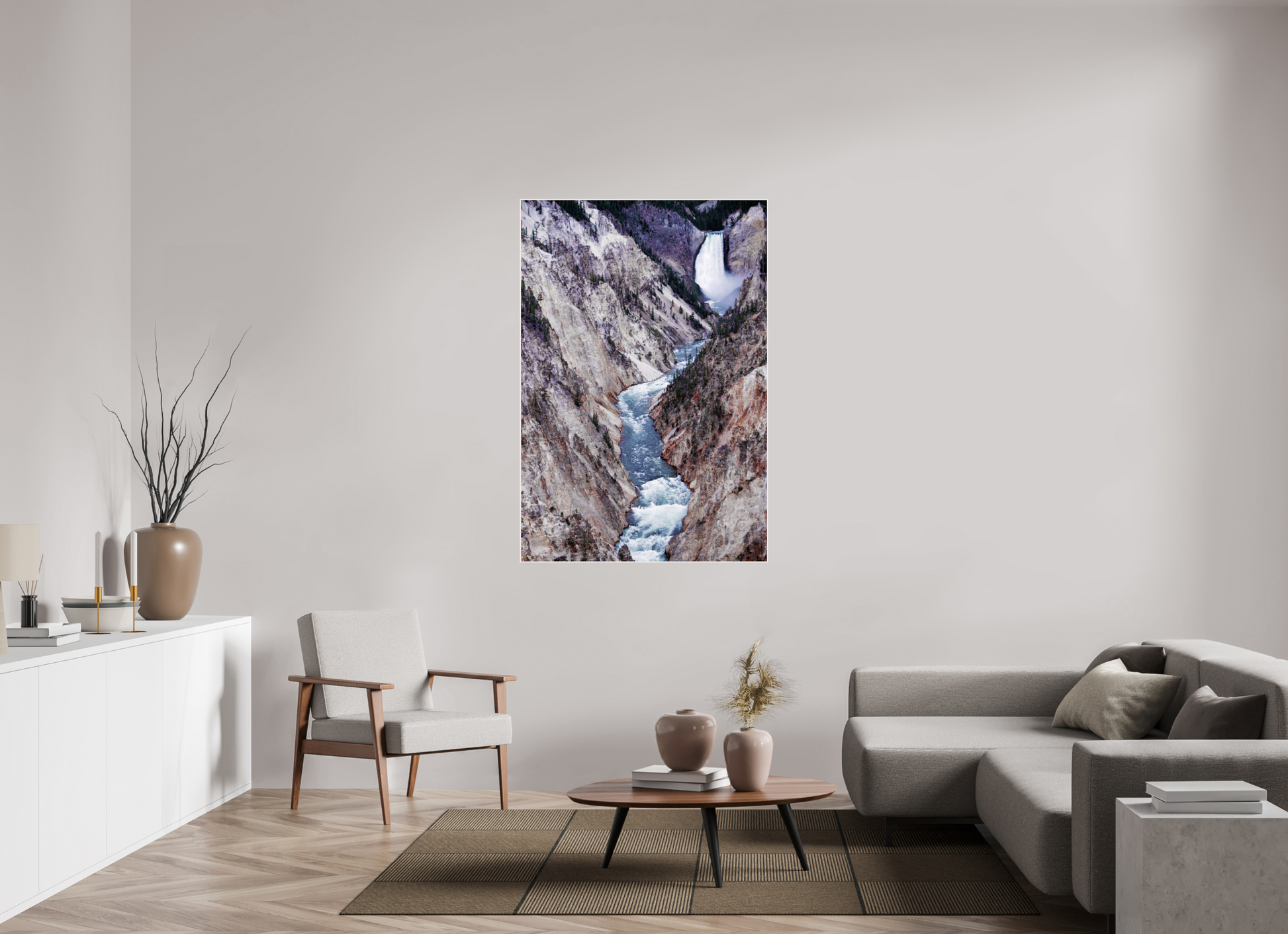 A river carves its way through the rugged canyon, the icy waters contrasting with the stark, rocky cliffs, capturing the raw beauty and power of nature's forces.