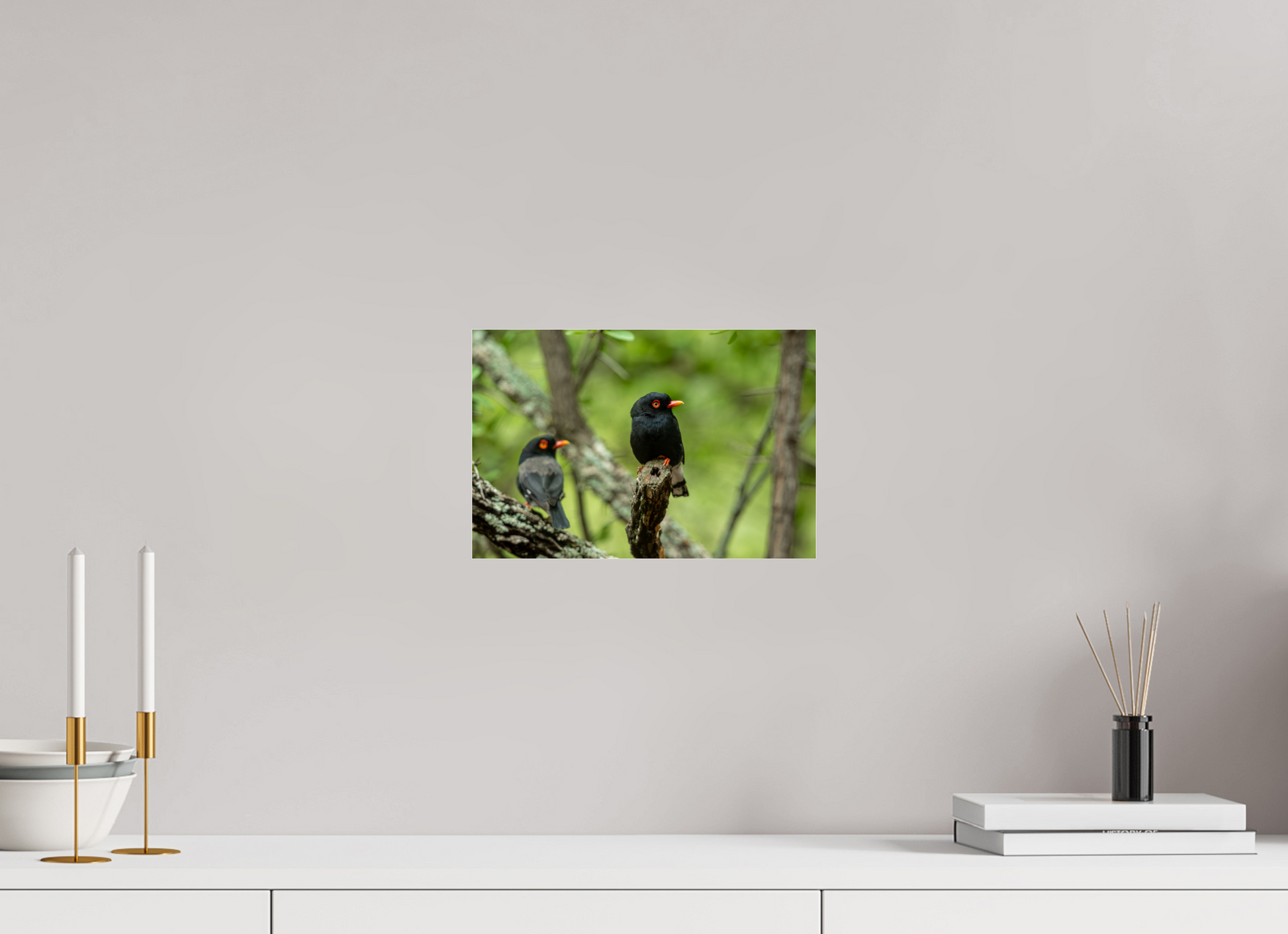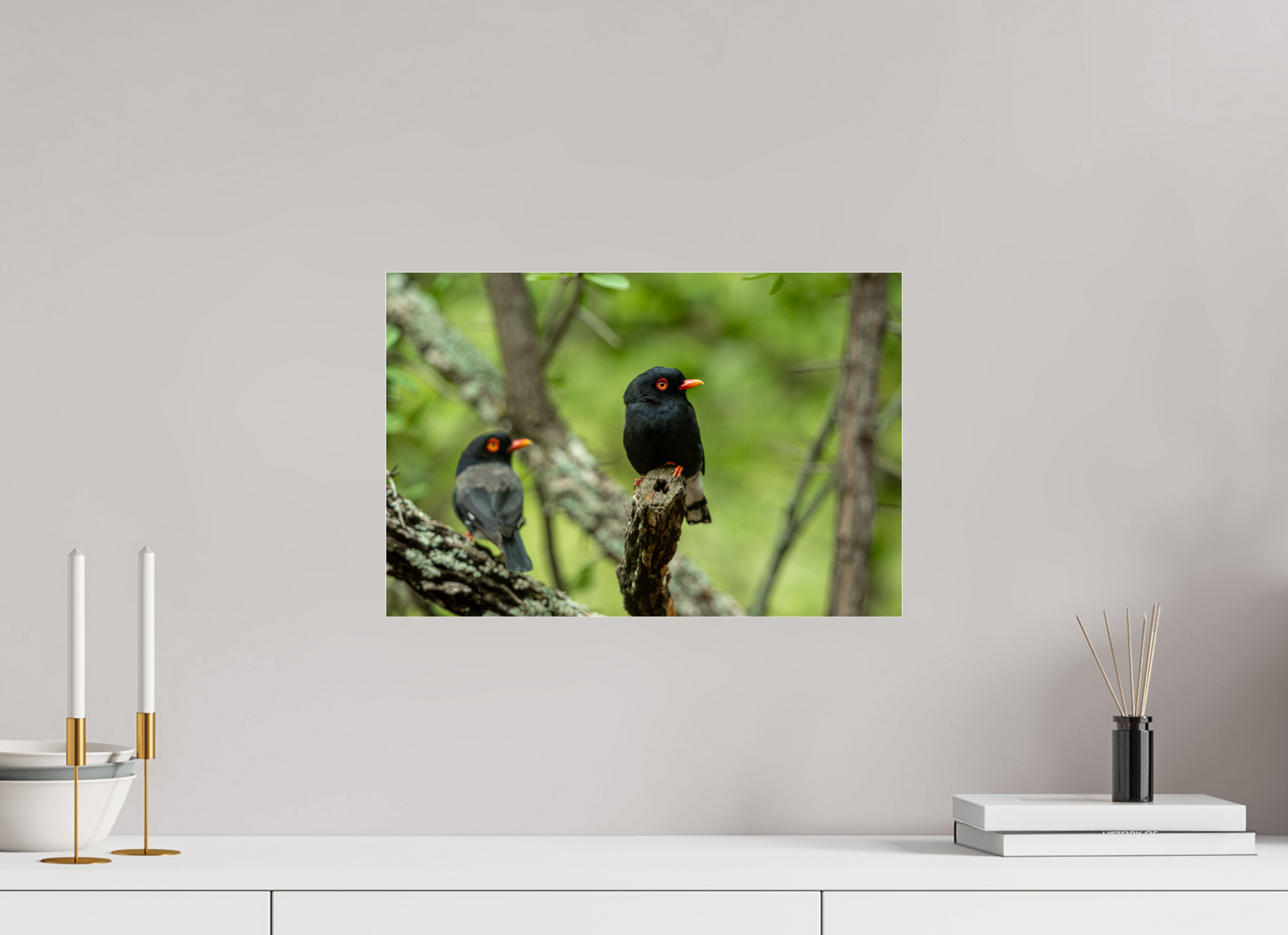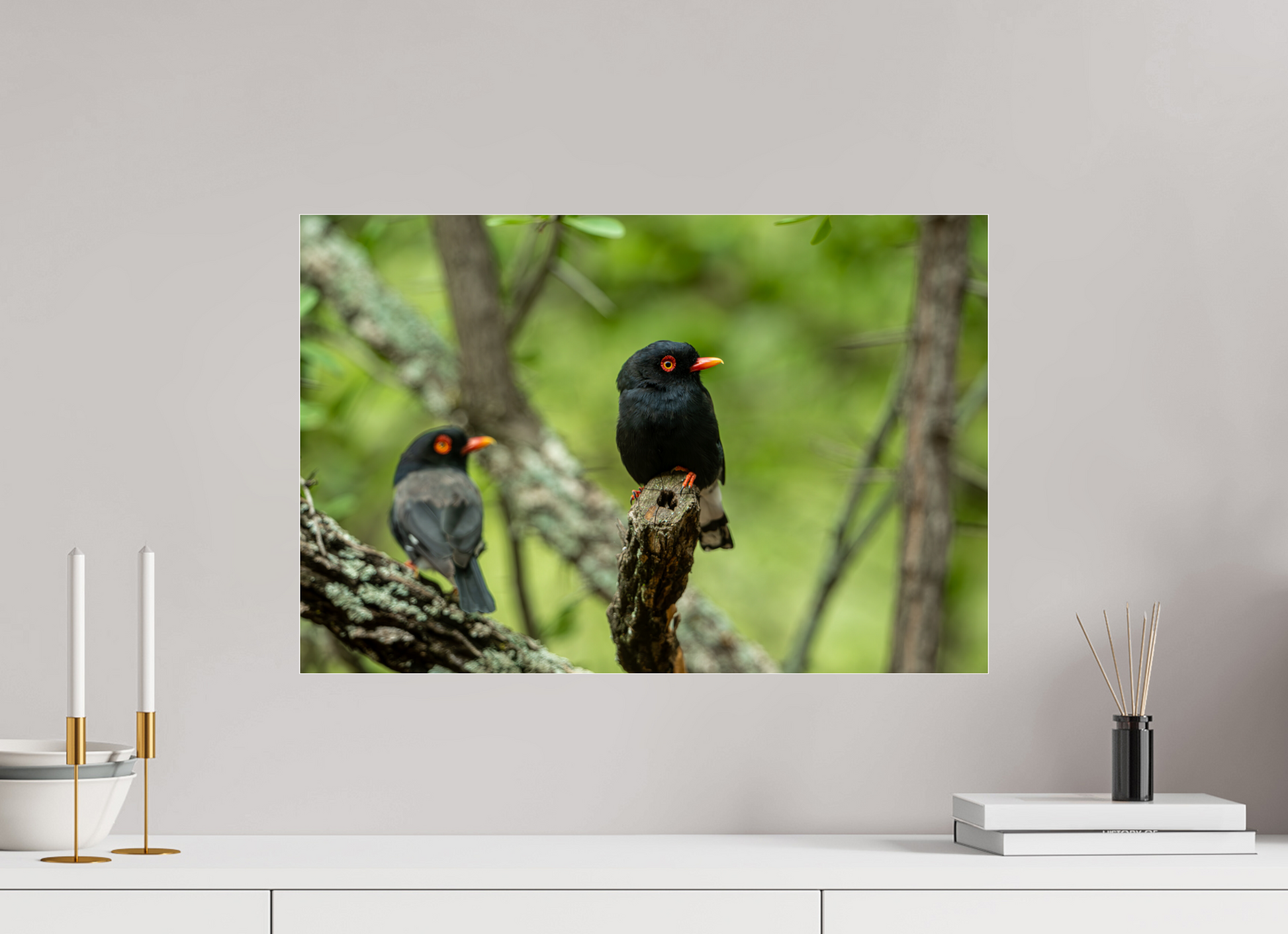 Two birds rest on a branch, their striking colors blending harmoniously with the verdant backdrop, embodying the beauty of companionship in the heart of nature.