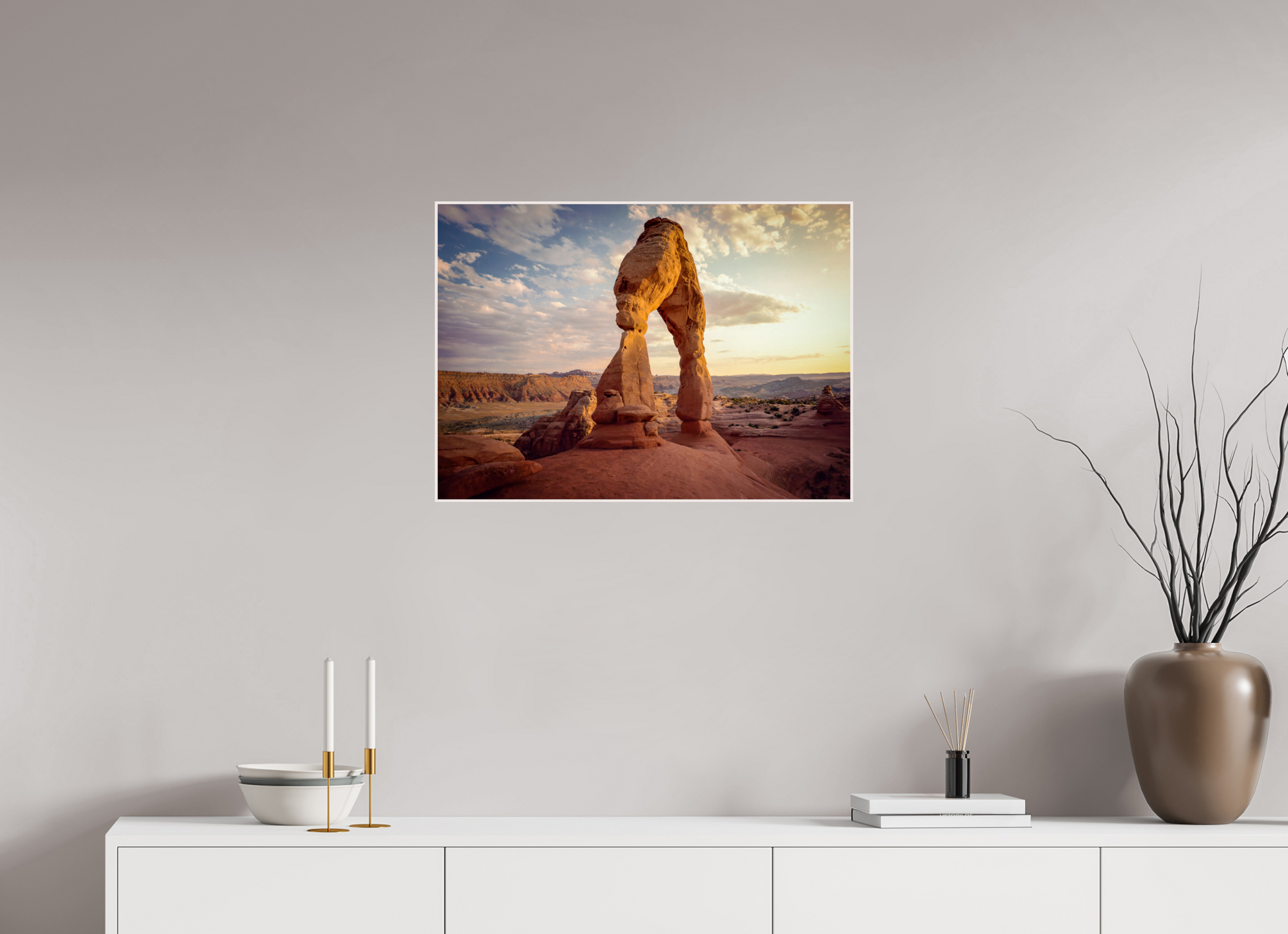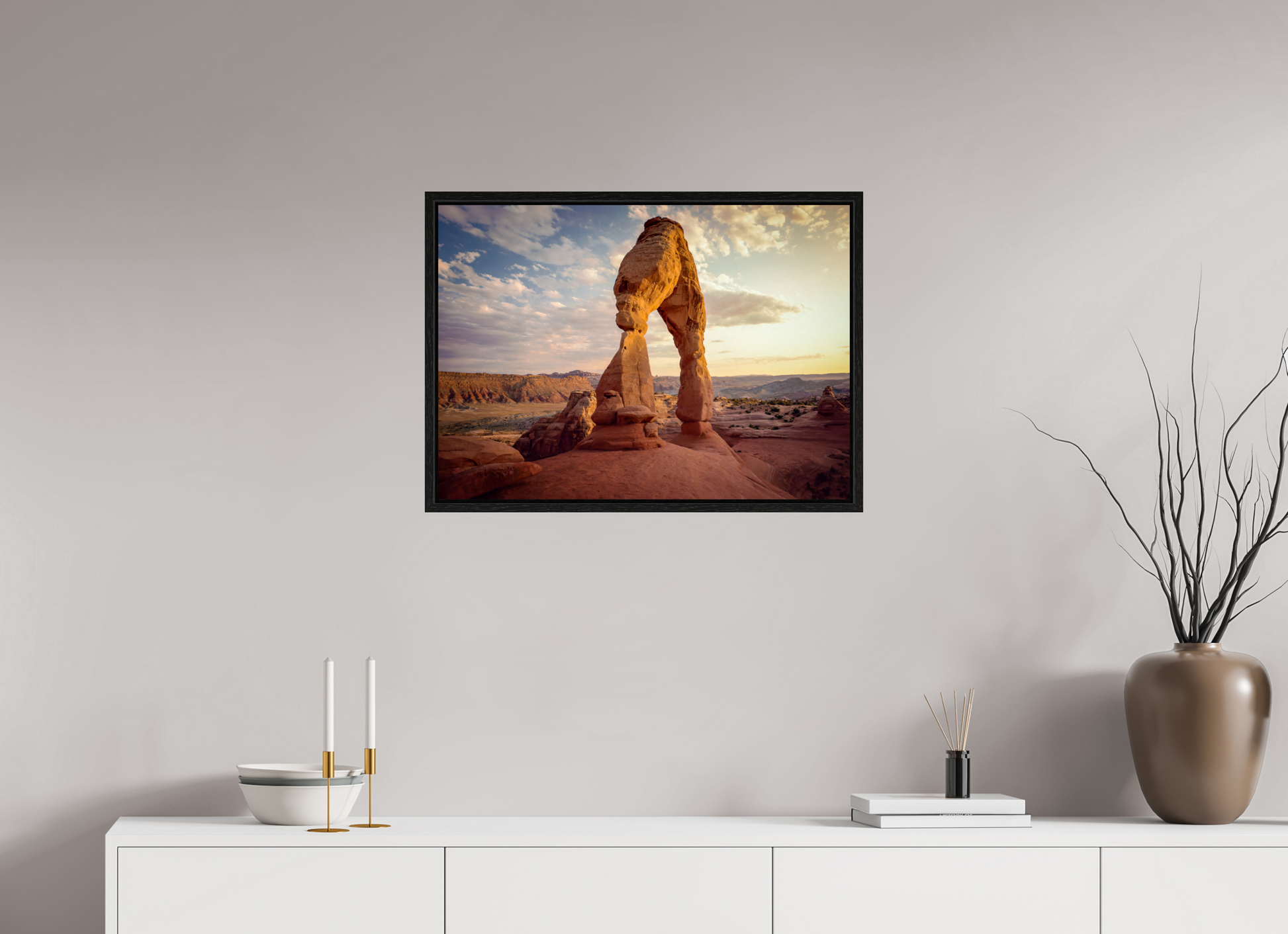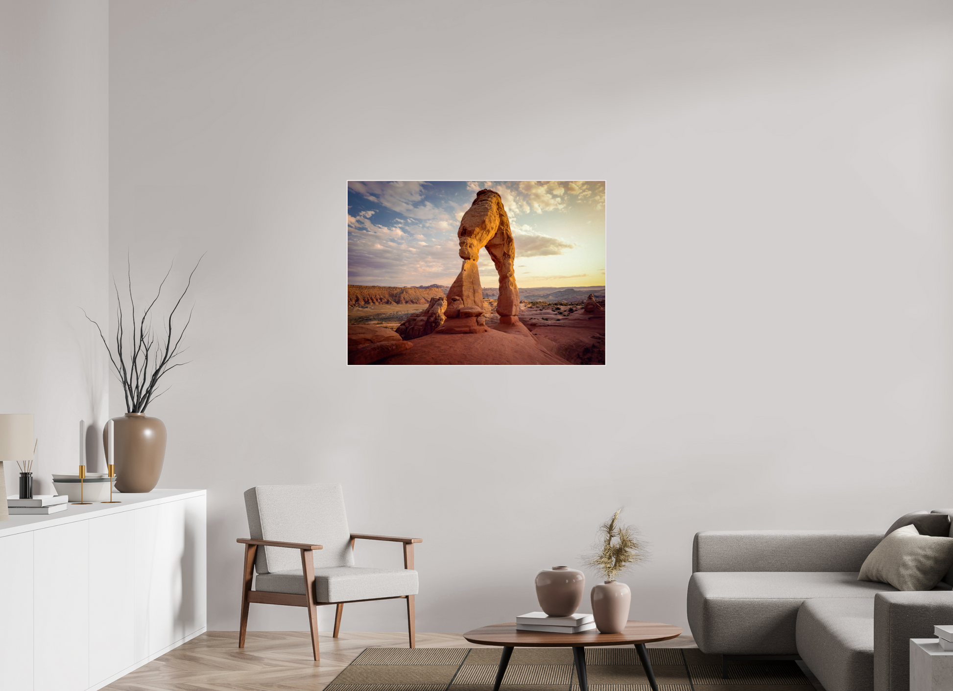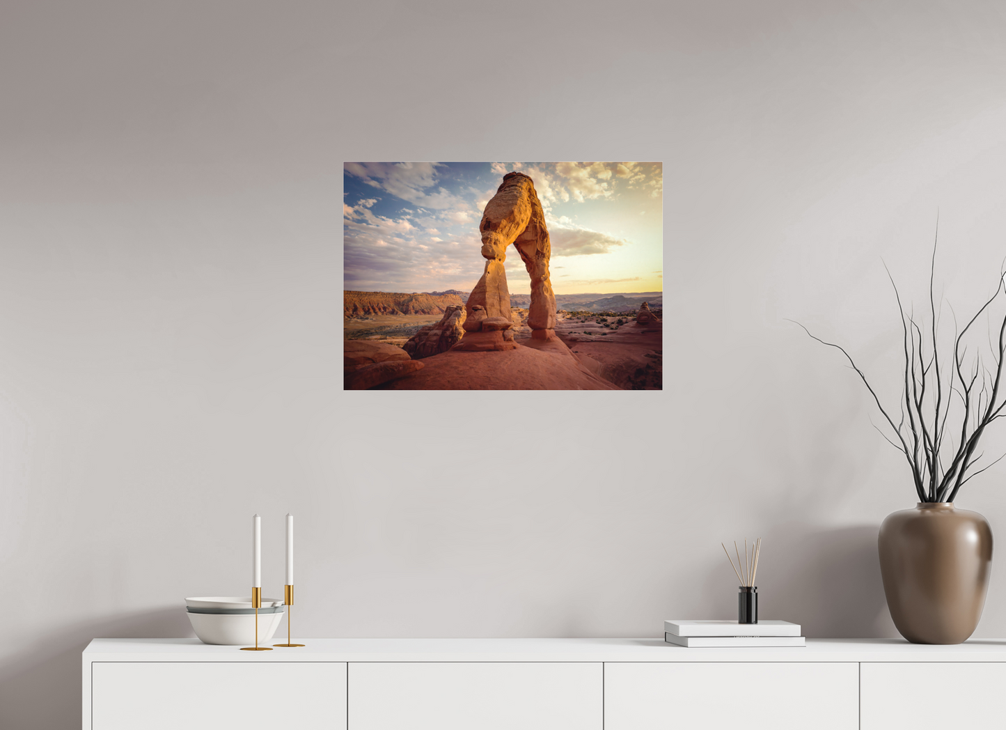 A majestic stone arch stands tall against the horizon, its silhouette framed by the golden light of dawn, capturing a moment of timeless beauty and serene grandeur.