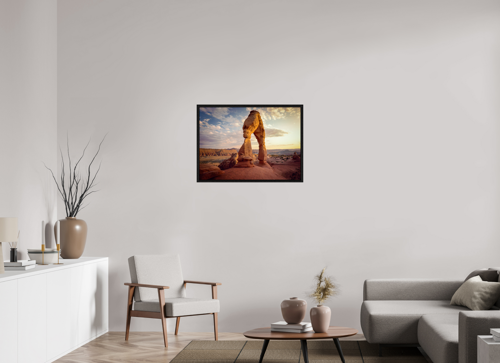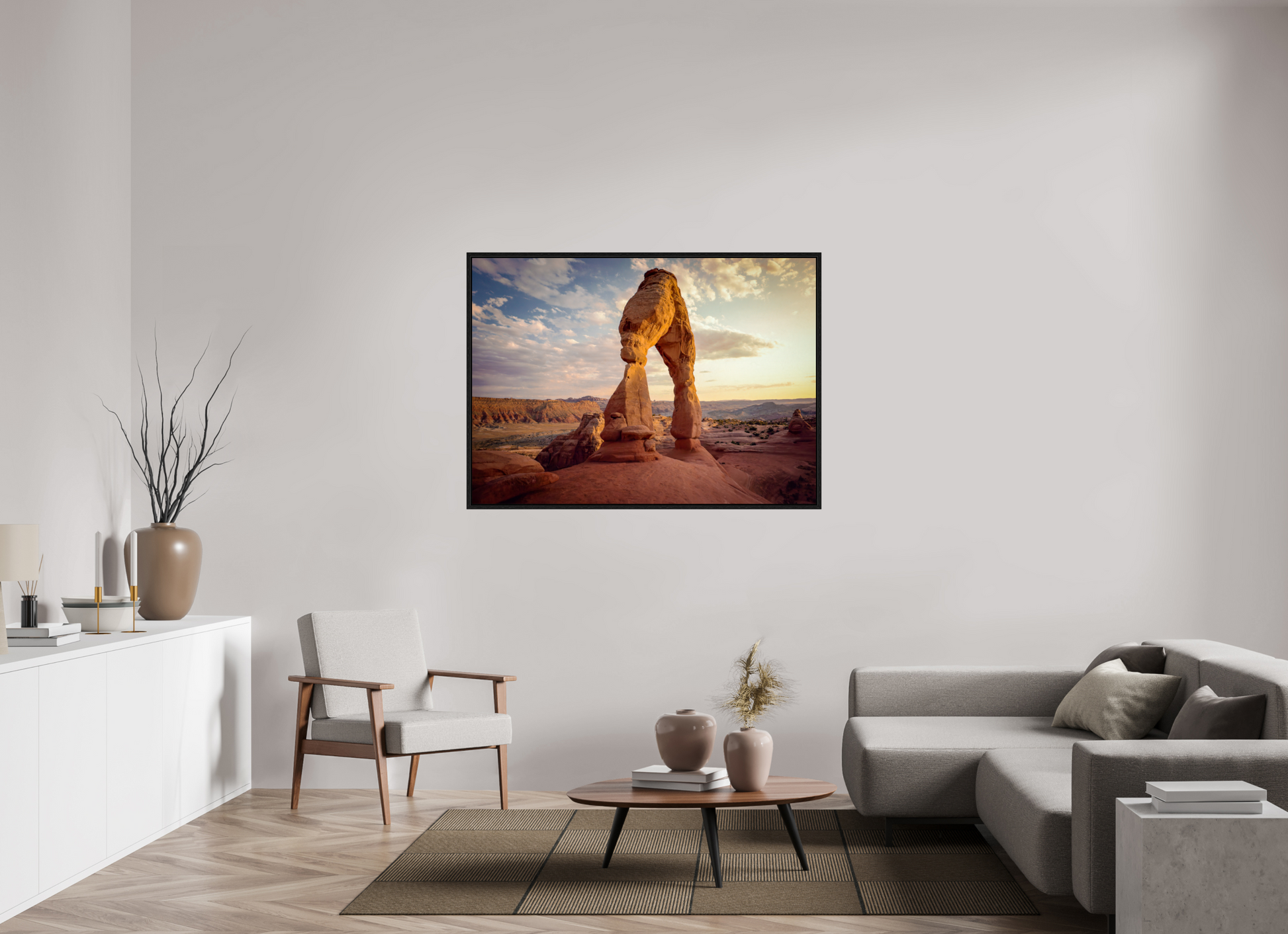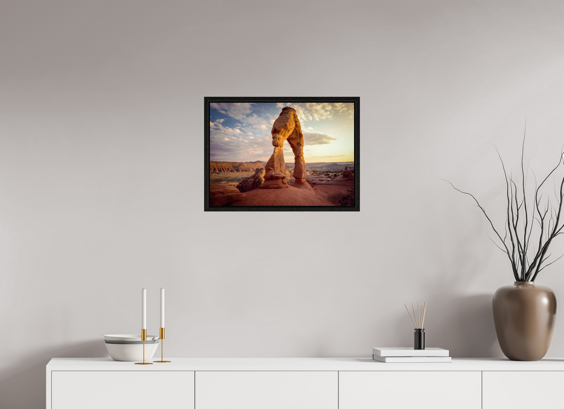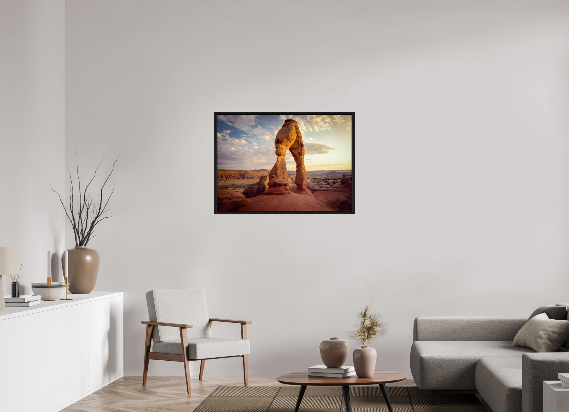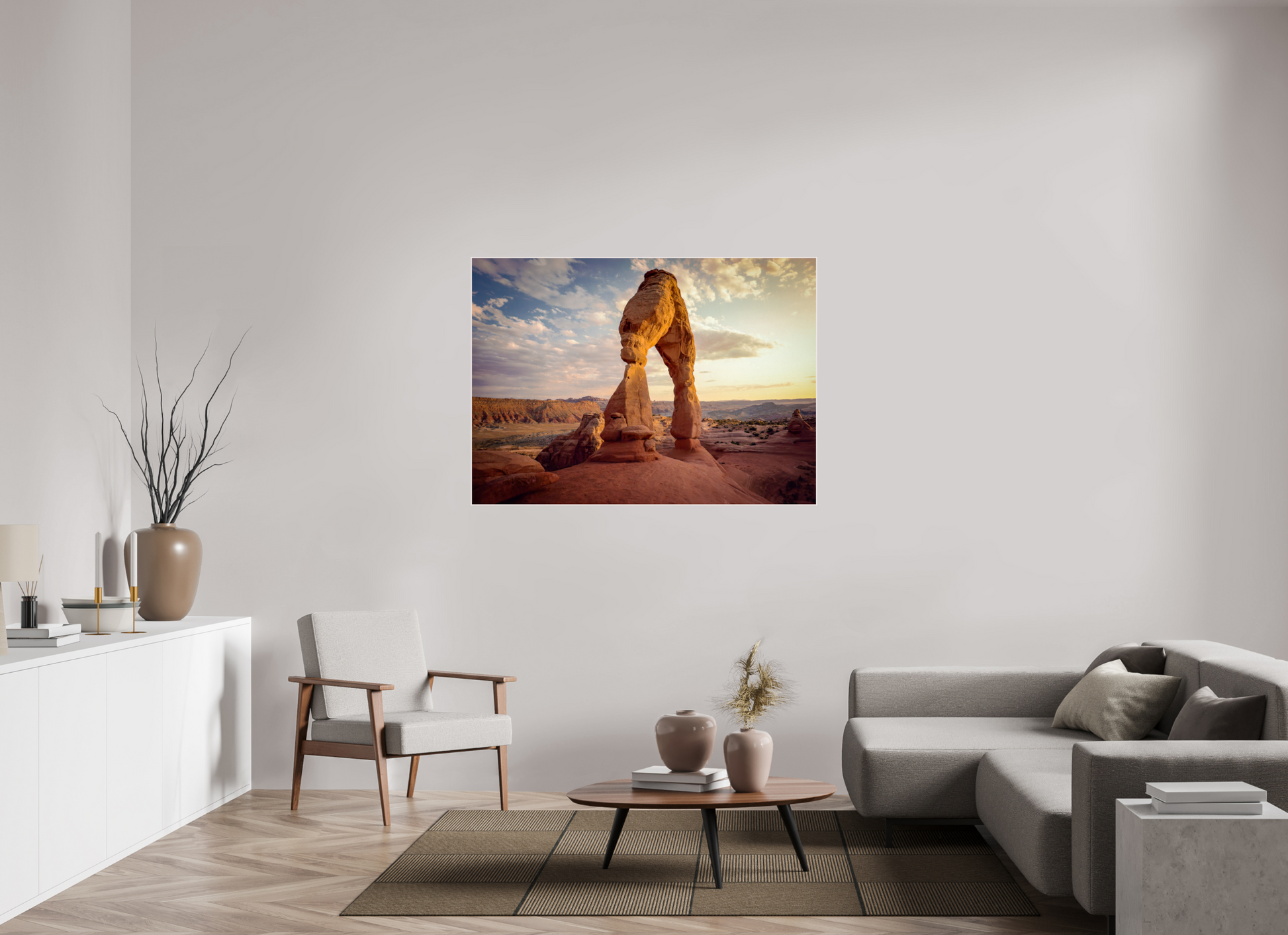 A majestic stone arch stands tall against the horizon, its silhouette framed by the golden light of dawn, capturing a moment of timeless beauty and serene grandeur.