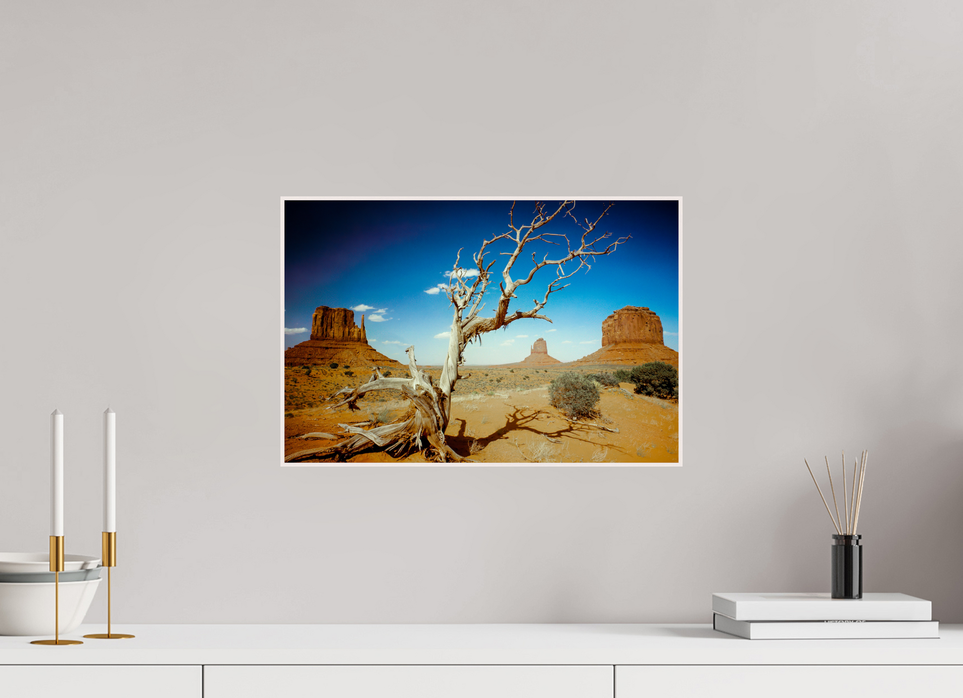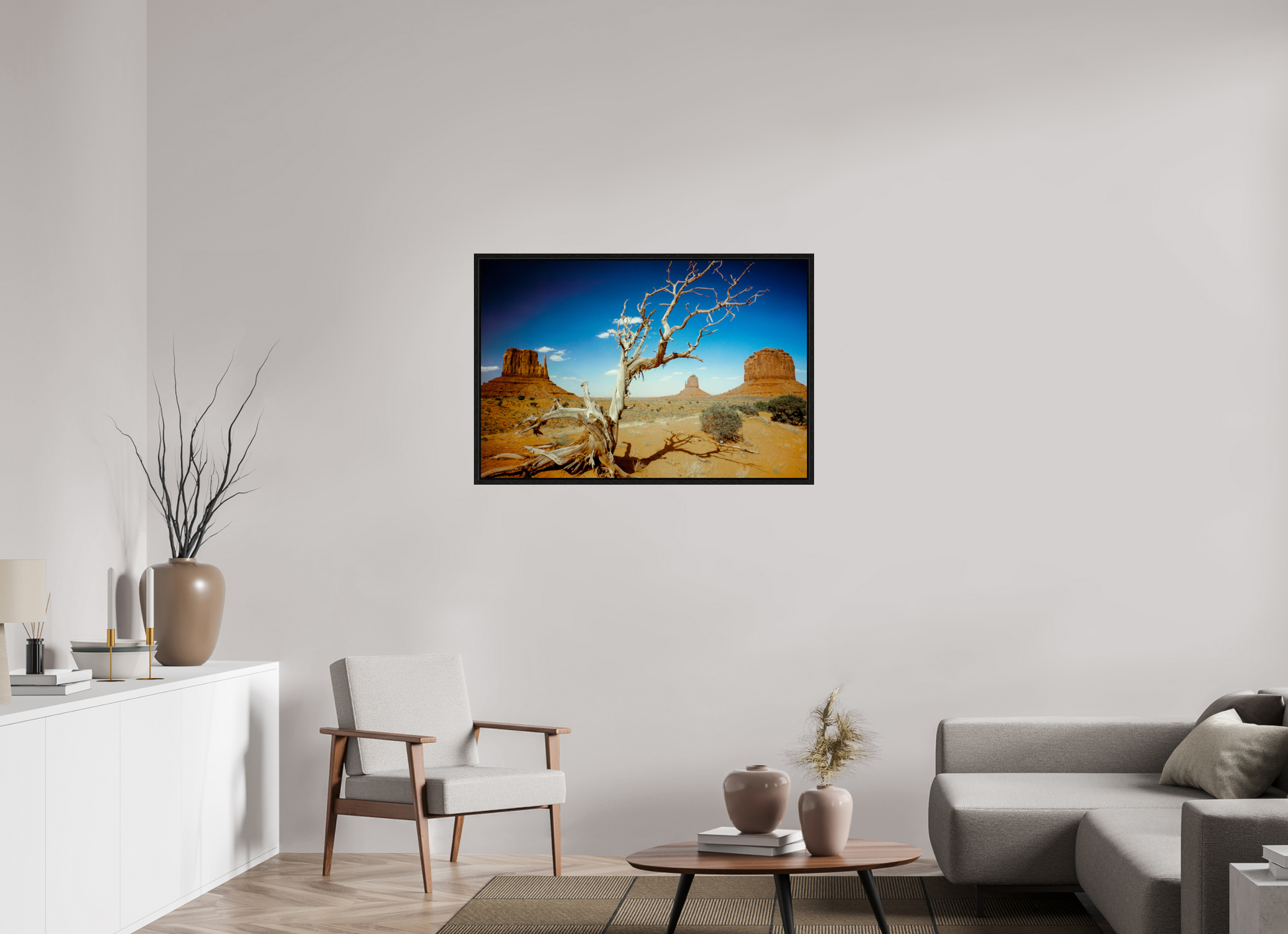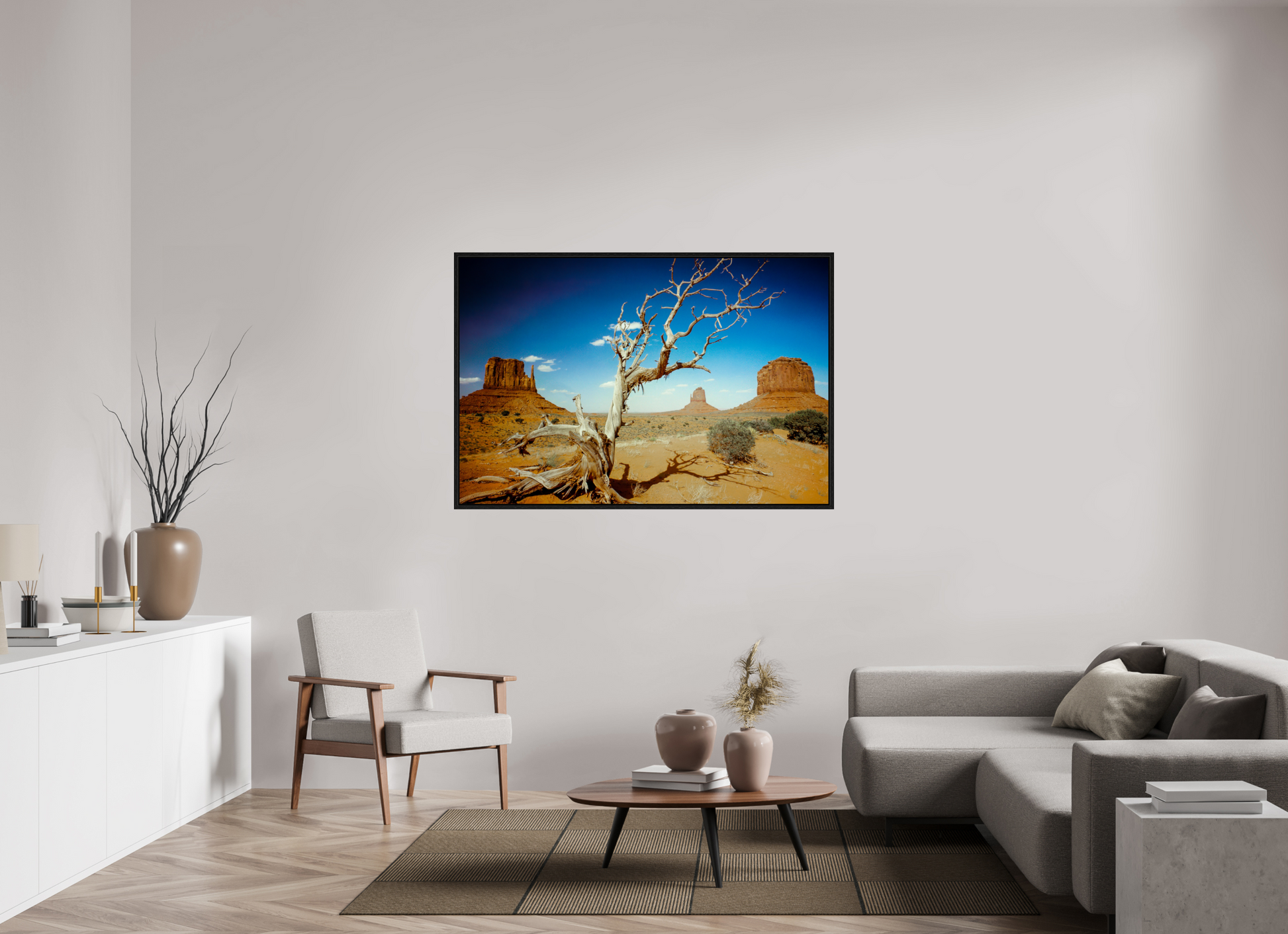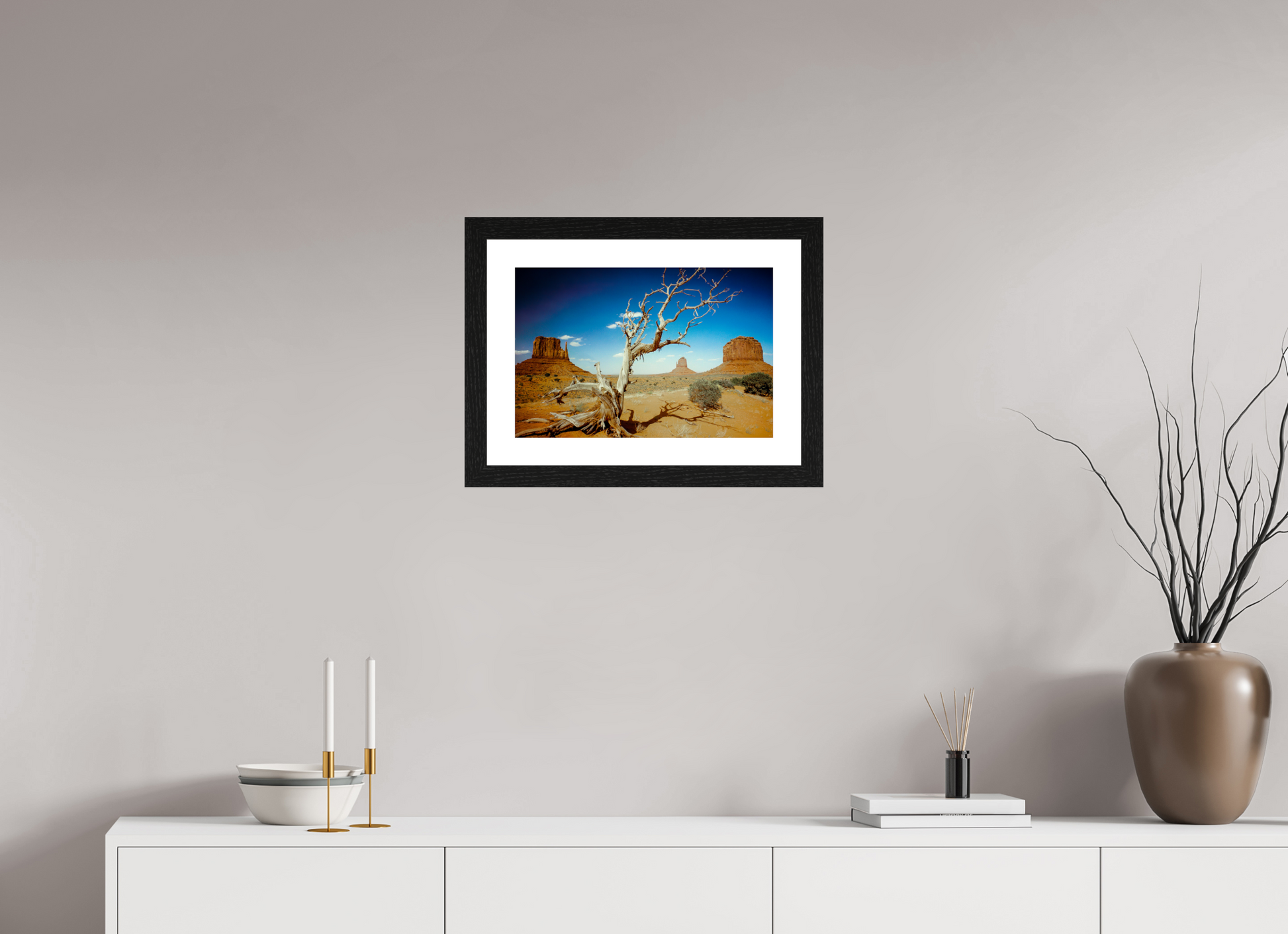 A solitary tree stands amidst the vast desert, its twisted branches reaching towards the sky, framed by majestic rock formations that whisper tales of ancient times.