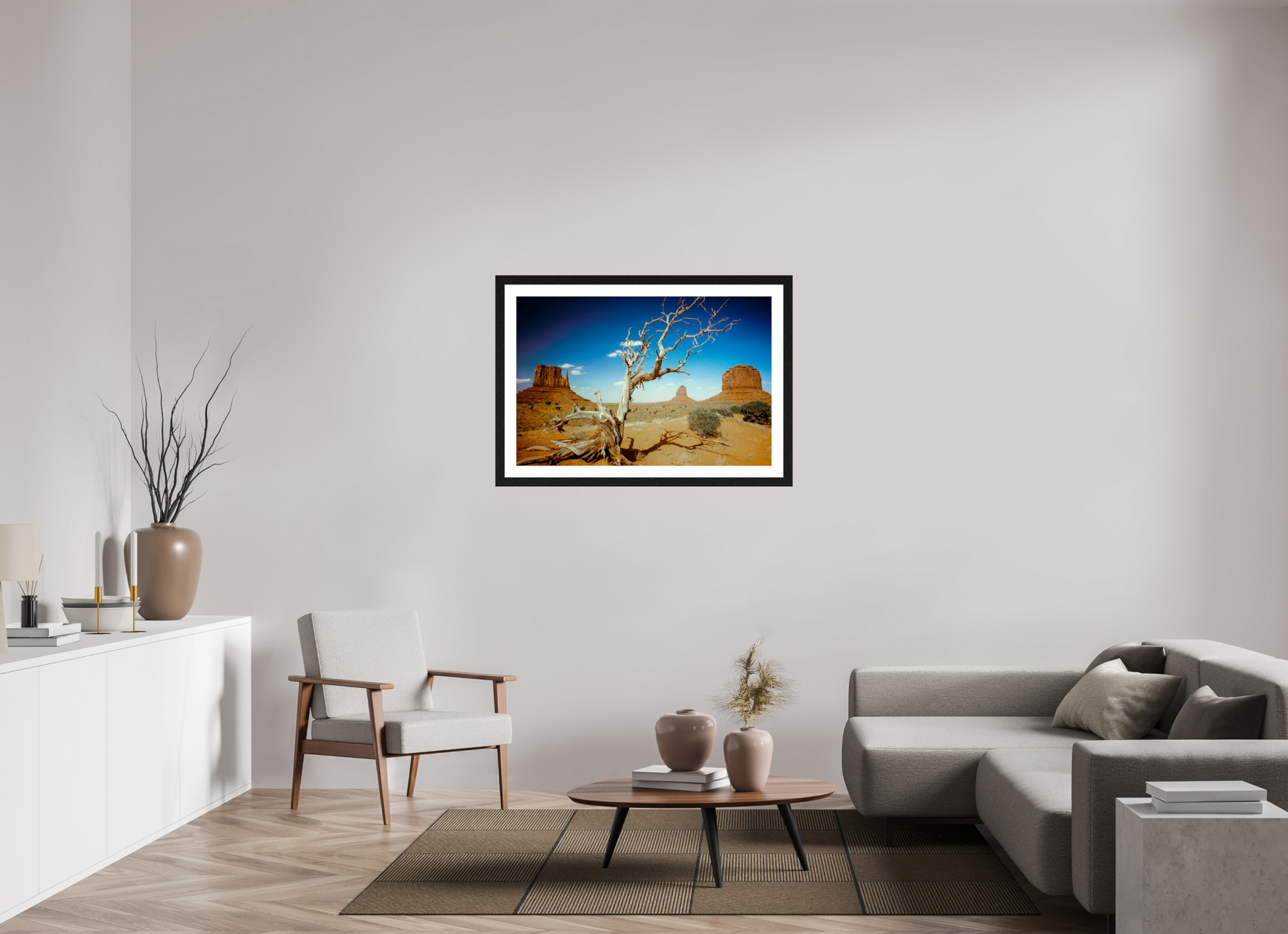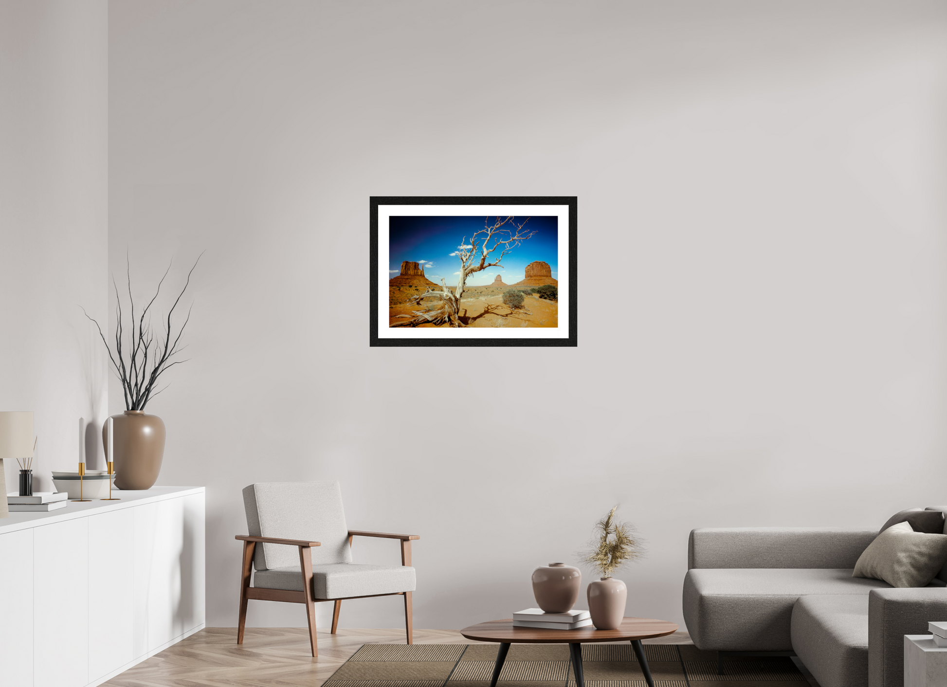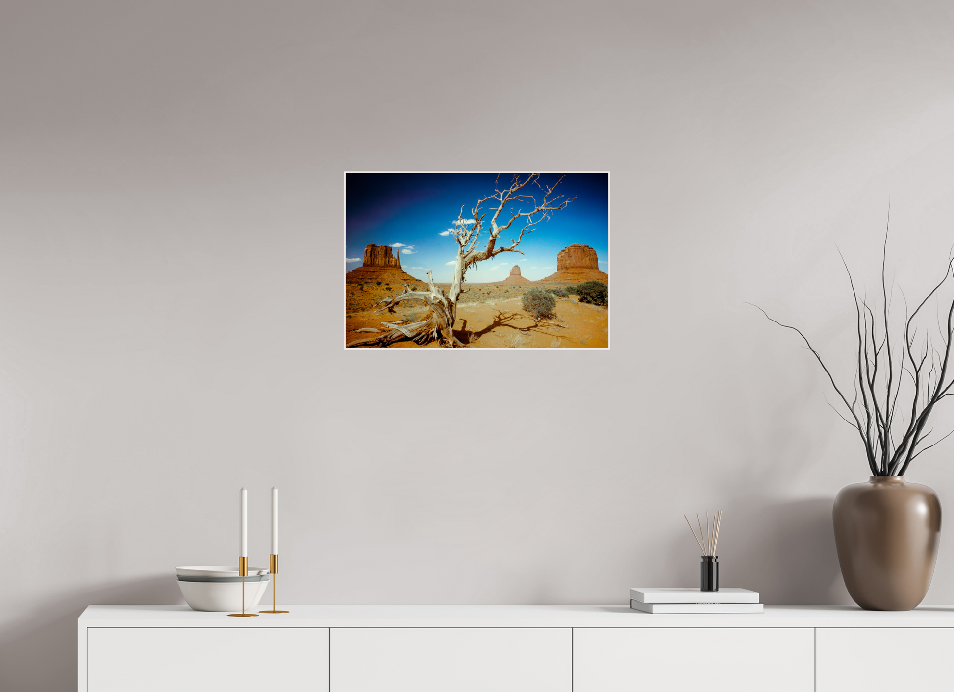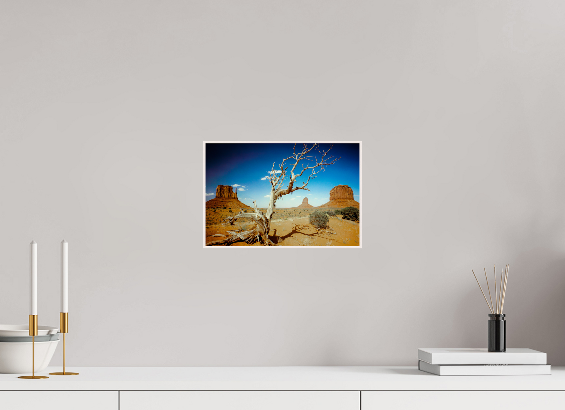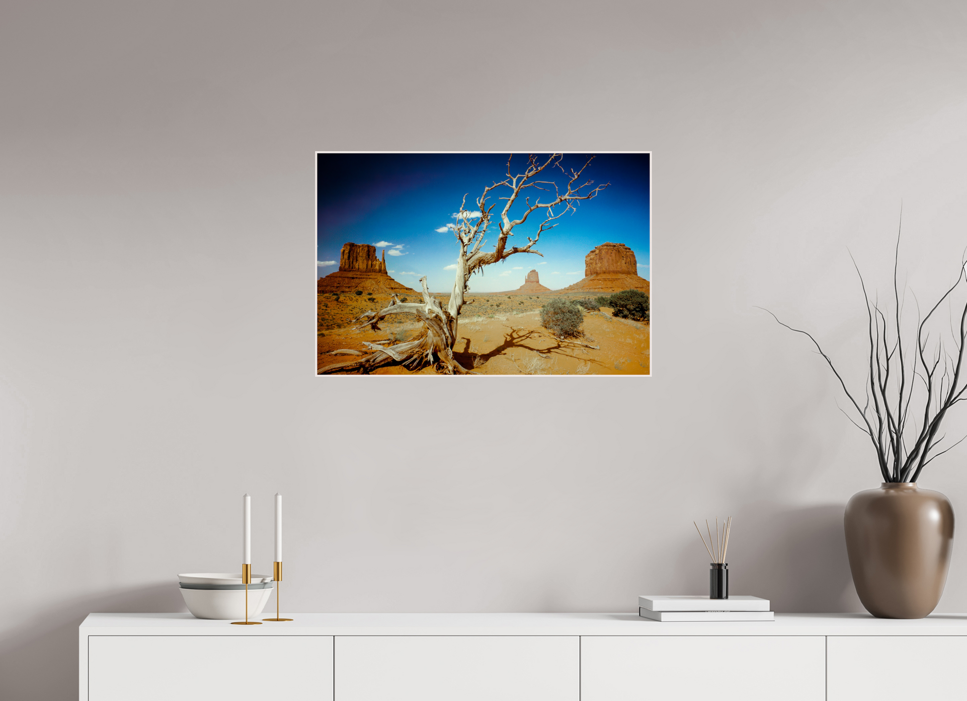 A solitary tree stands amidst the vast desert, its twisted branches reaching towards the sky, framed by majestic rock formations that whisper tales of ancient times.