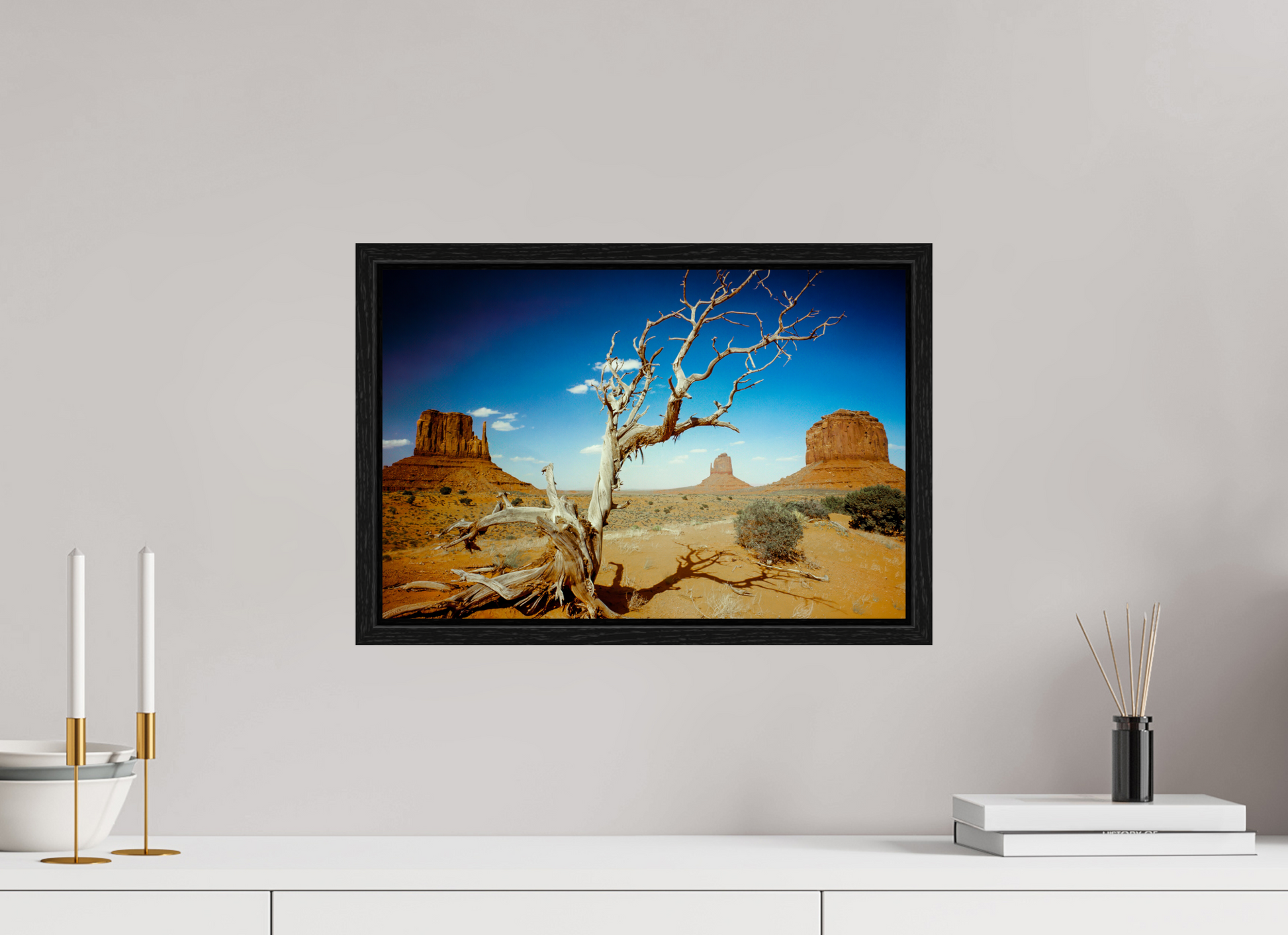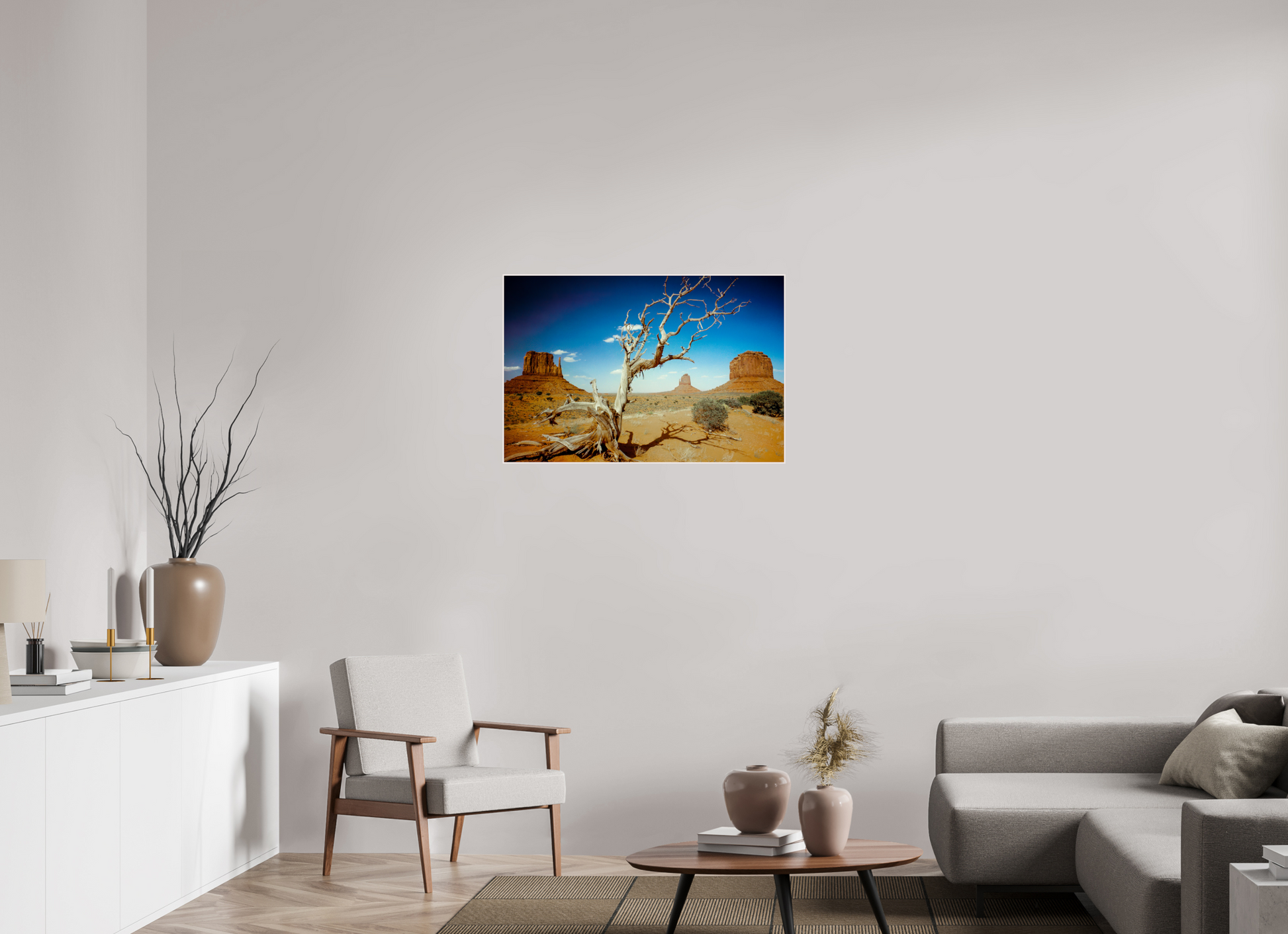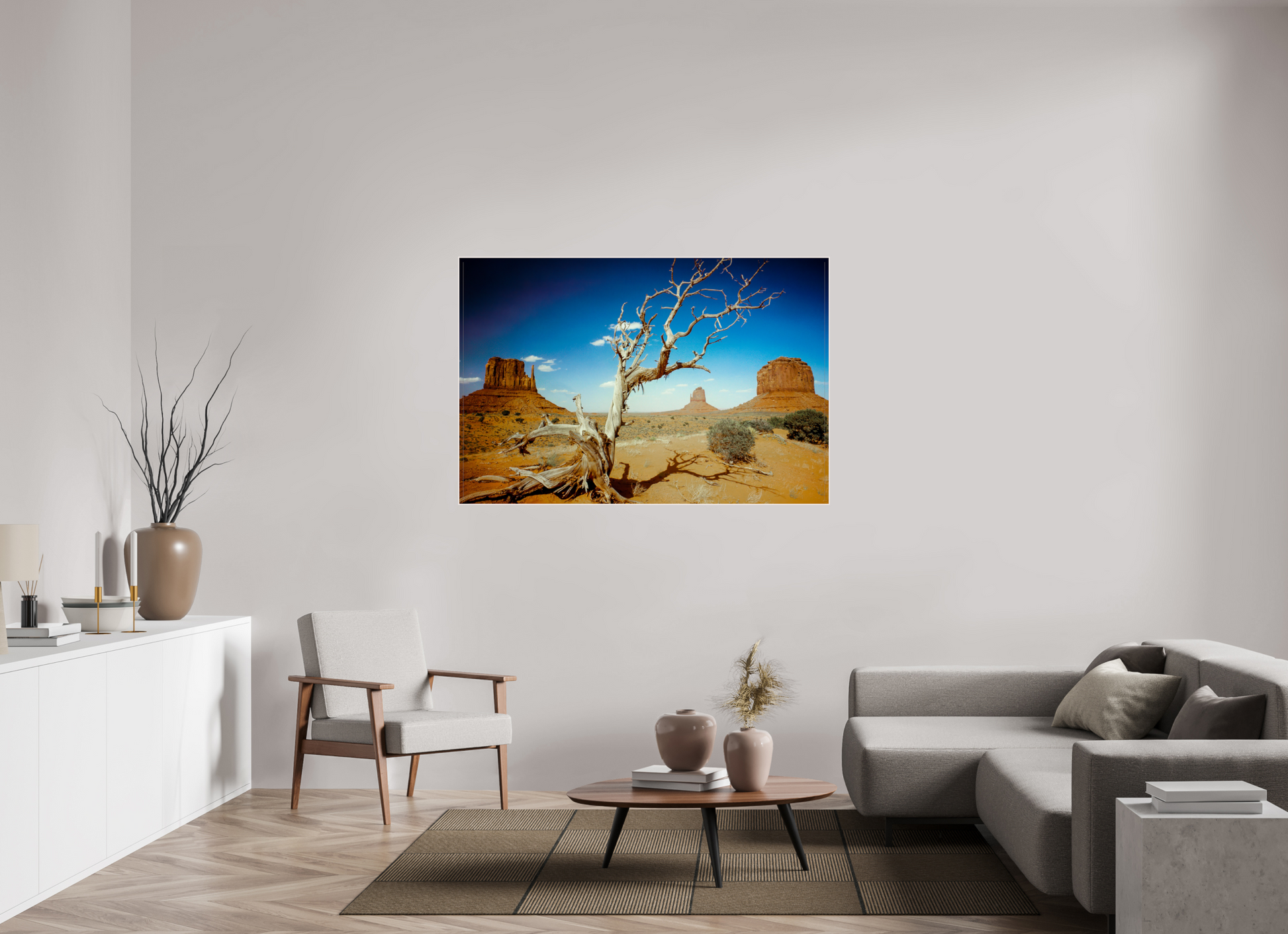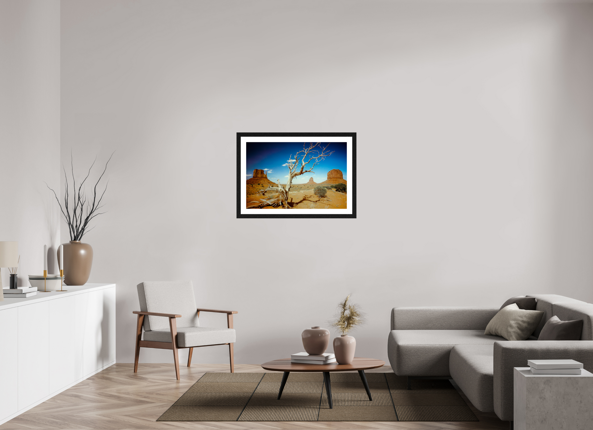 A solitary tree stands amidst the vast desert, its twisted branches reaching towards the sky, framed by majestic rock formations that whisper tales of ancient times.