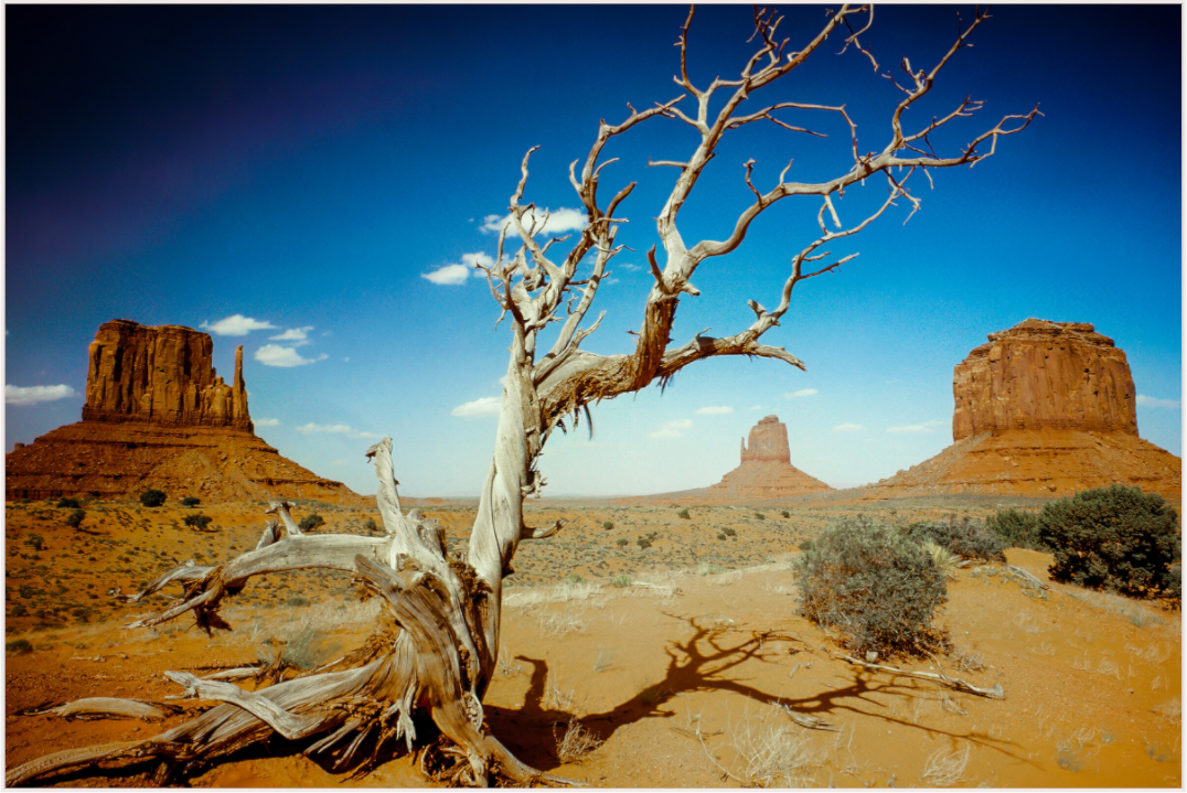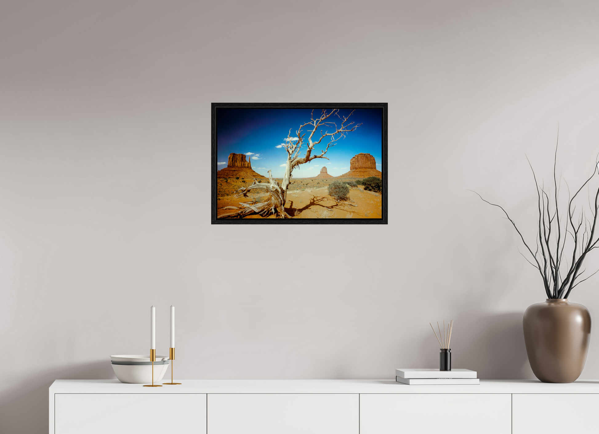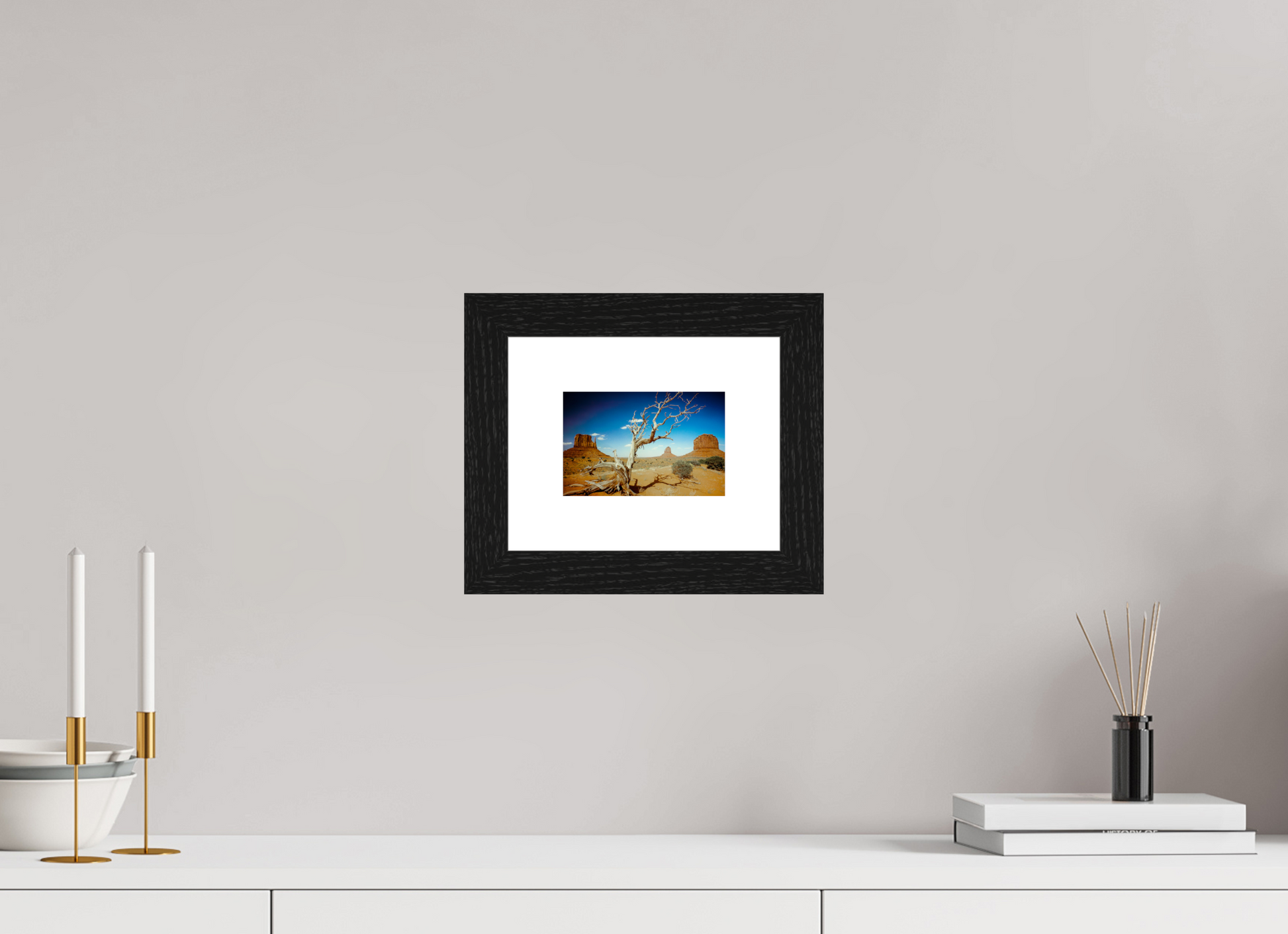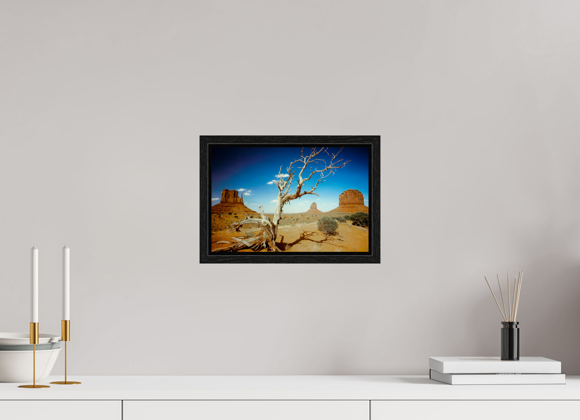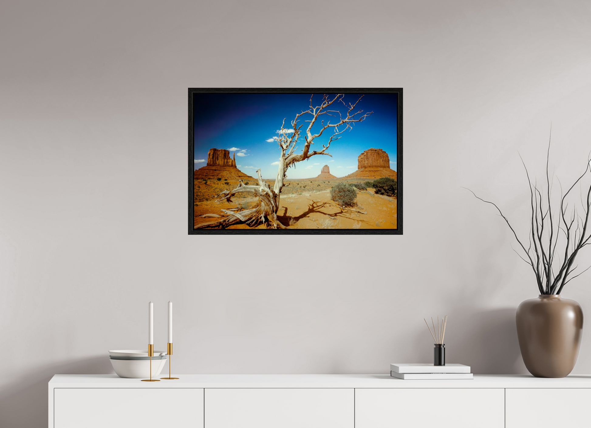 A solitary tree stands amidst the vast desert, its twisted branches reaching towards the sky, framed by majestic rock formations that whisper tales of ancient times.
