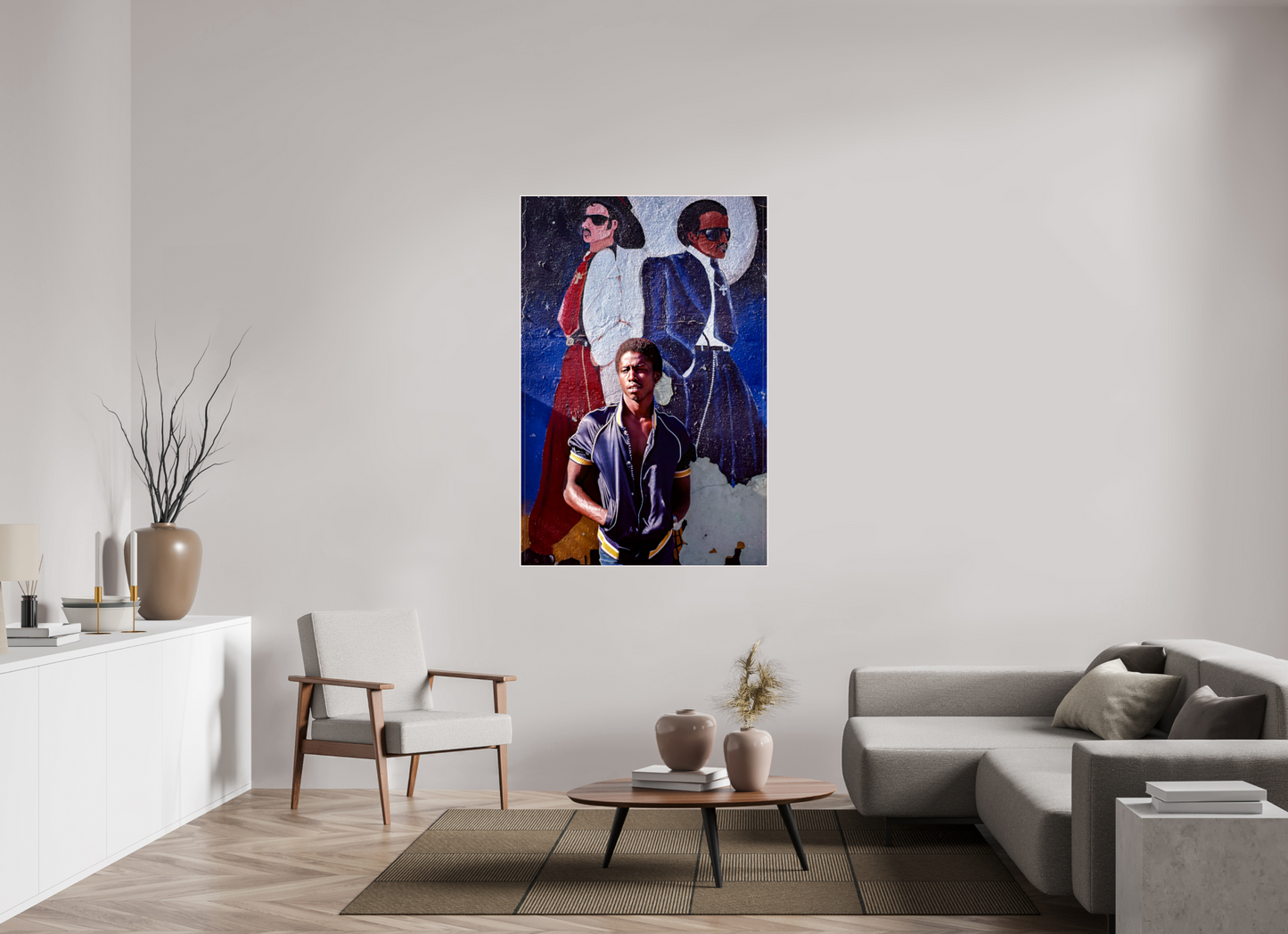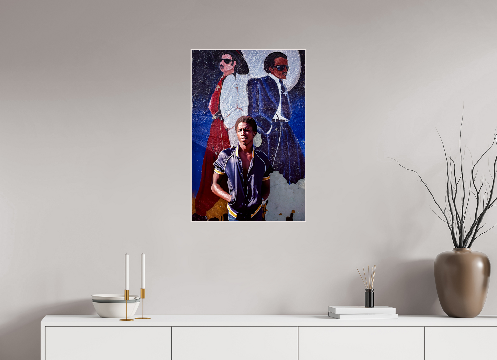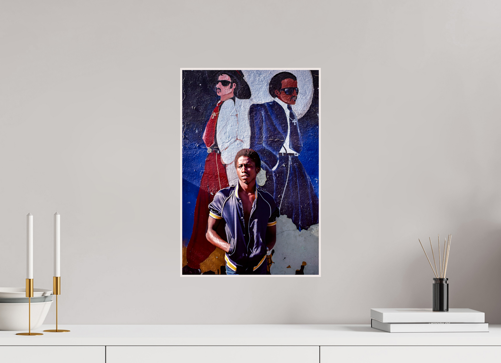 A man stands before a vibrant mural, his presence blending with the colorful depictions of urban life, capturing the dynamic spirit and artistic energy of the city streets