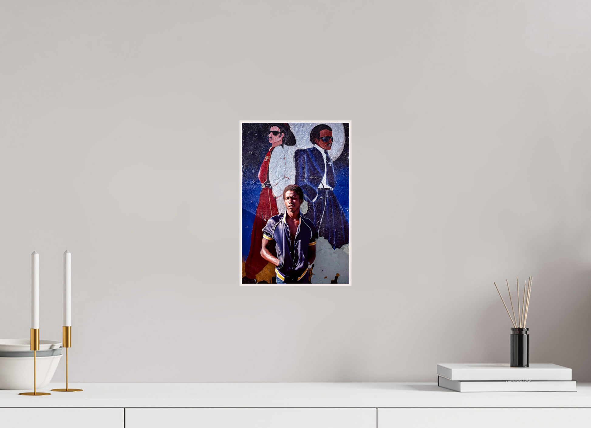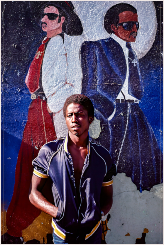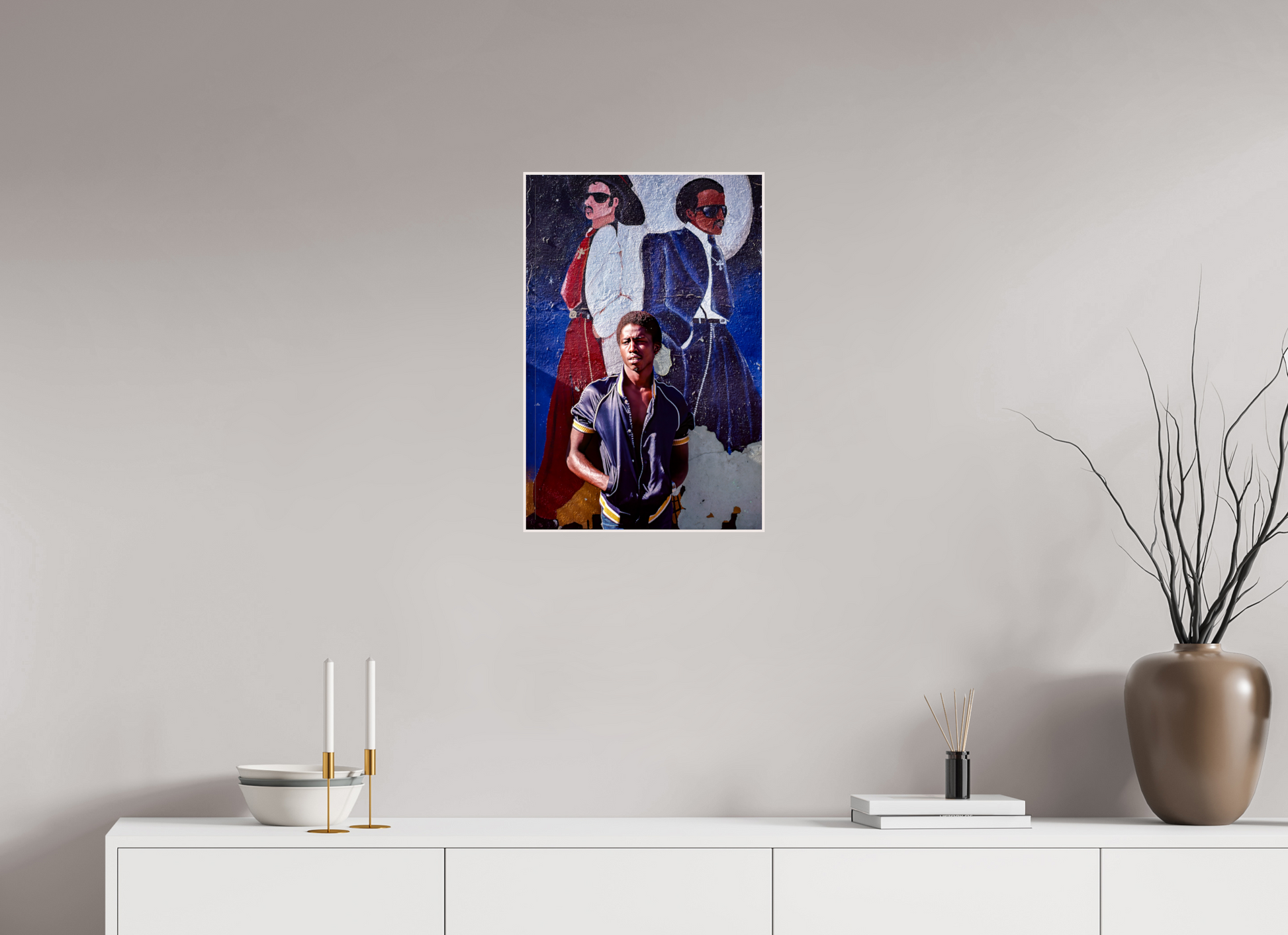 A man stands before a vibrant mural, his presence blending with the colorful depictions of urban life, capturing the dynamic spirit and artistic energy of the city streets