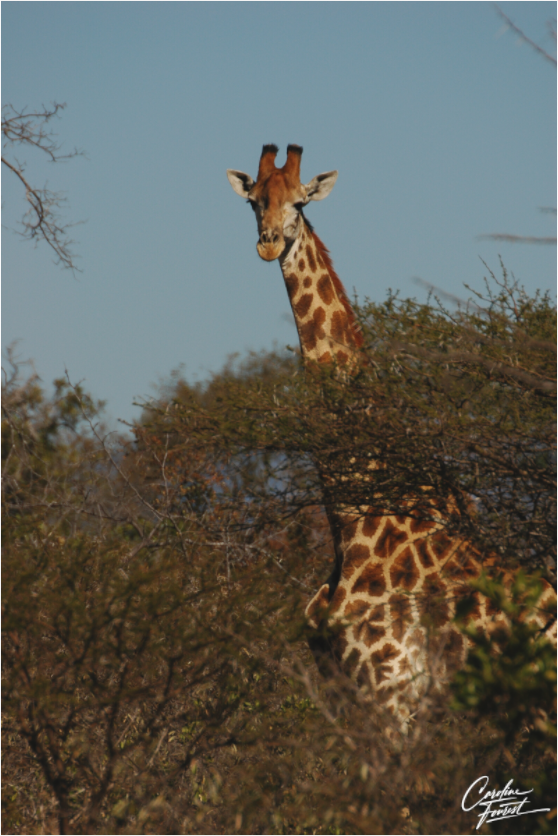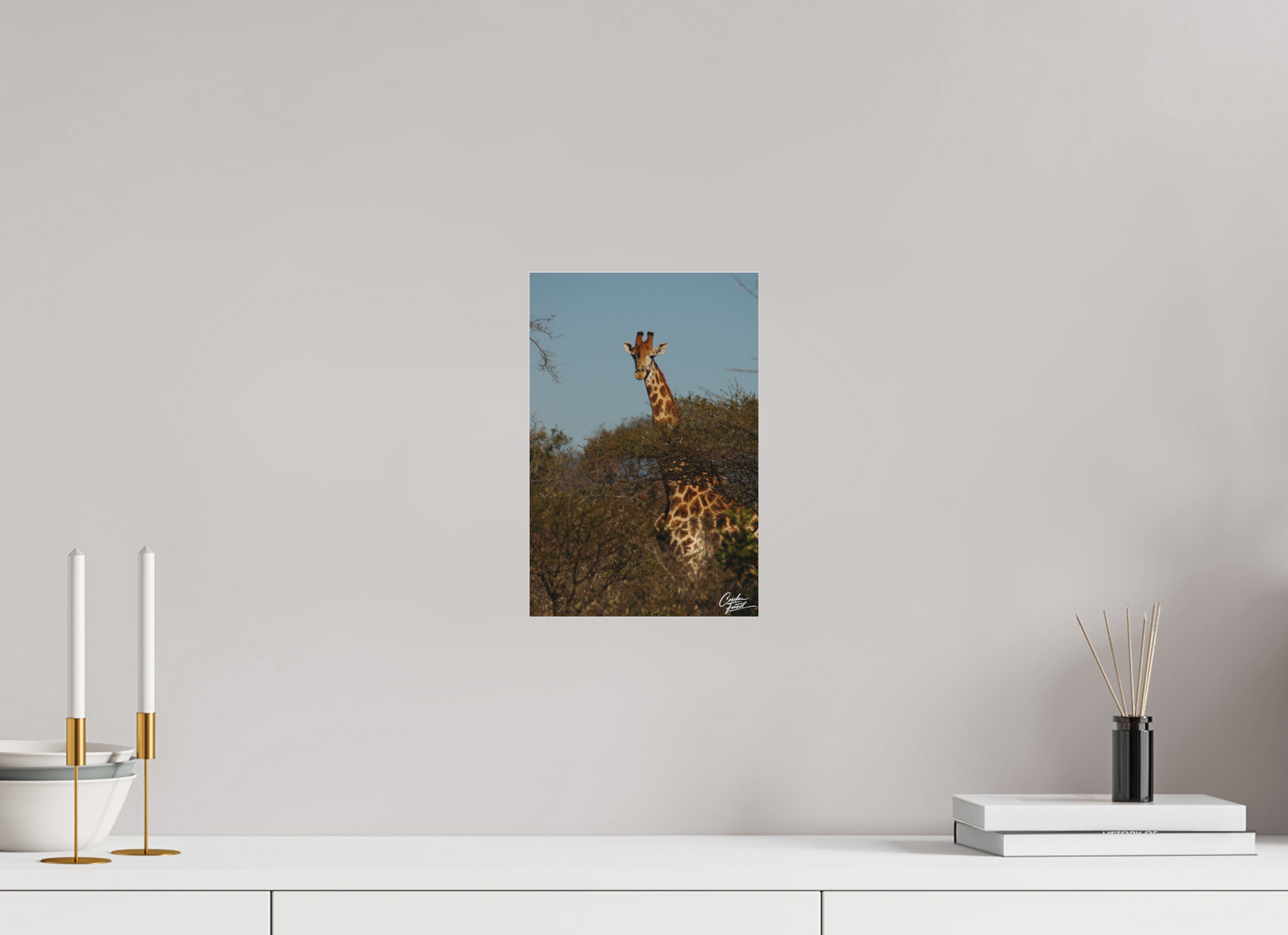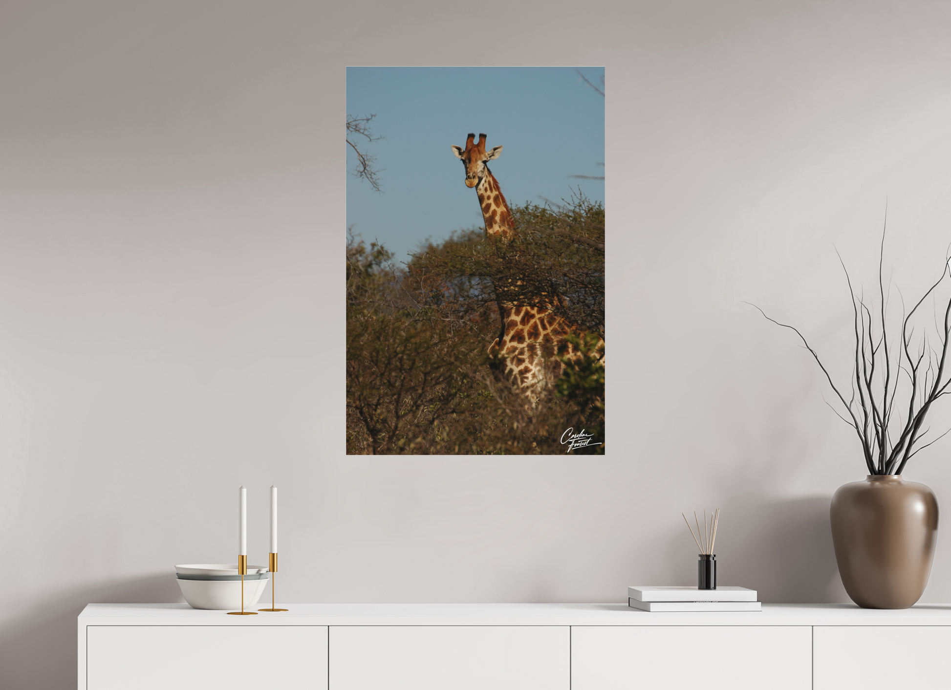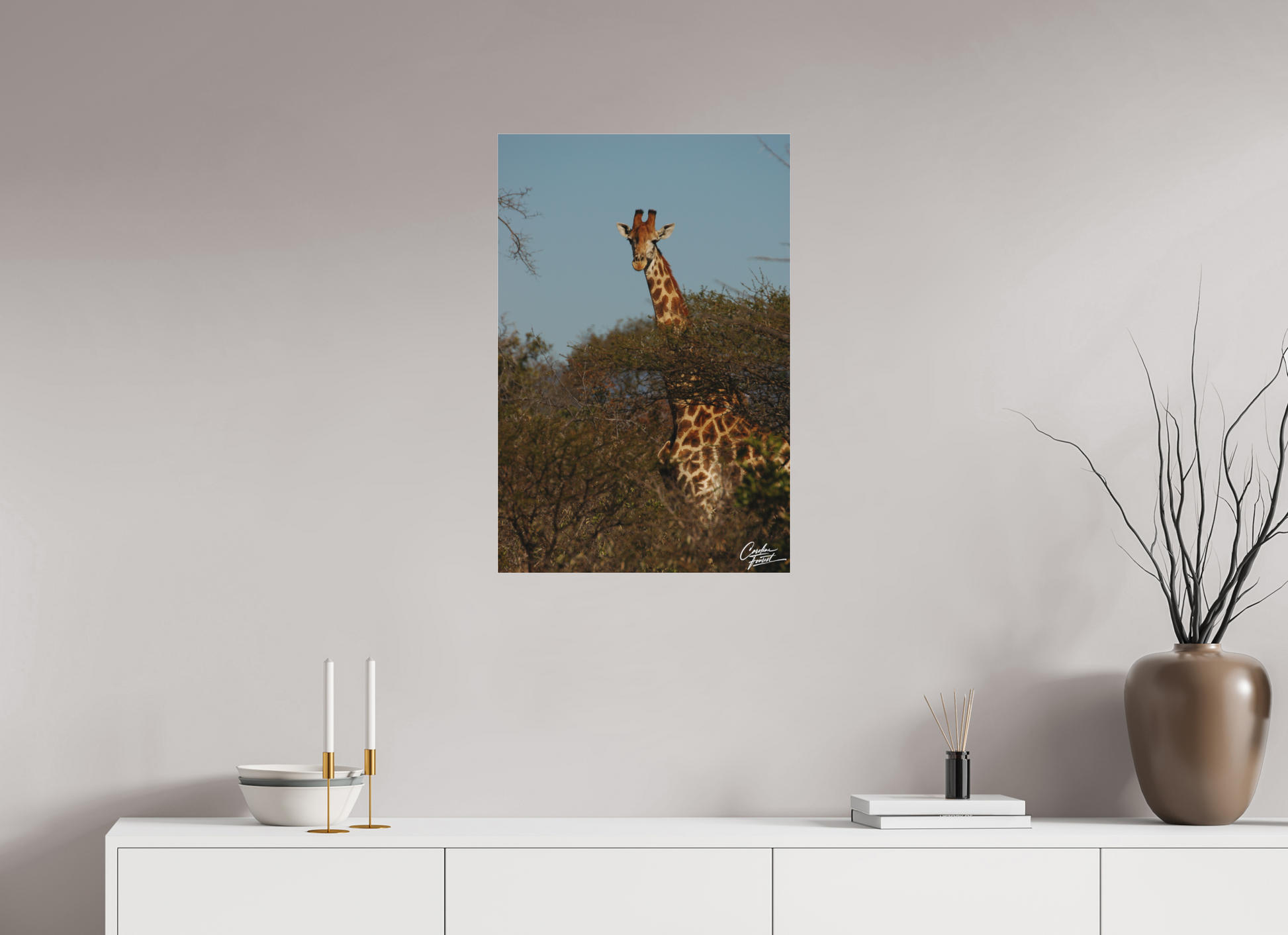A giraffe stands tall among the trees, its elegant form reaching towards the sky in a display of natural grace.