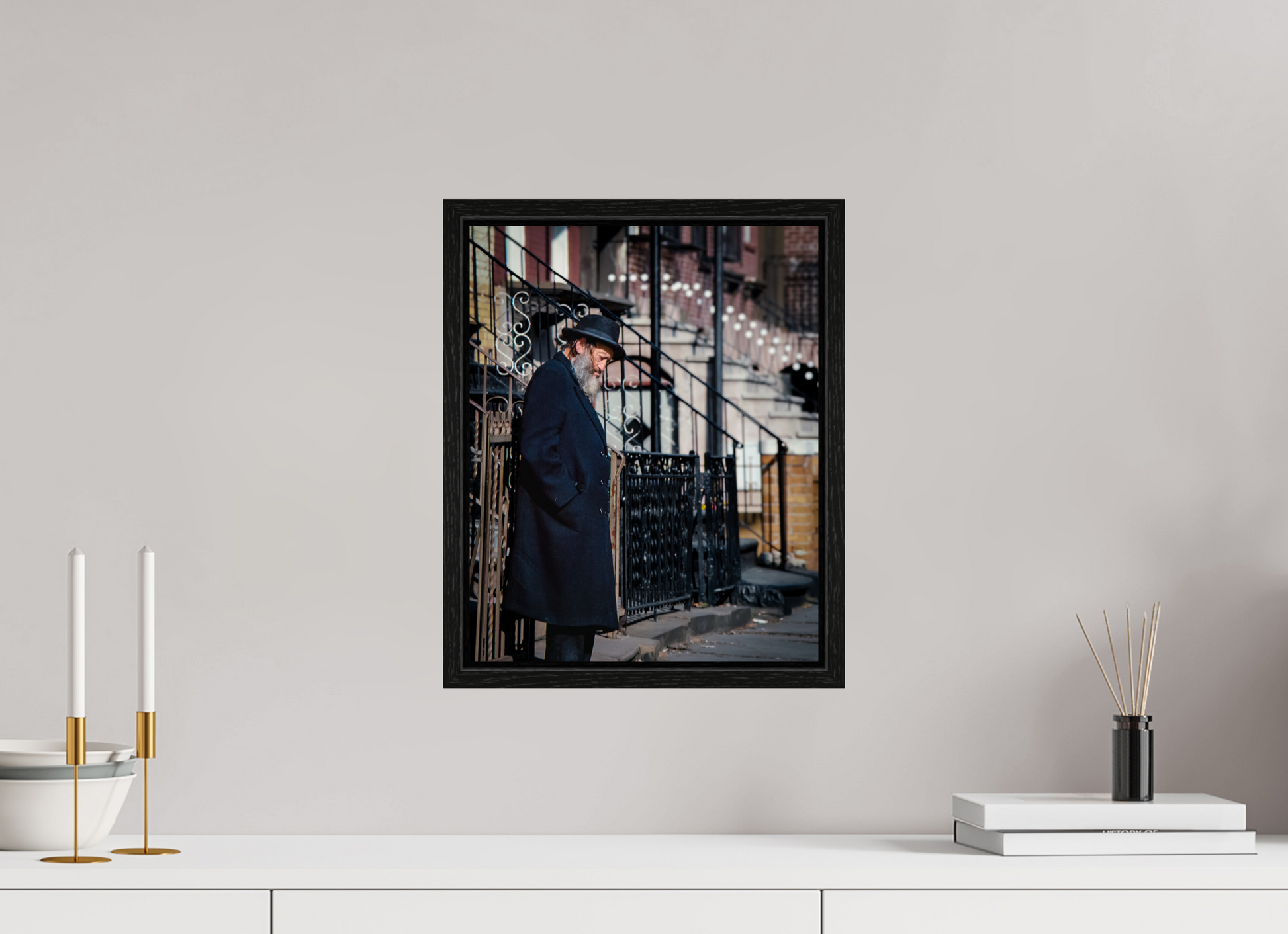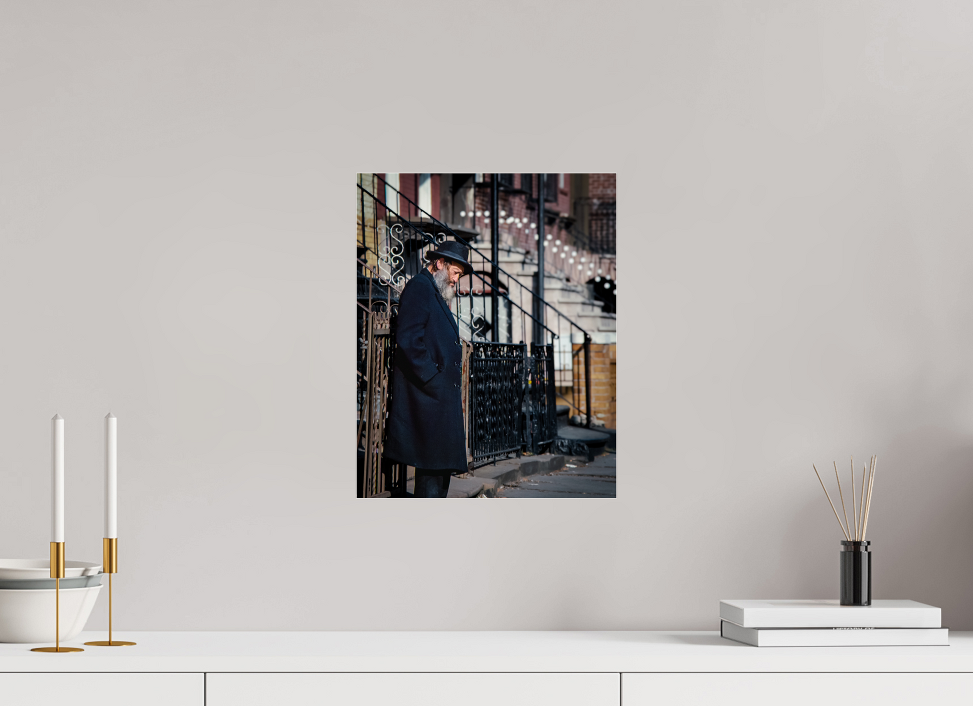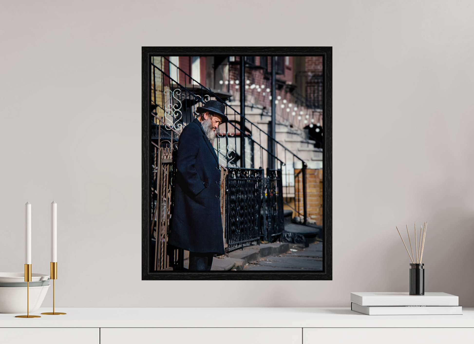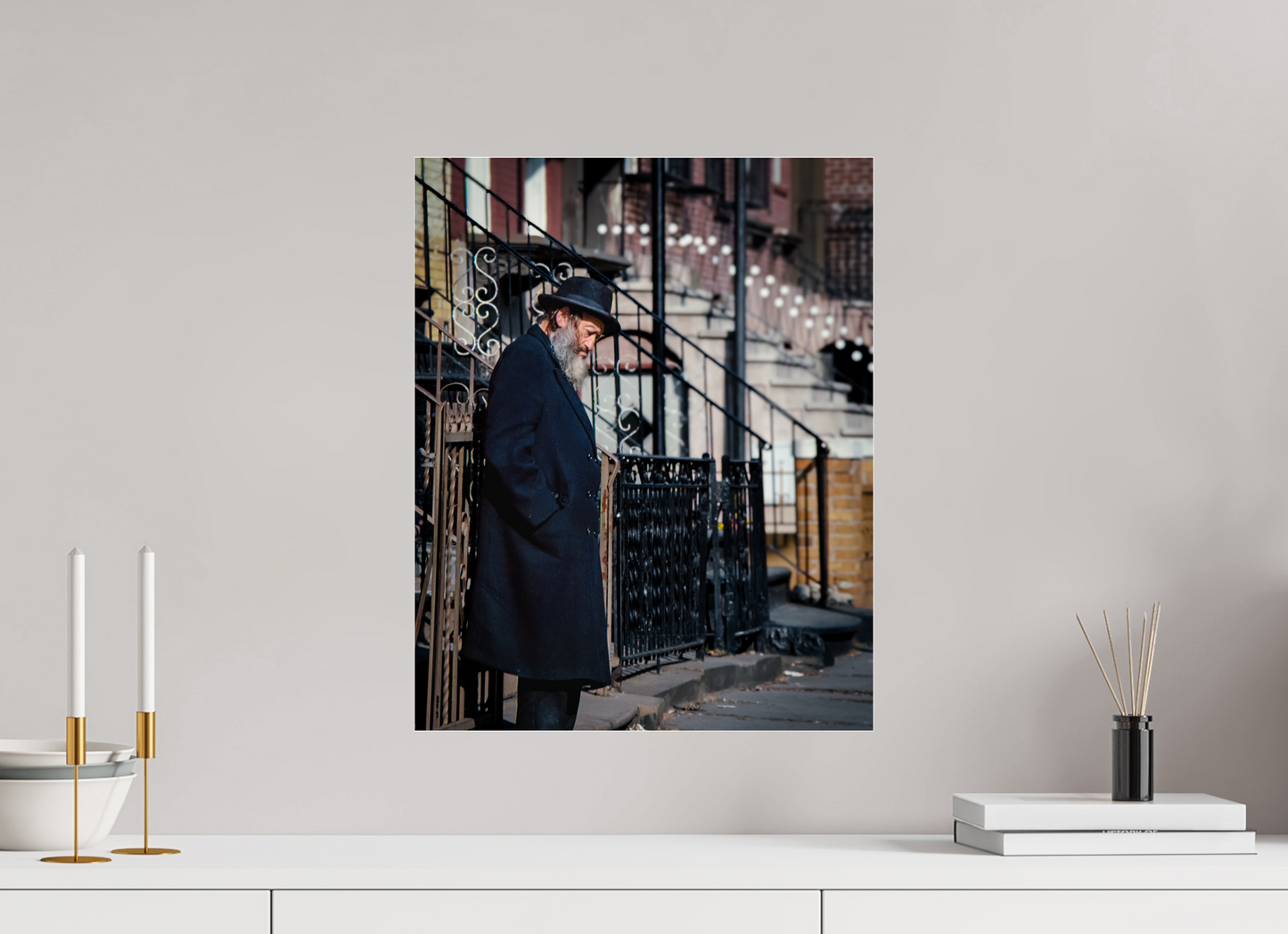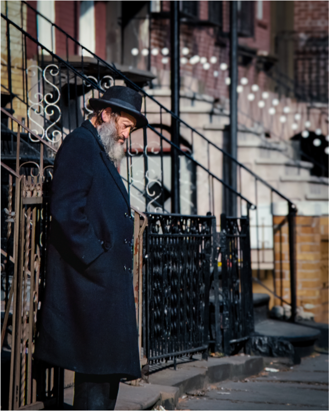 An elderly man stands in quiet reflection, framed by the intricate patterns of urban architecture.